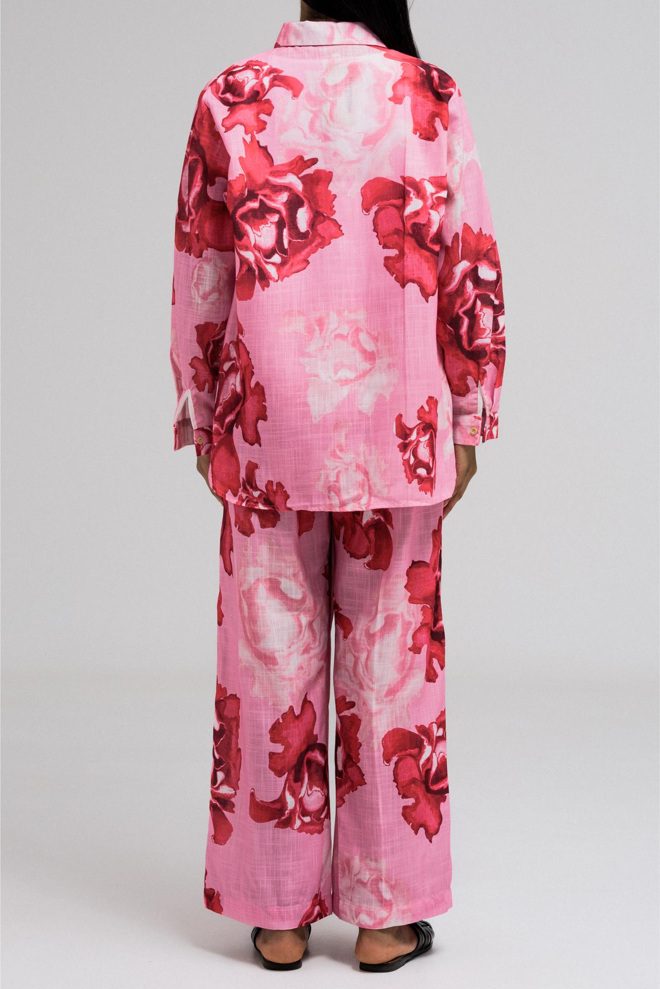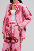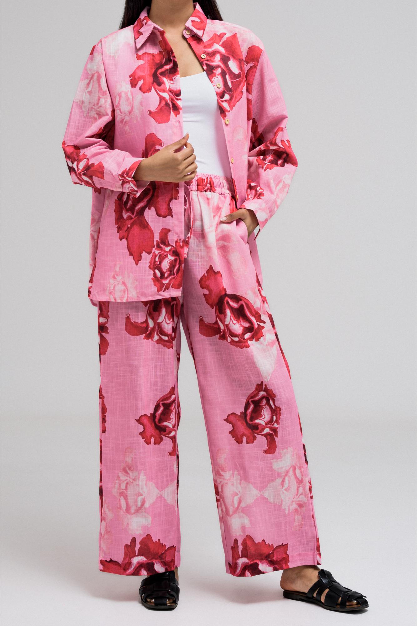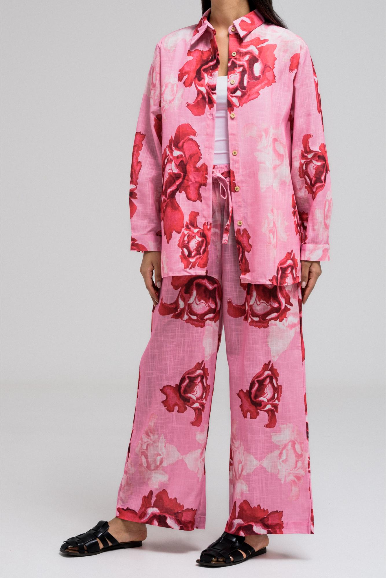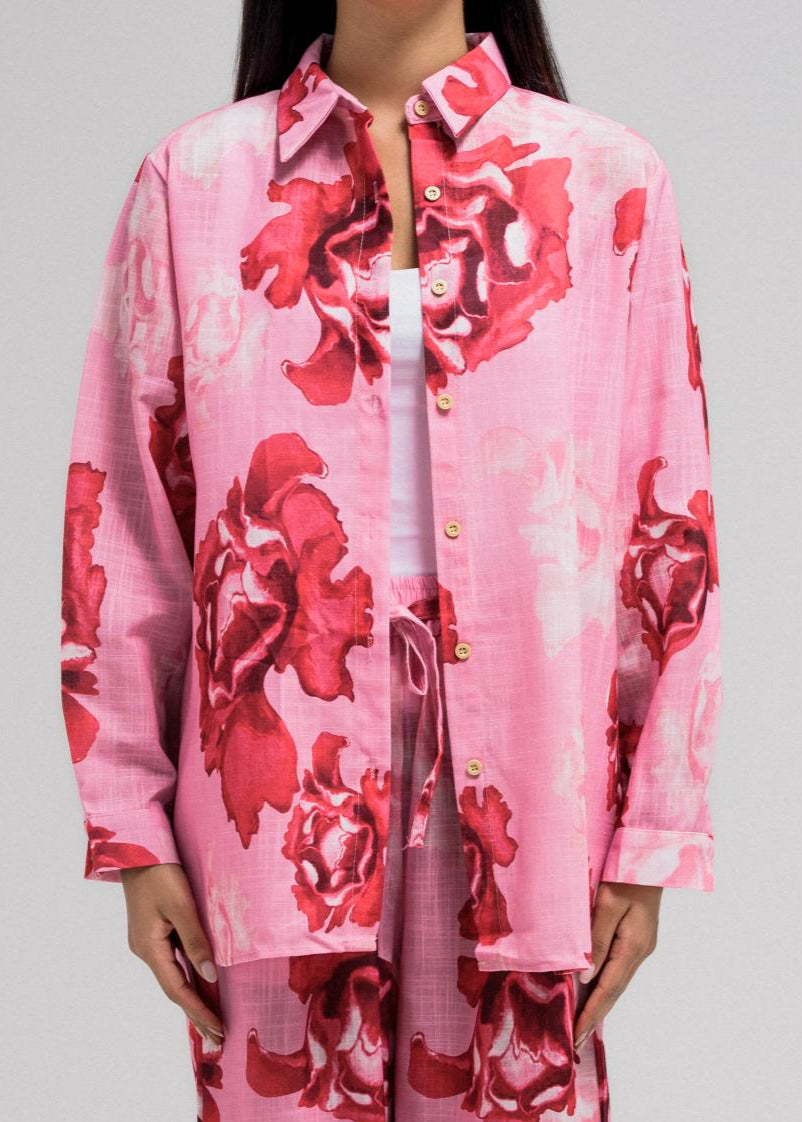 A lightweight linen top featuring bold red floral prints on a soft pink base. Designed with a classic collar and front button closure, this piece offers a relaxed yet elegant look. Perfectly paired with the matching floral pants for a chic coordinated outfit.