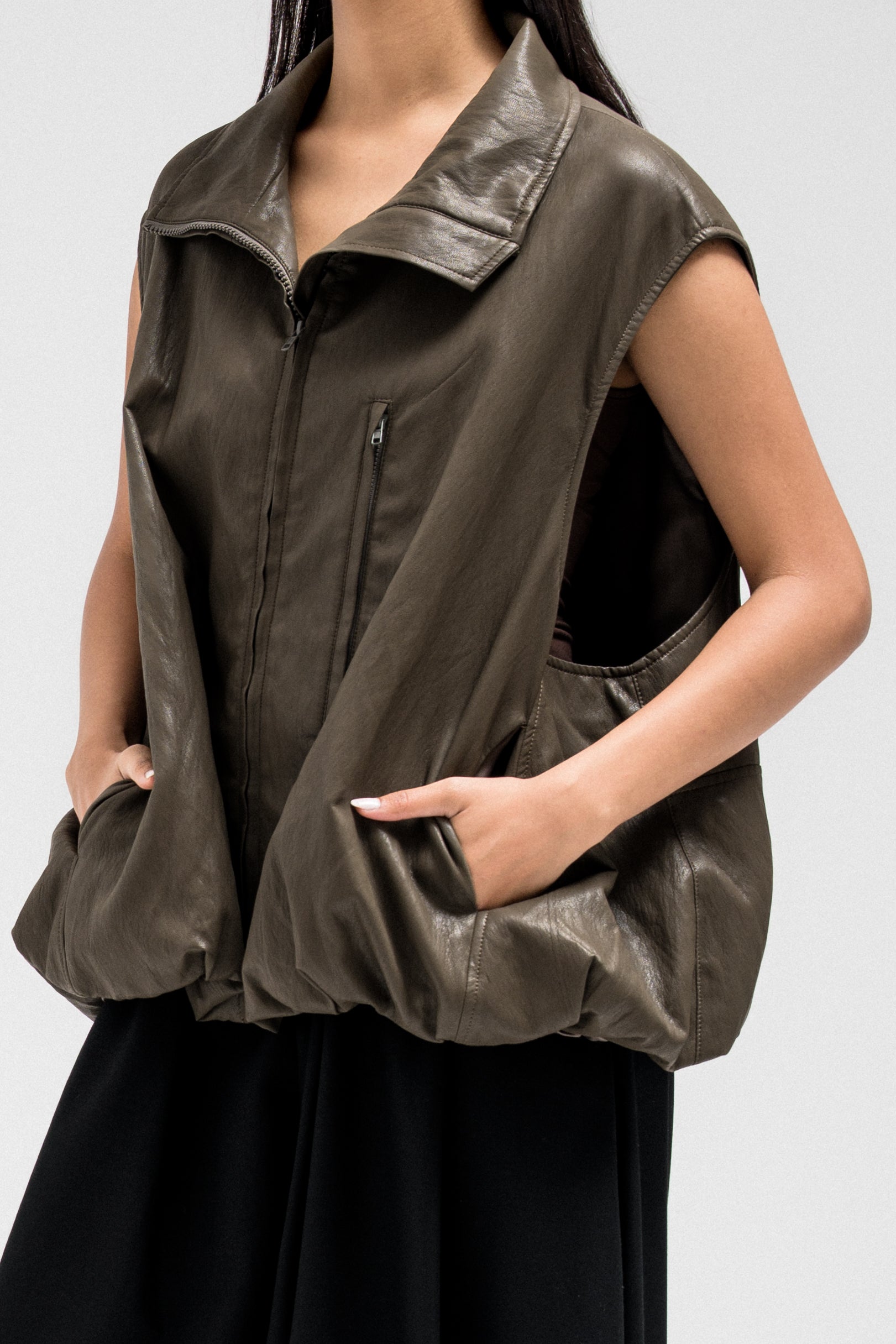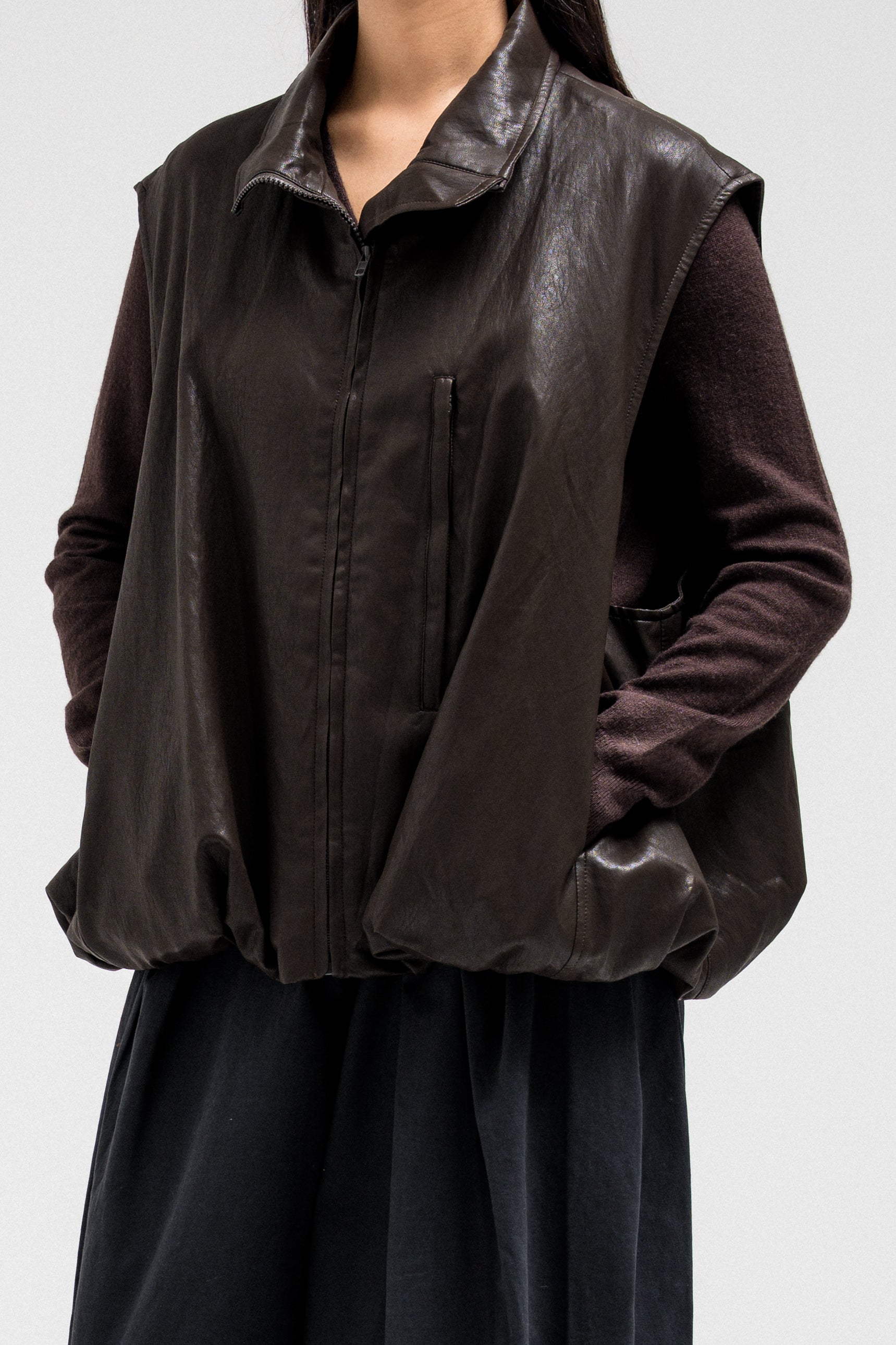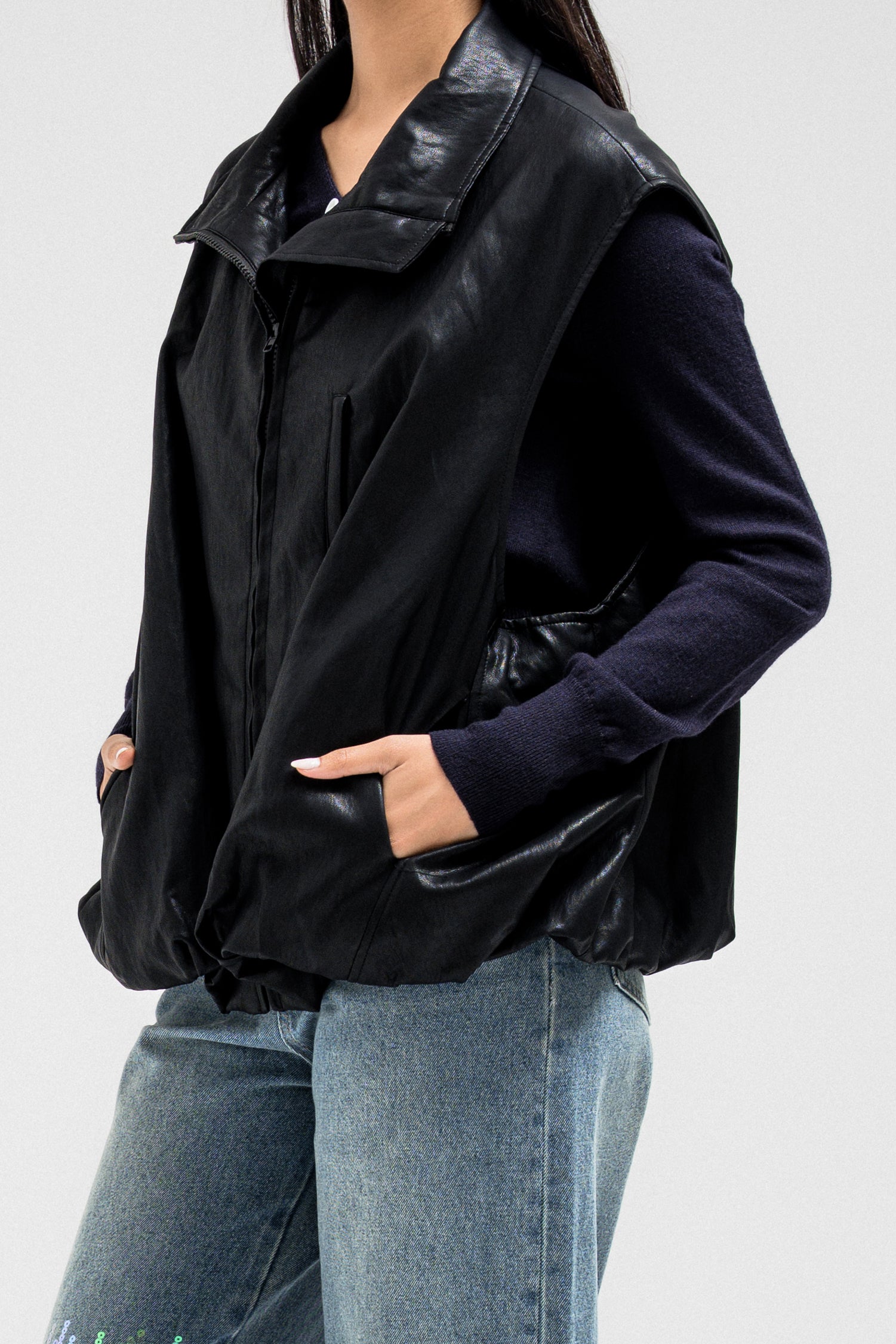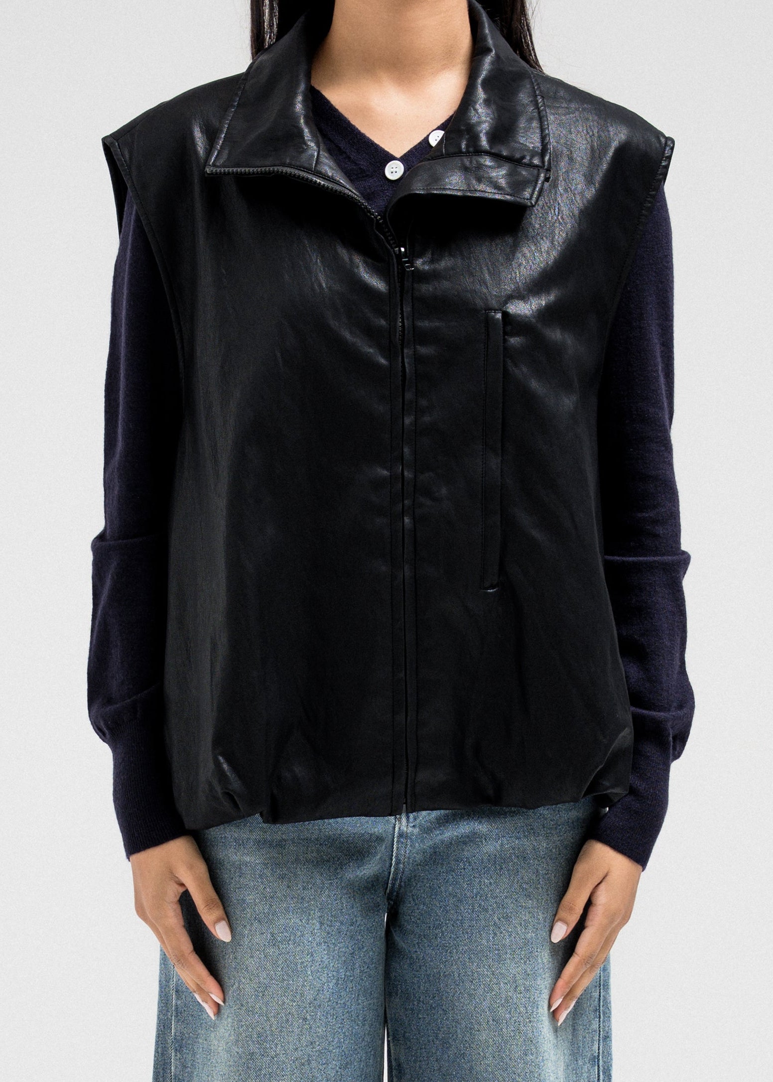 Sleek leather vest featuring a structured high collar and front zipper closure. Designed with a slightly puffy hem for a modern silhouette and finished with practical side pockets.