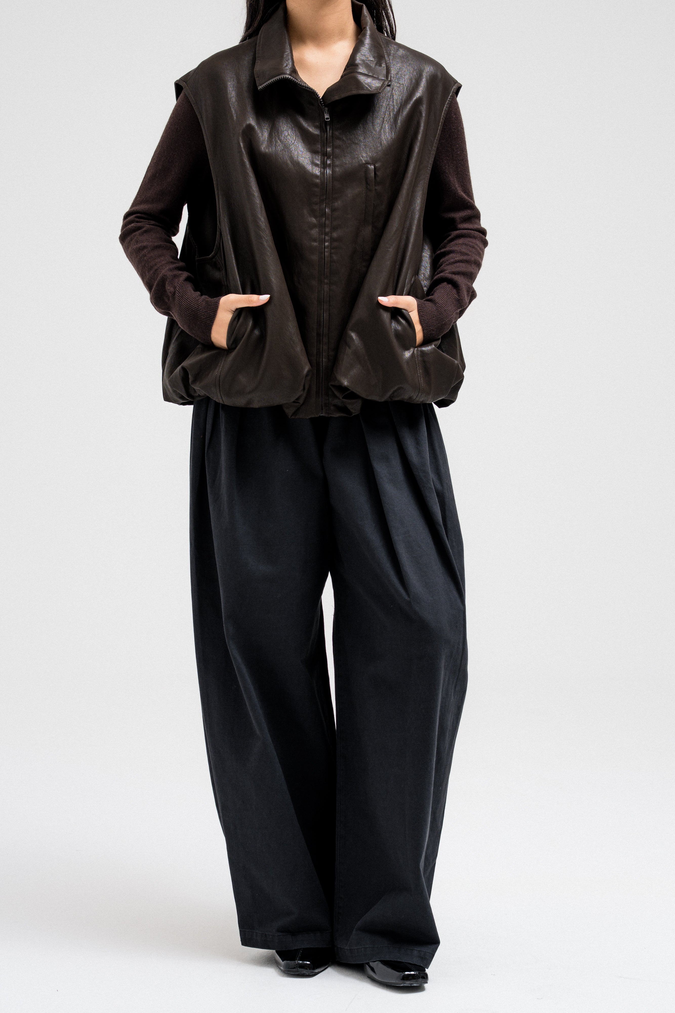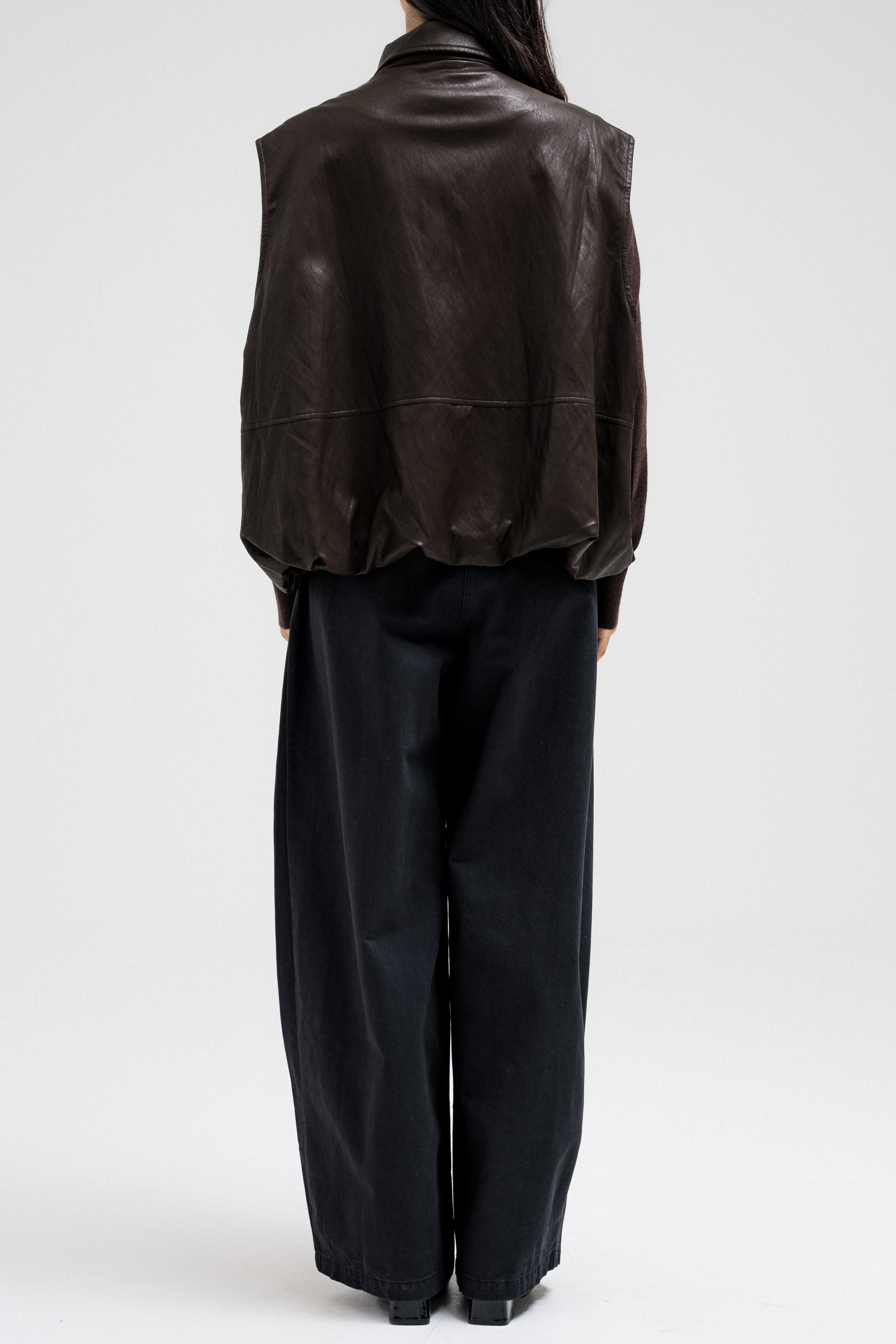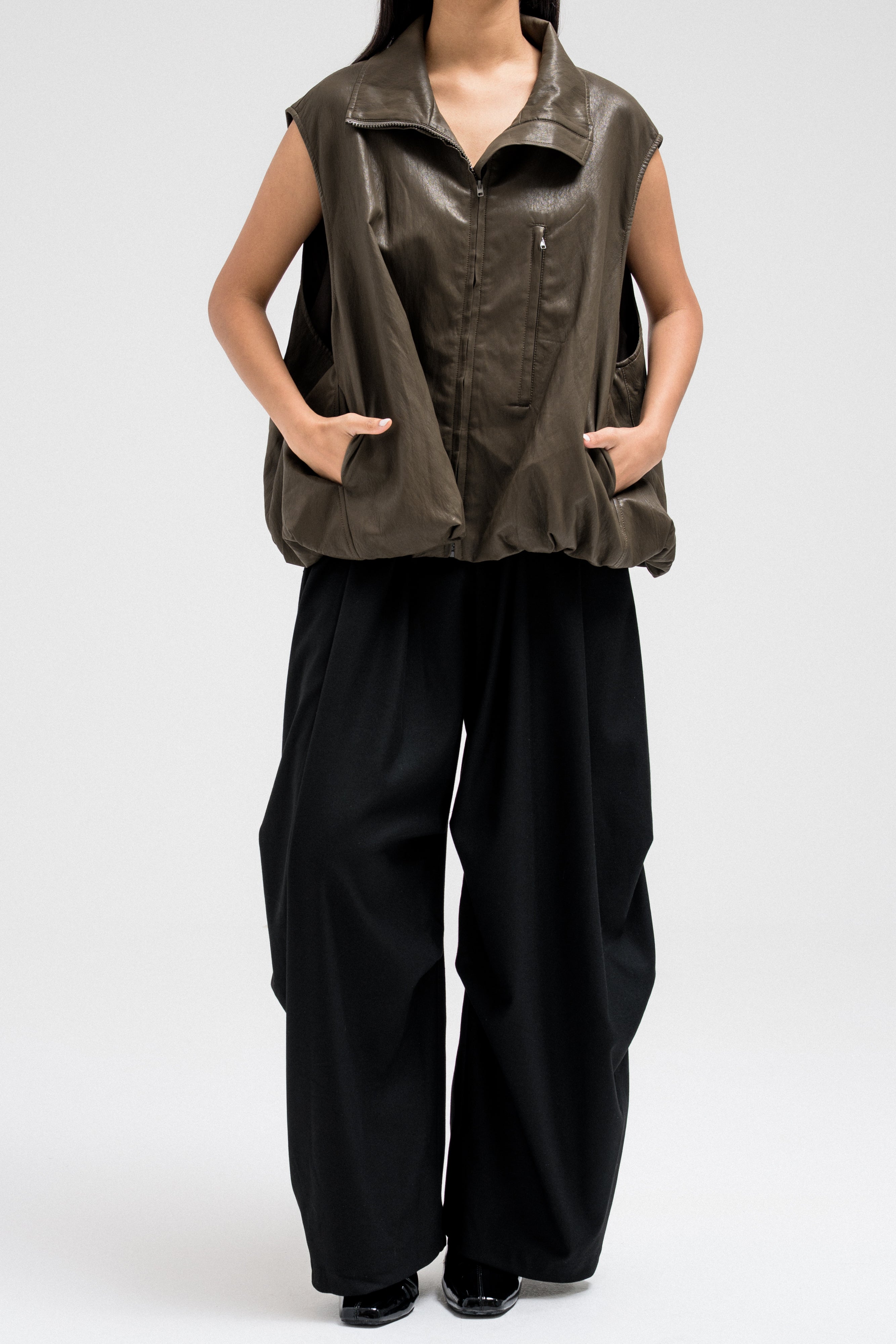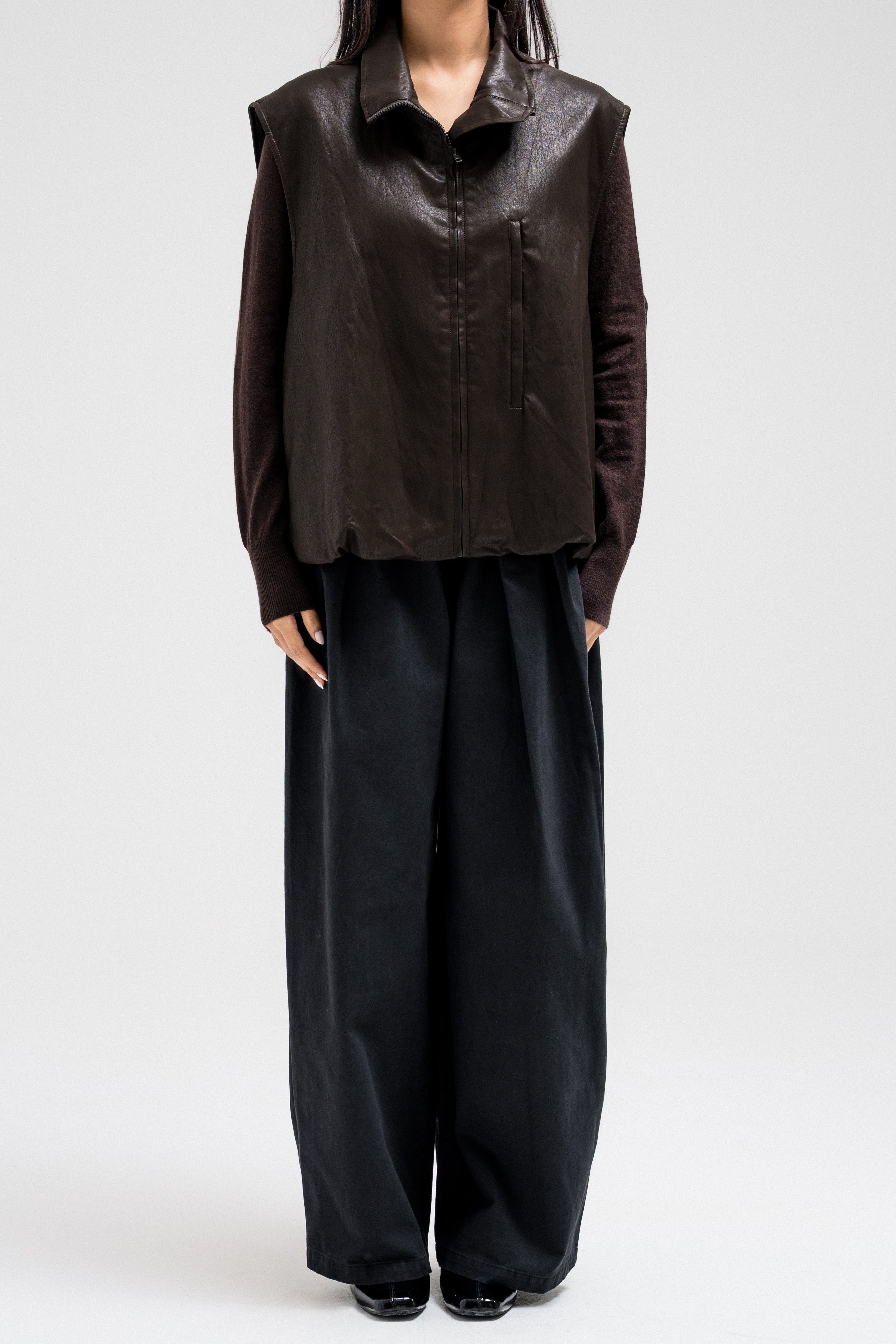 Sleek leather vest featuring a structured high collar and front zipper closure. Designed with a slightly puffy hem for a modern silhouette and finished with practical side pockets.
