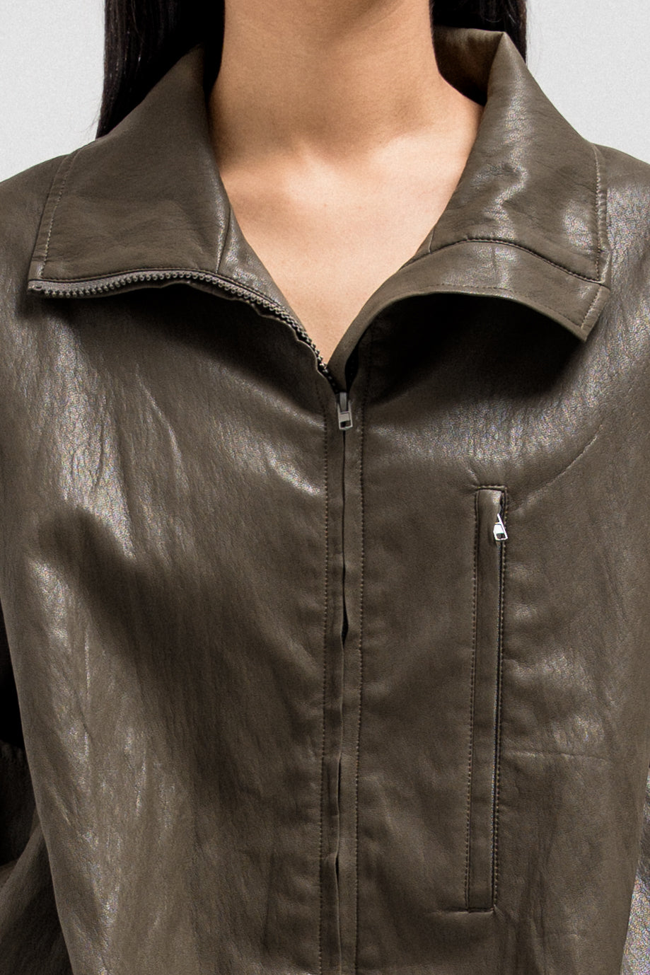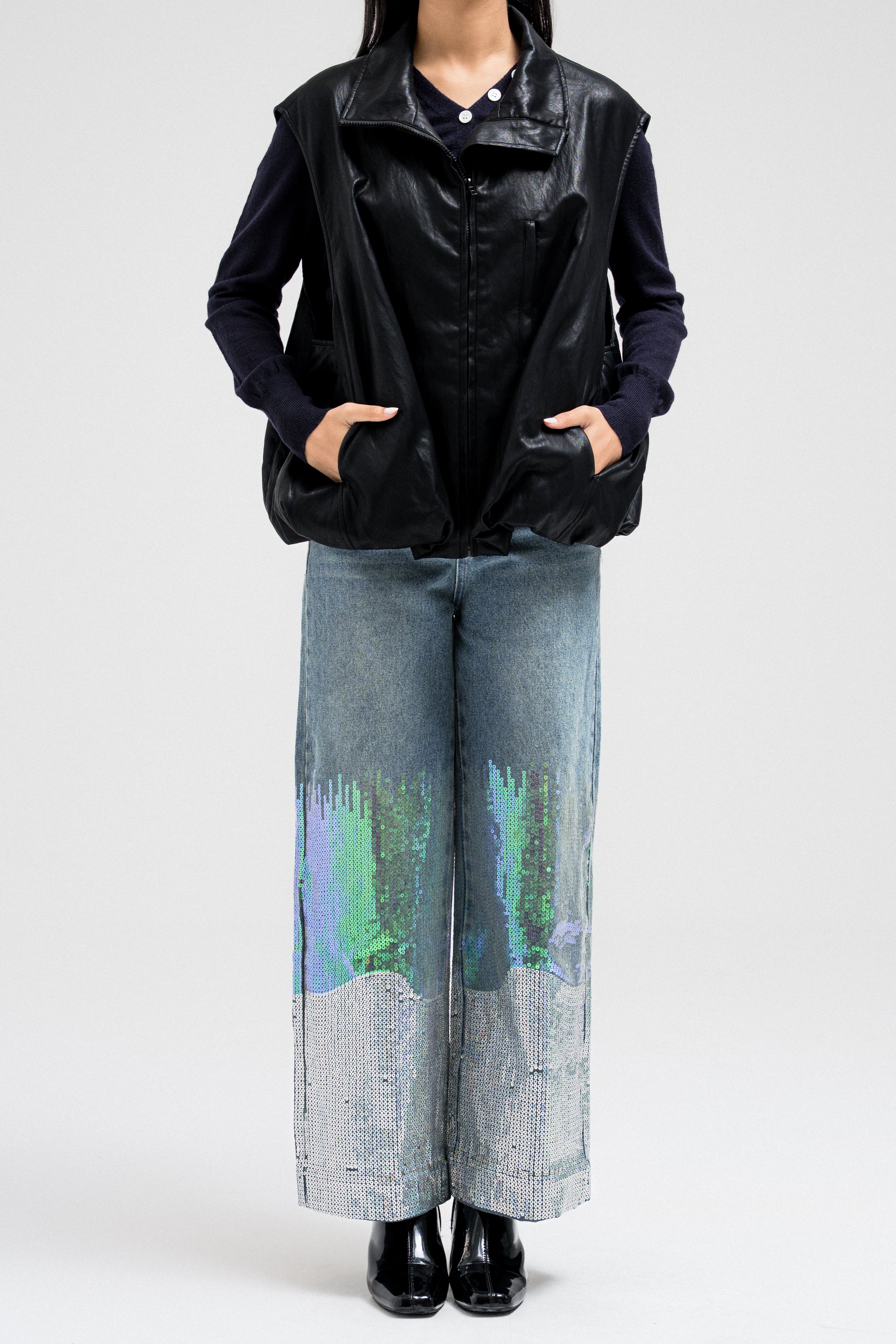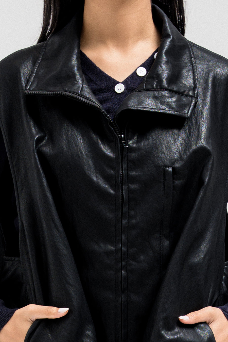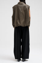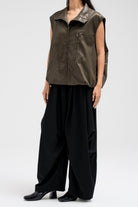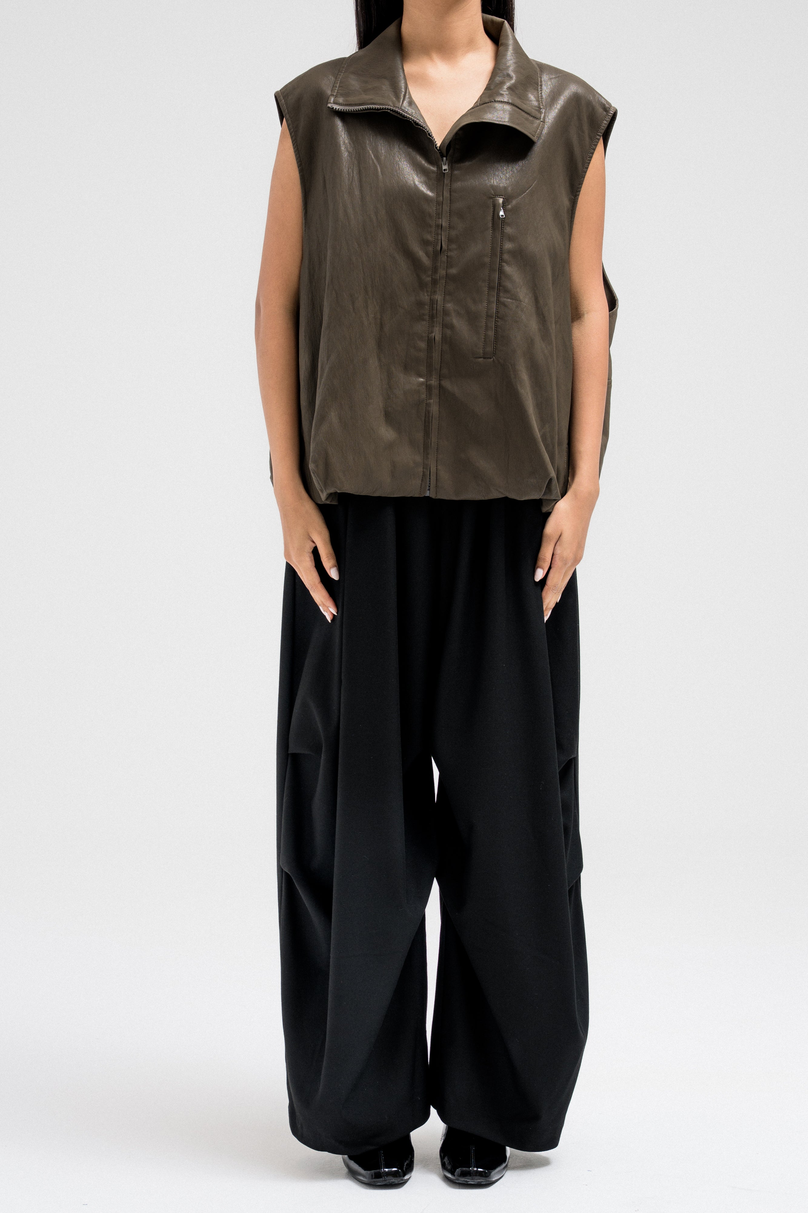 Sleek leather vest featuring a structured high collar and front zipper closure. Designed with a slightly puffy hem for a modern silhouette and finished with practical side pockets.