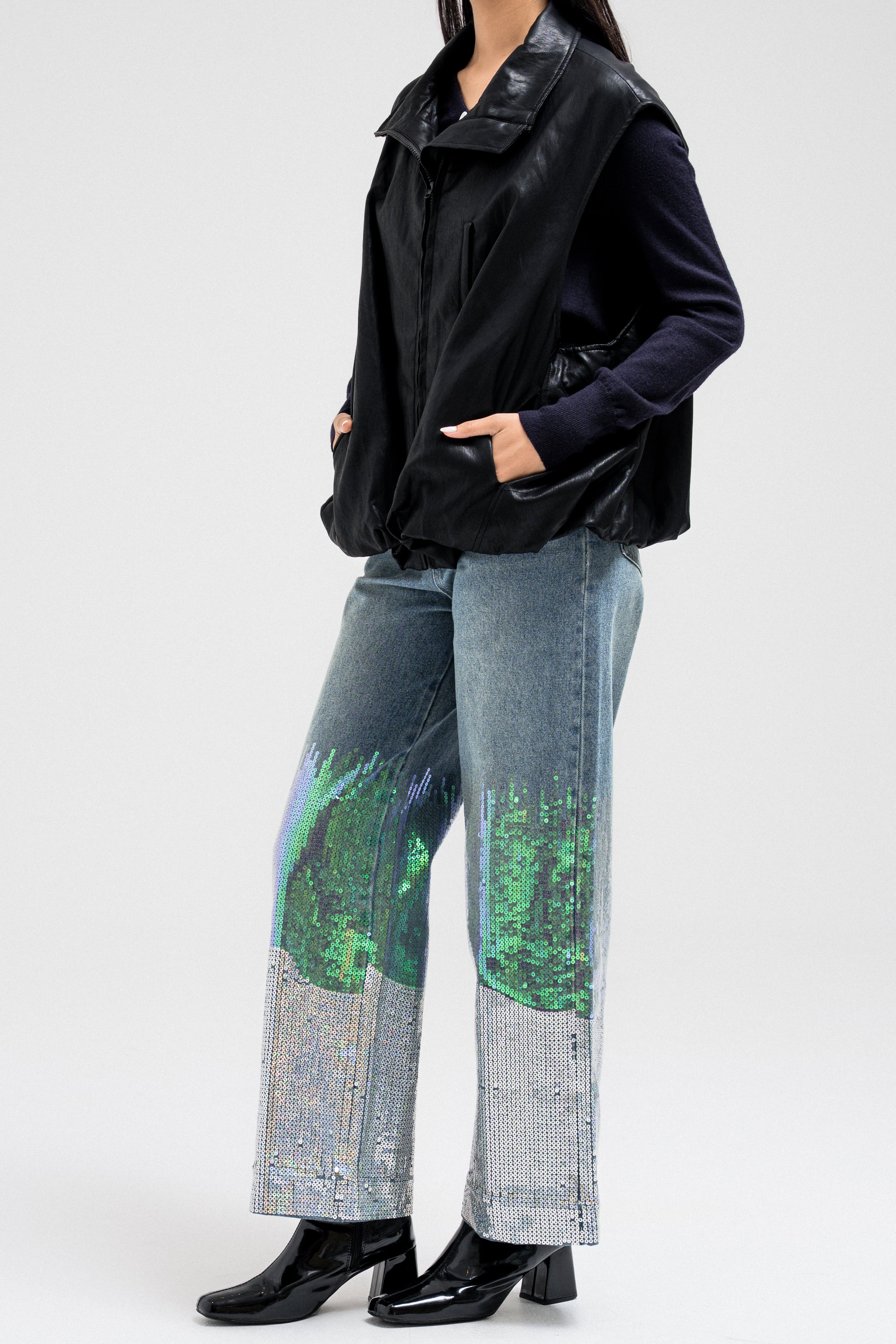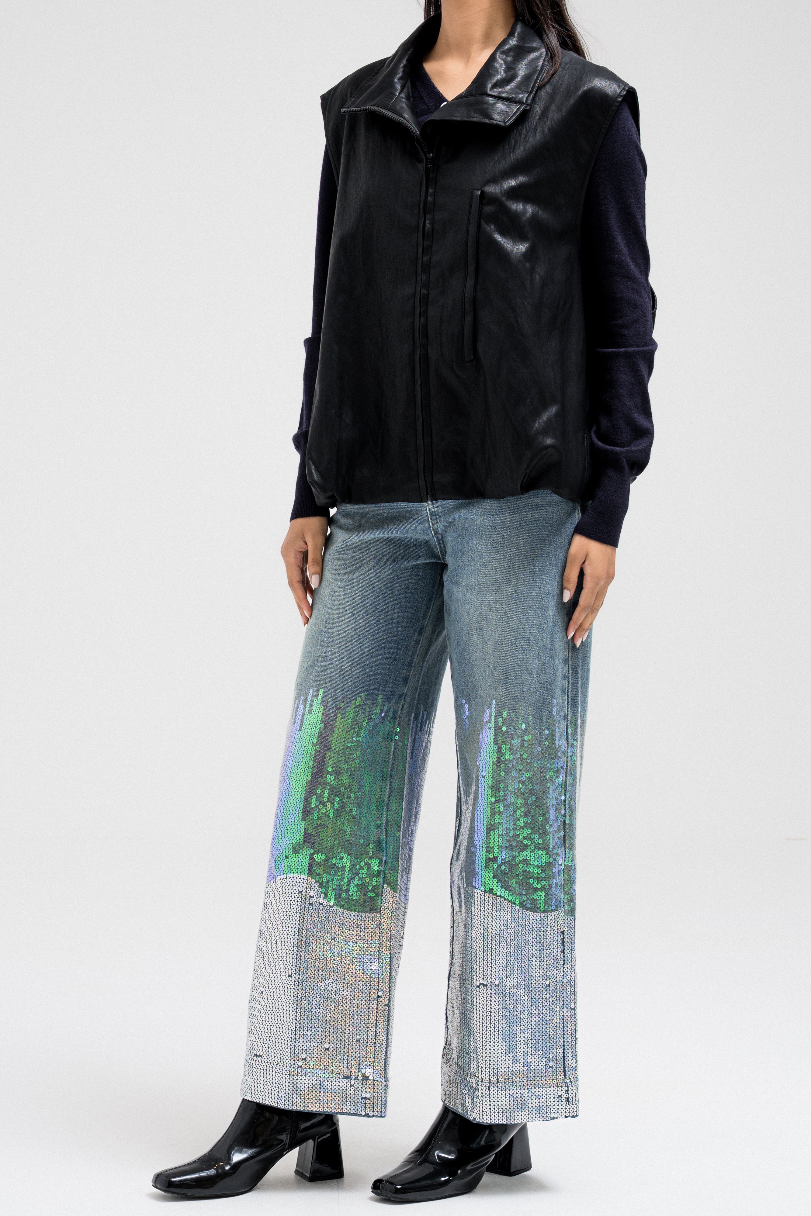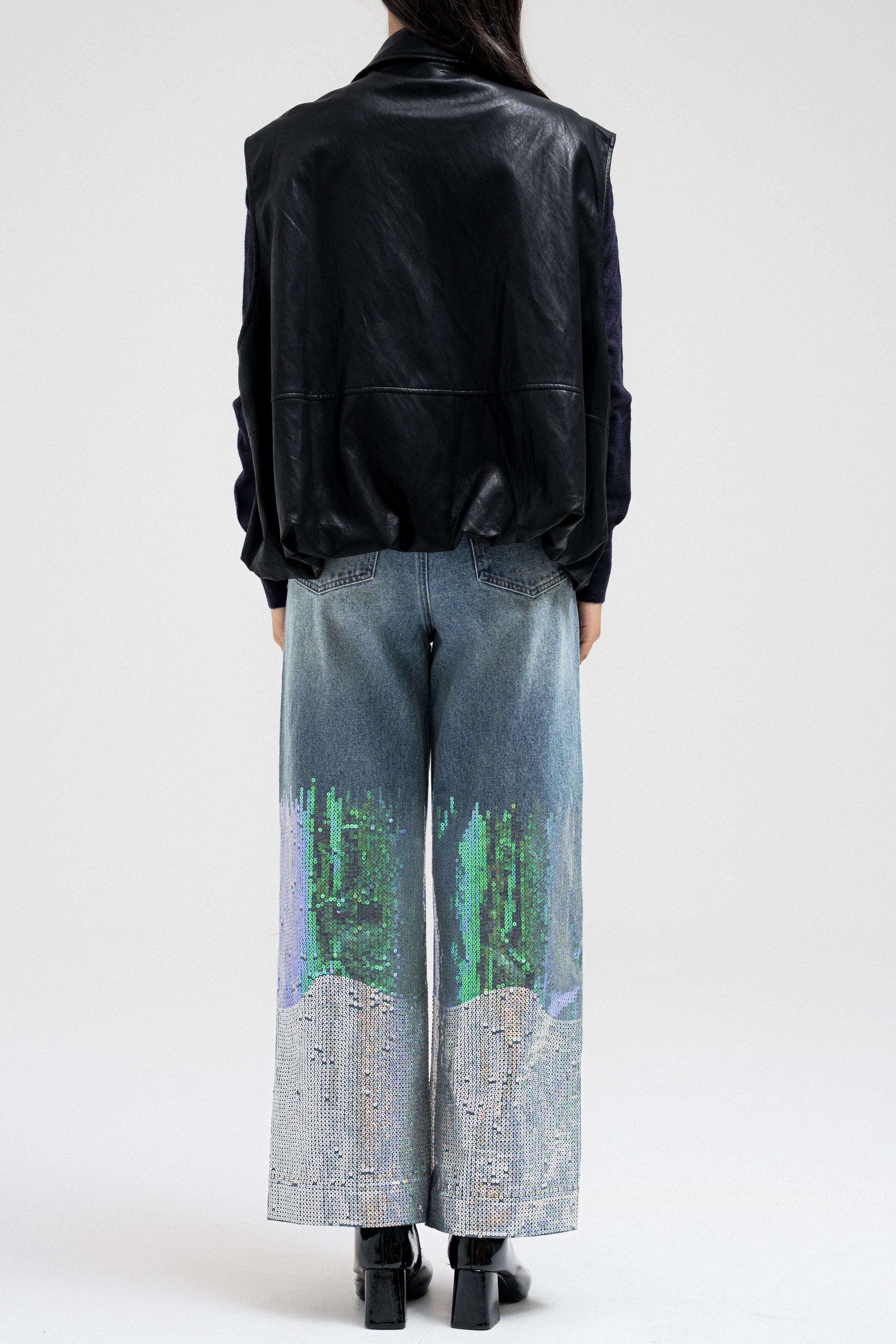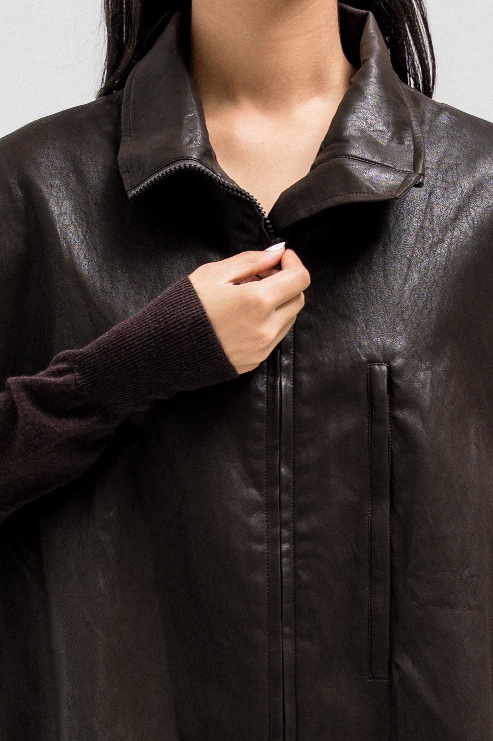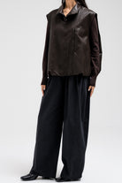 Sleek leather vest featuring a structured high collar and front zipper closure. Designed with a slightly puffy hem for a modern silhouette and finished with practical side pockets.
