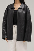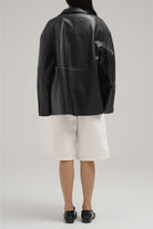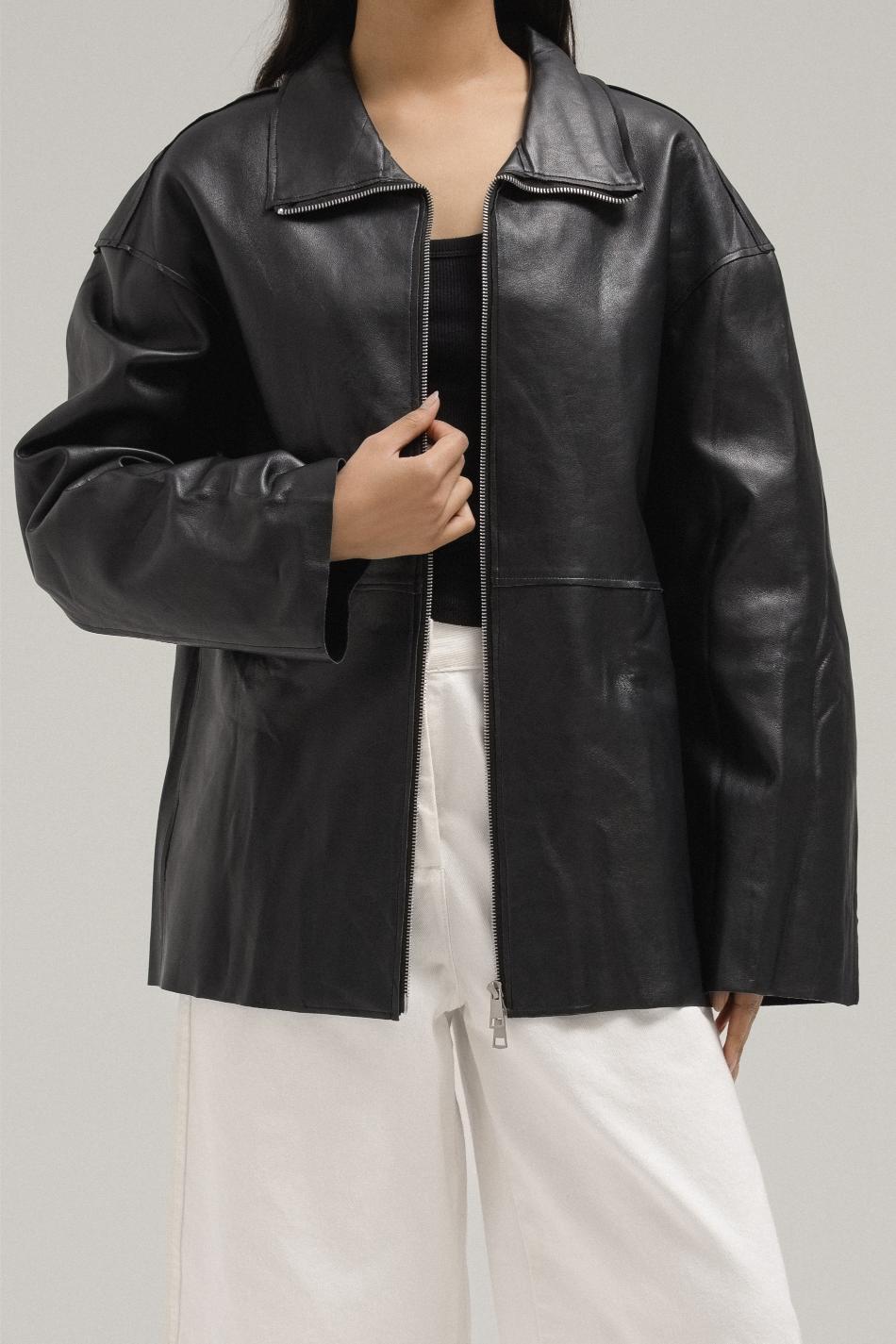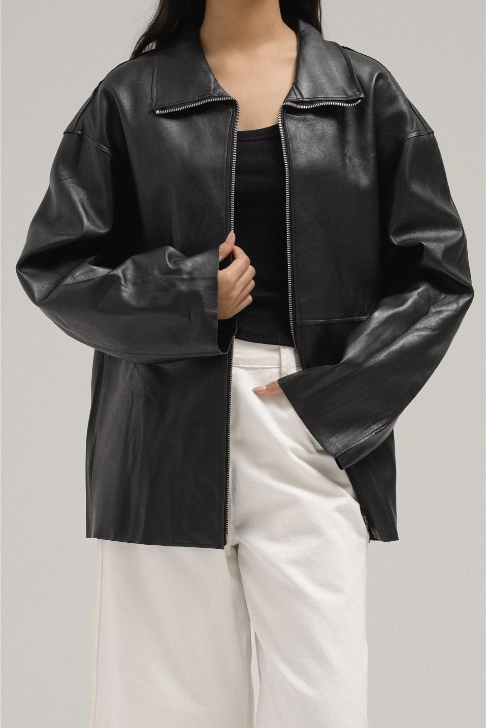 A minimalist yet polished piece, this jacket is crafted from smooth faux leather with a soft sheen finish. Designed with a straight, relaxed fit, it features a classic collar and a full front zipper closure. Its versatile cut makes it easy to layer over both casual and elevated outfits, offering an effortless blend of edge and sophistication.