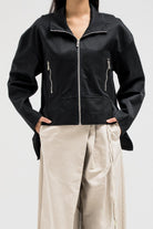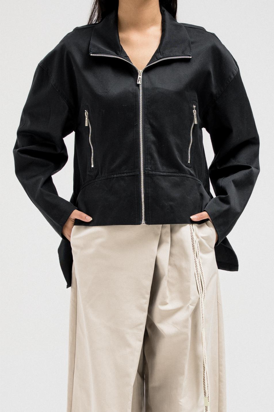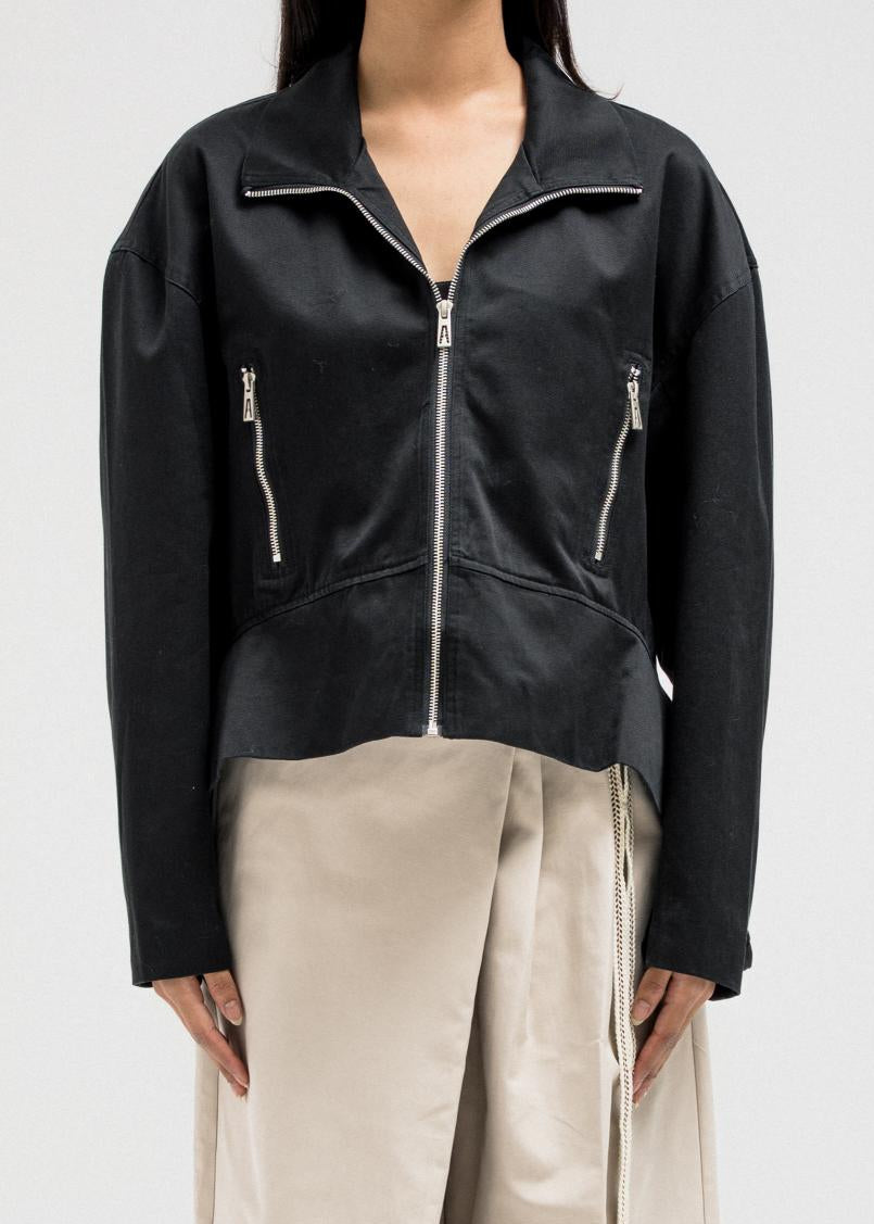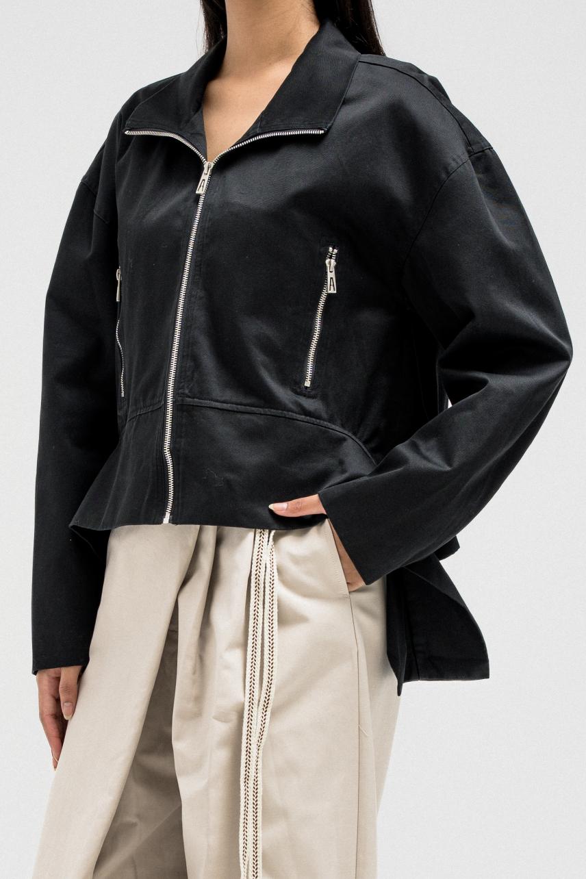 A sleek, structured jacket featuring a front zipper closure and side pockets for a clean, utilitarian edge. The hem is designed with layered side panels that create a sculpted silhouette, adding movement and shape to the look. Perfect for pairing with tailored or casual pieces for a refined yet modern finish.