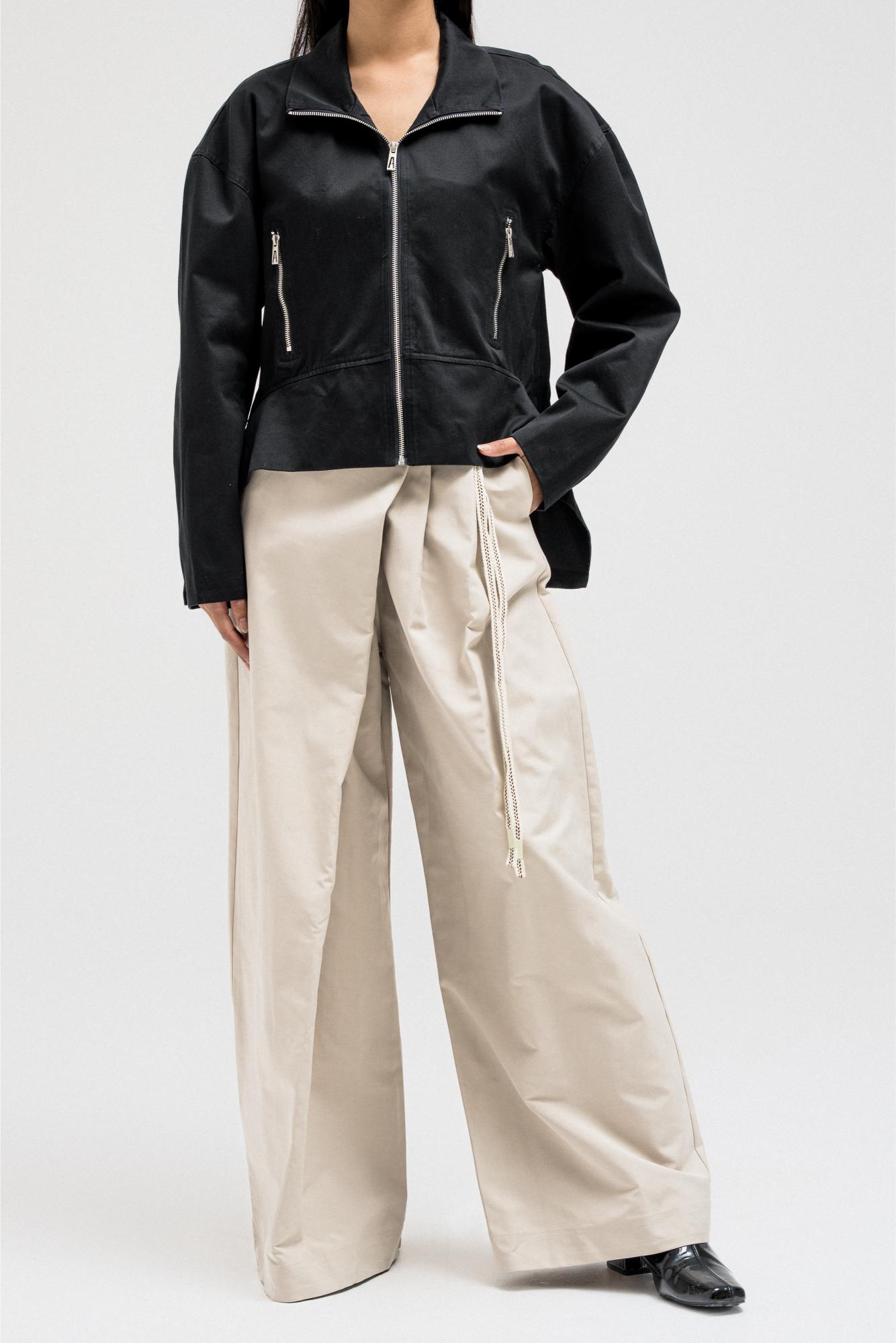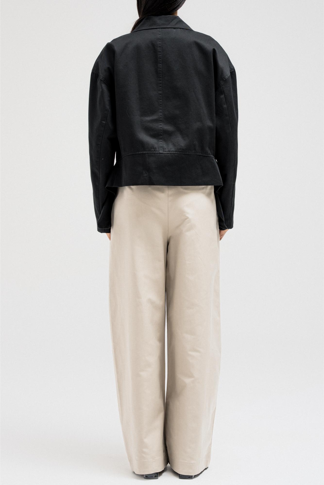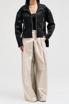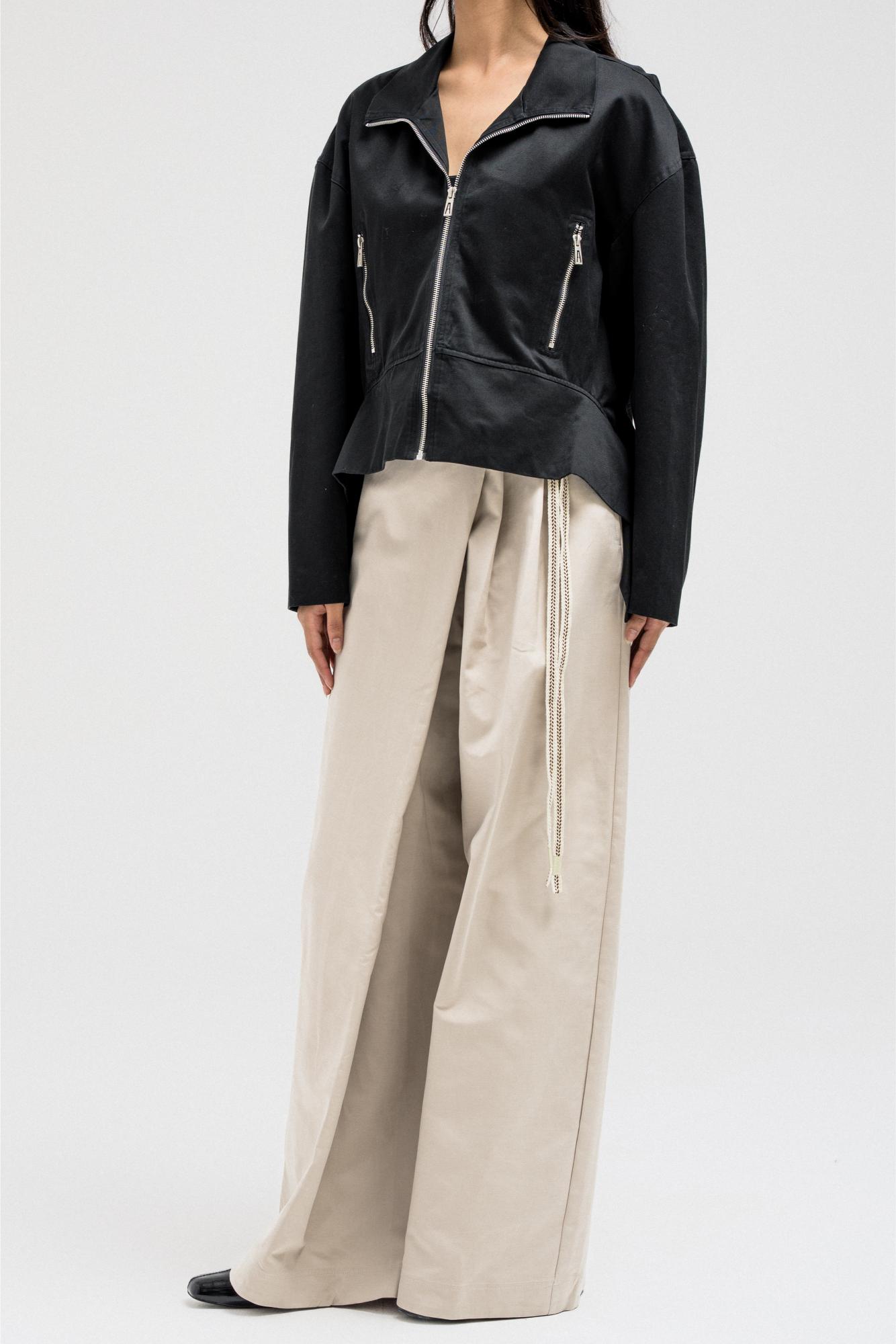 A sleek, structured jacket featuring a front zipper closure and side pockets for a clean, utilitarian edge. The hem is designed with layered side panels that create a sculpted silhouette, adding movement and shape to the look. Perfect for pairing with tailored or casual pieces for a refined yet modern finish.