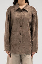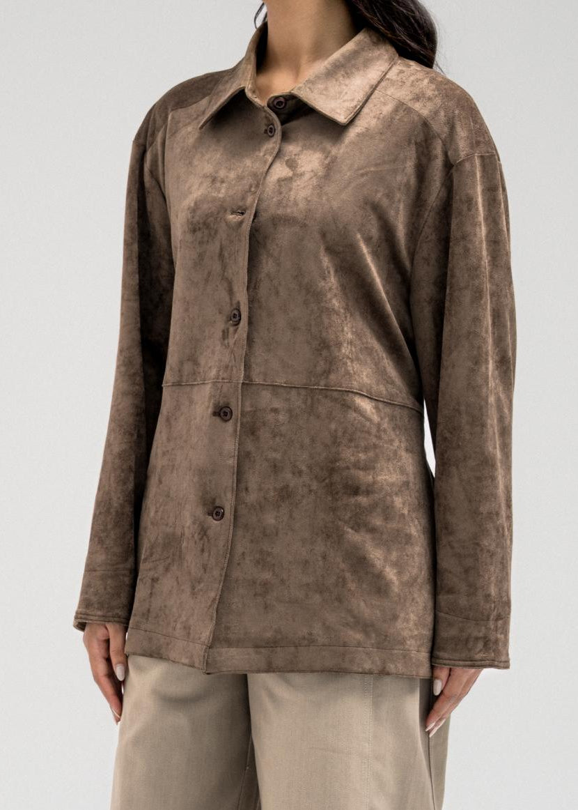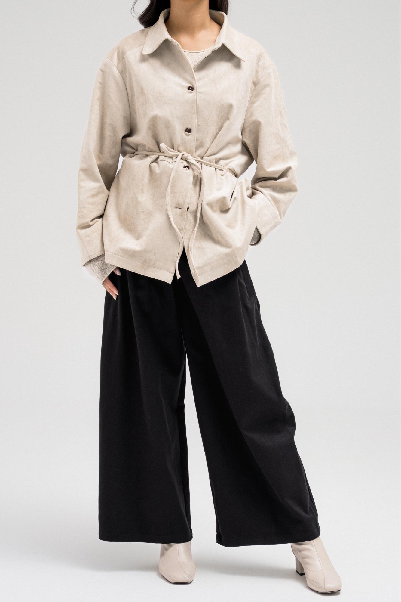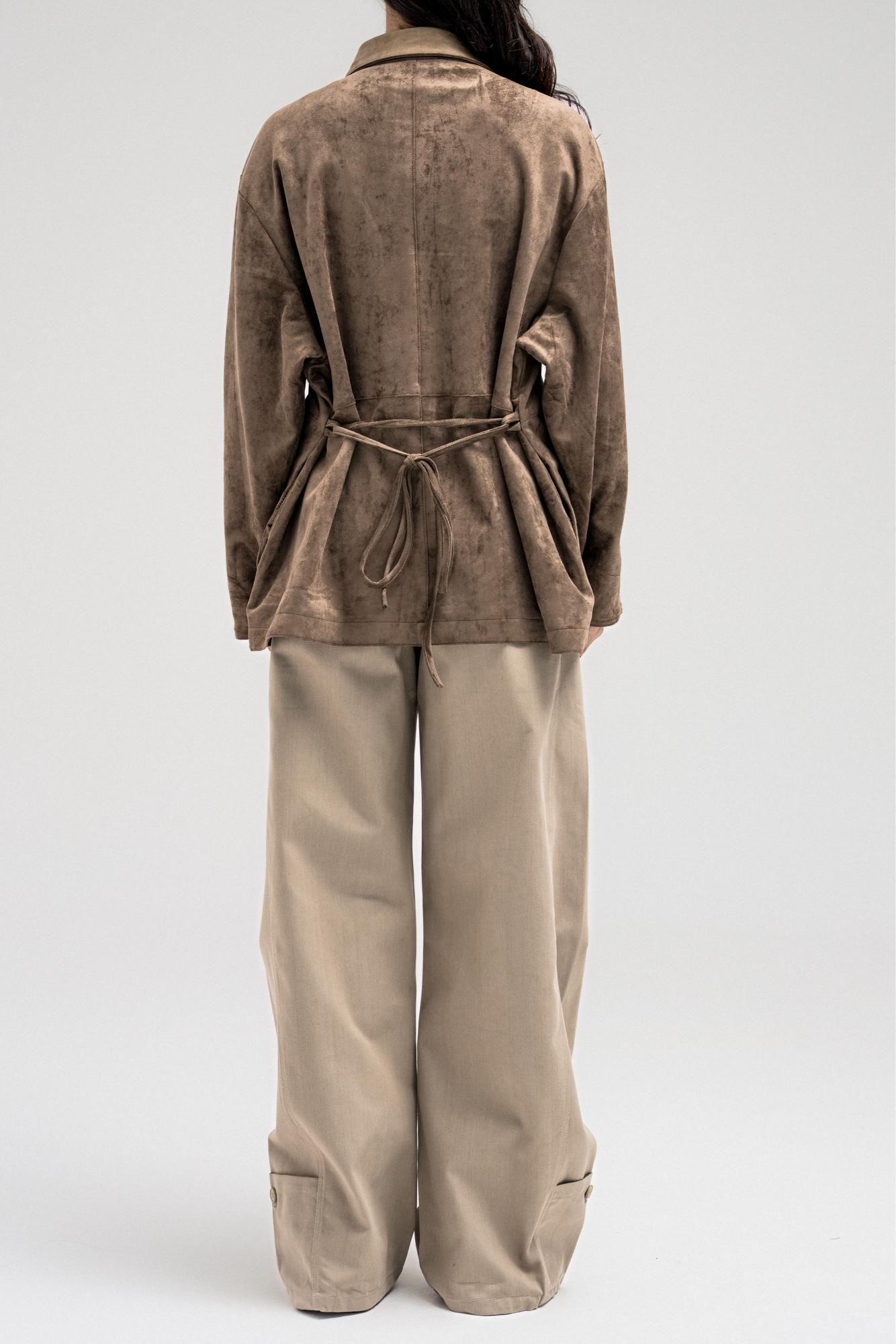 Soft suede-style jacket featuring a classic collar and front button closure. Designed with thin matching suede strings that can be styled tied at the back or front, allowing versatile wear. Available in beige and brown tones for effortless layering.
