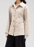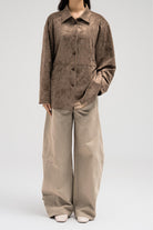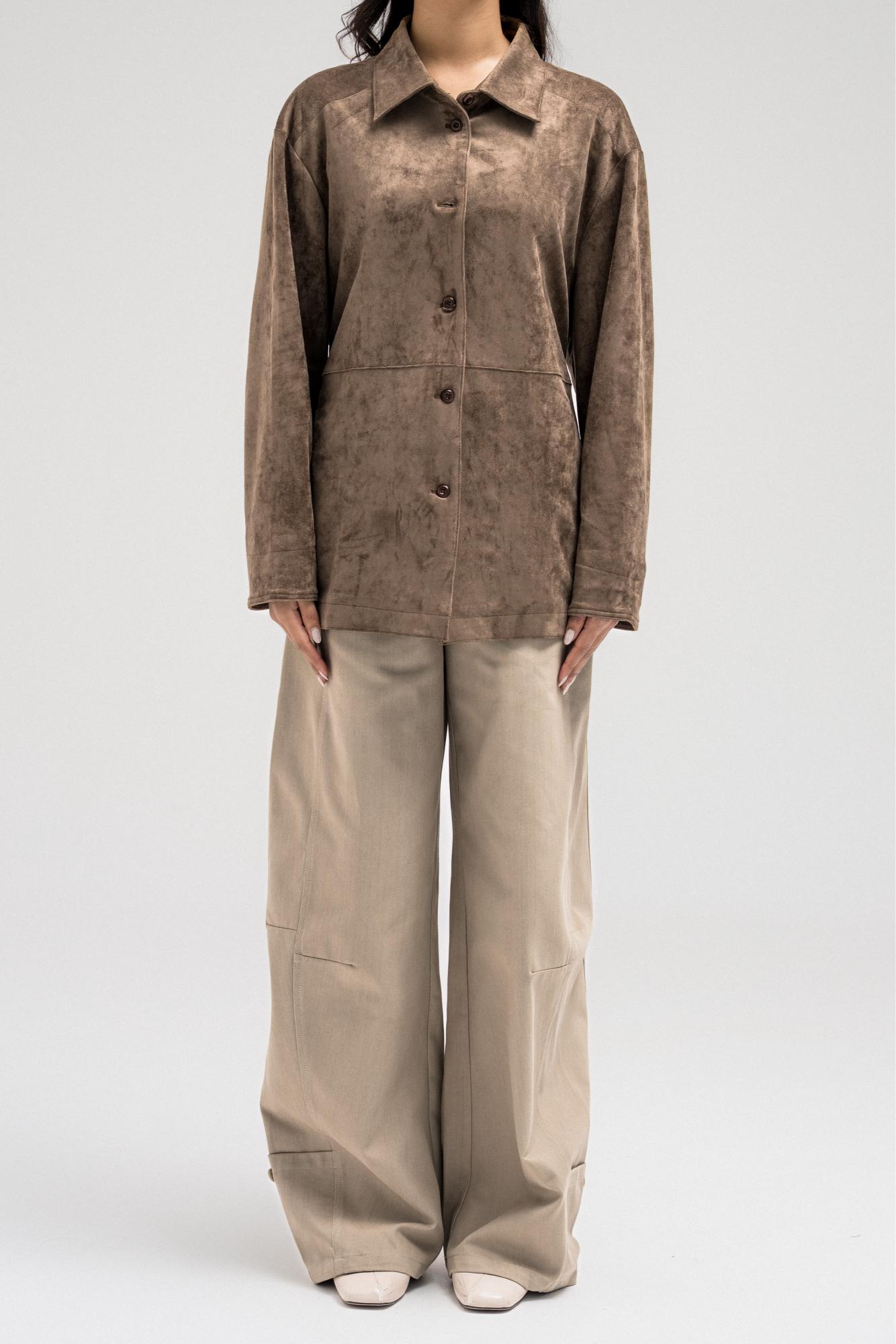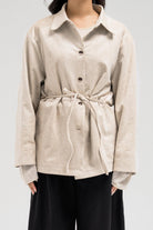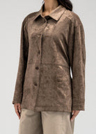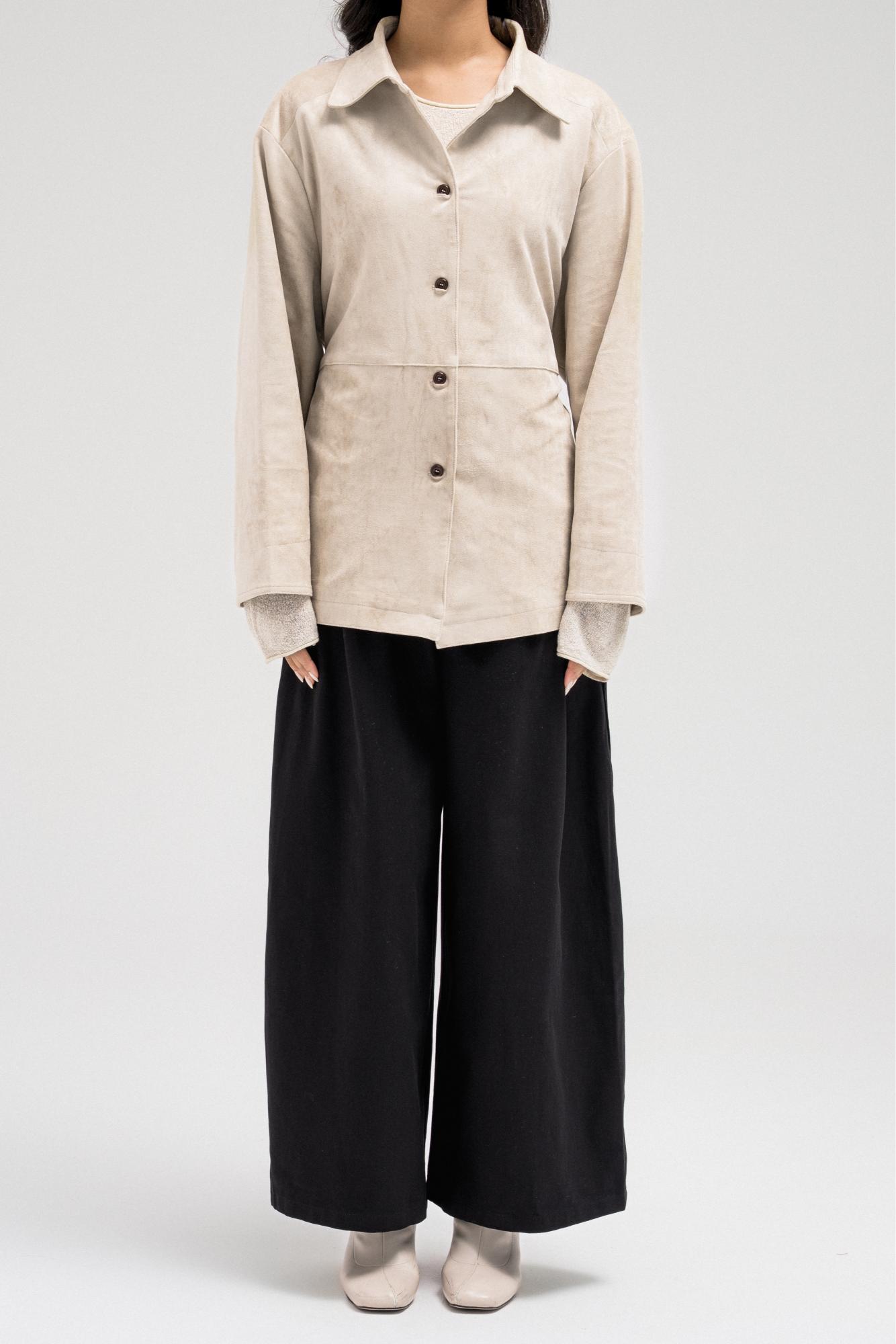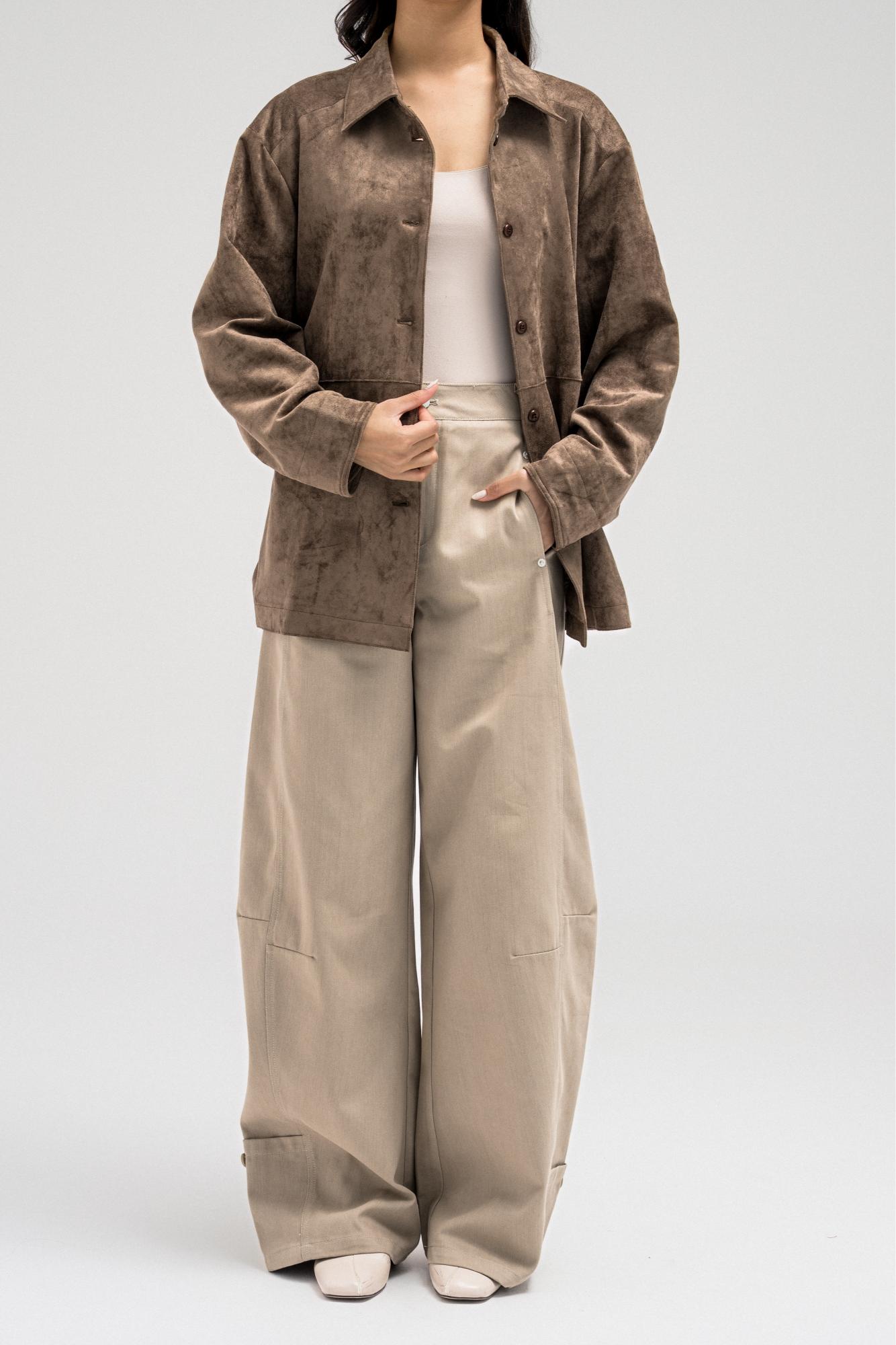 Soft suede-style jacket featuring a classic collar and front button closure. Designed with thin matching suede strings that can be styled tied at the back or front, allowing versatile wear. Available in beige and brown tones for effortless layering.