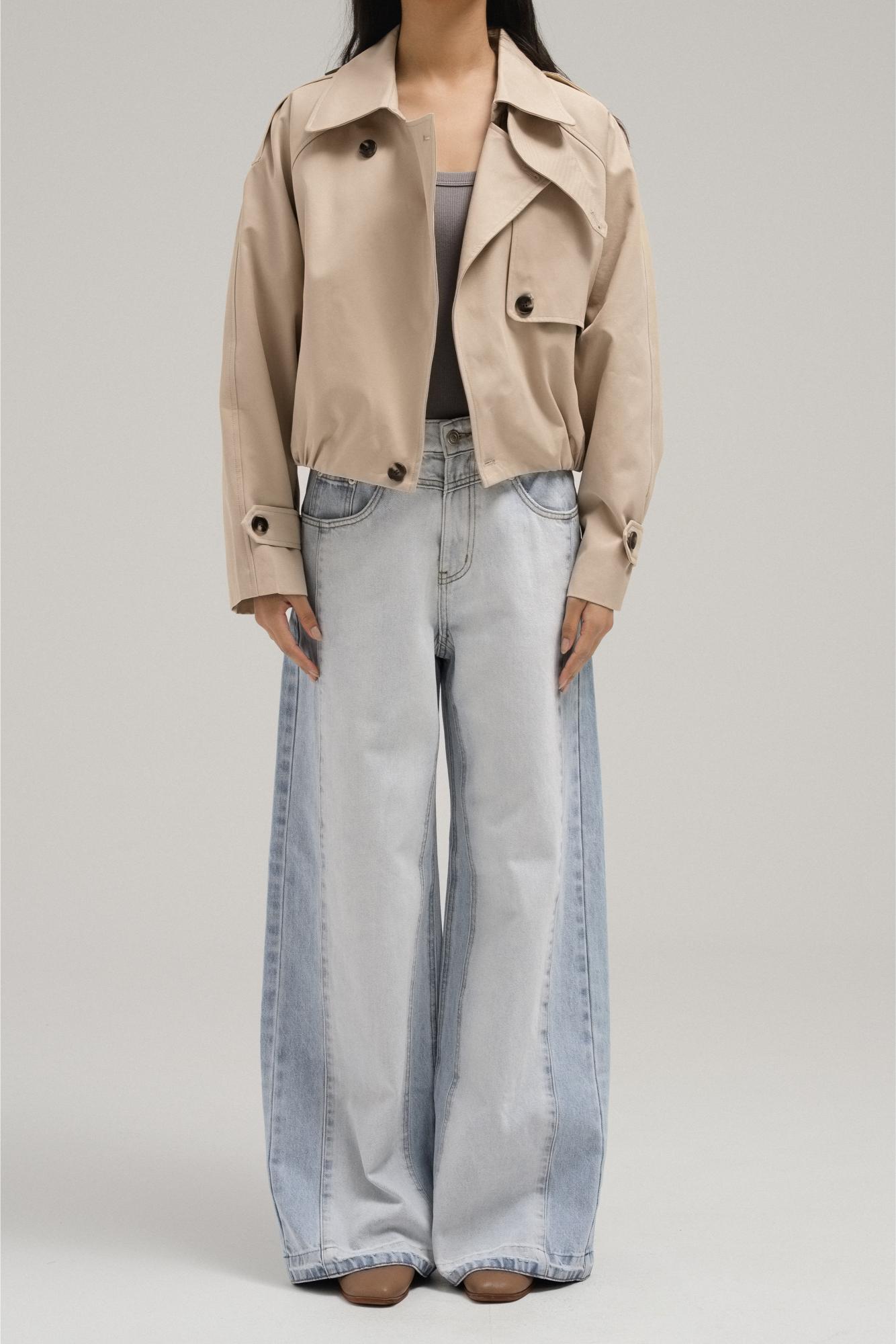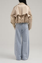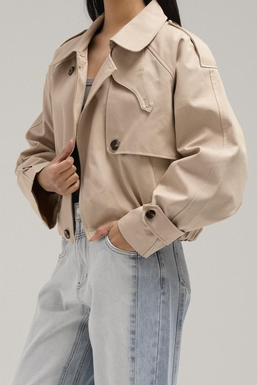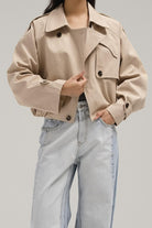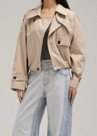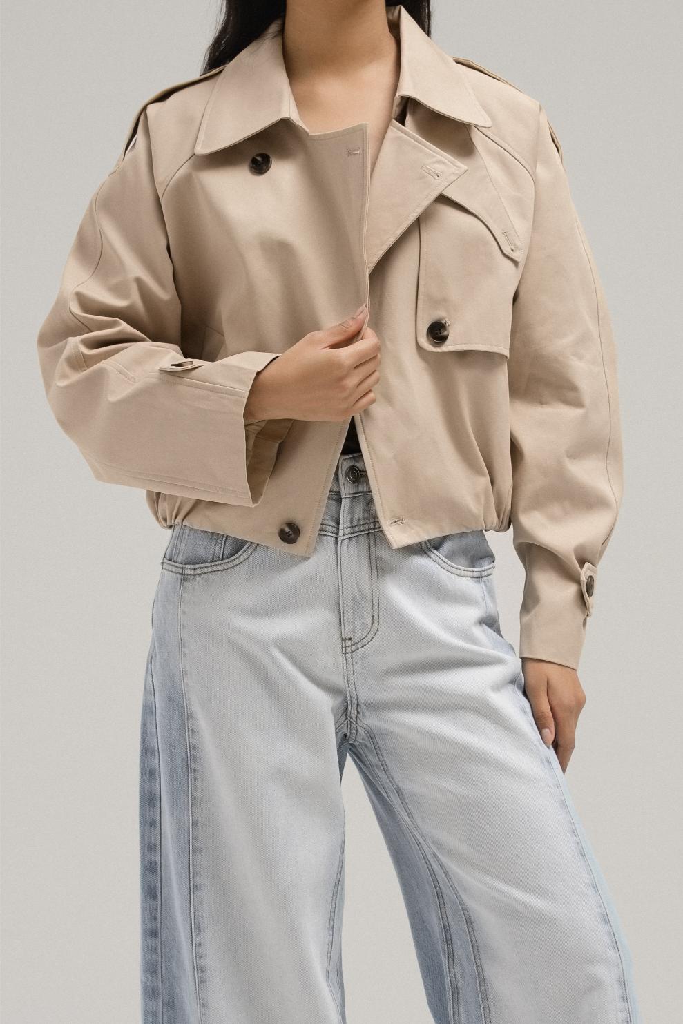This cropped jacket redefines everyday outerwear with its modern, boxy fit. It features a sharp collar, button closure, and a distinctive elasticated hem that creates a cinched, contemporary shape. Lightweight yet structured, it’s a go-to piece for layering and effortless styling.