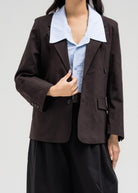 Blazer-style jacket featuring a two-button front closure and notched lapel collar. Designed with an attached cropped inner shirt detail that creates the illusion of layered styling.