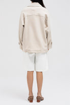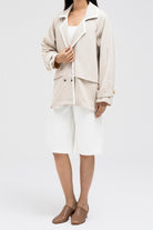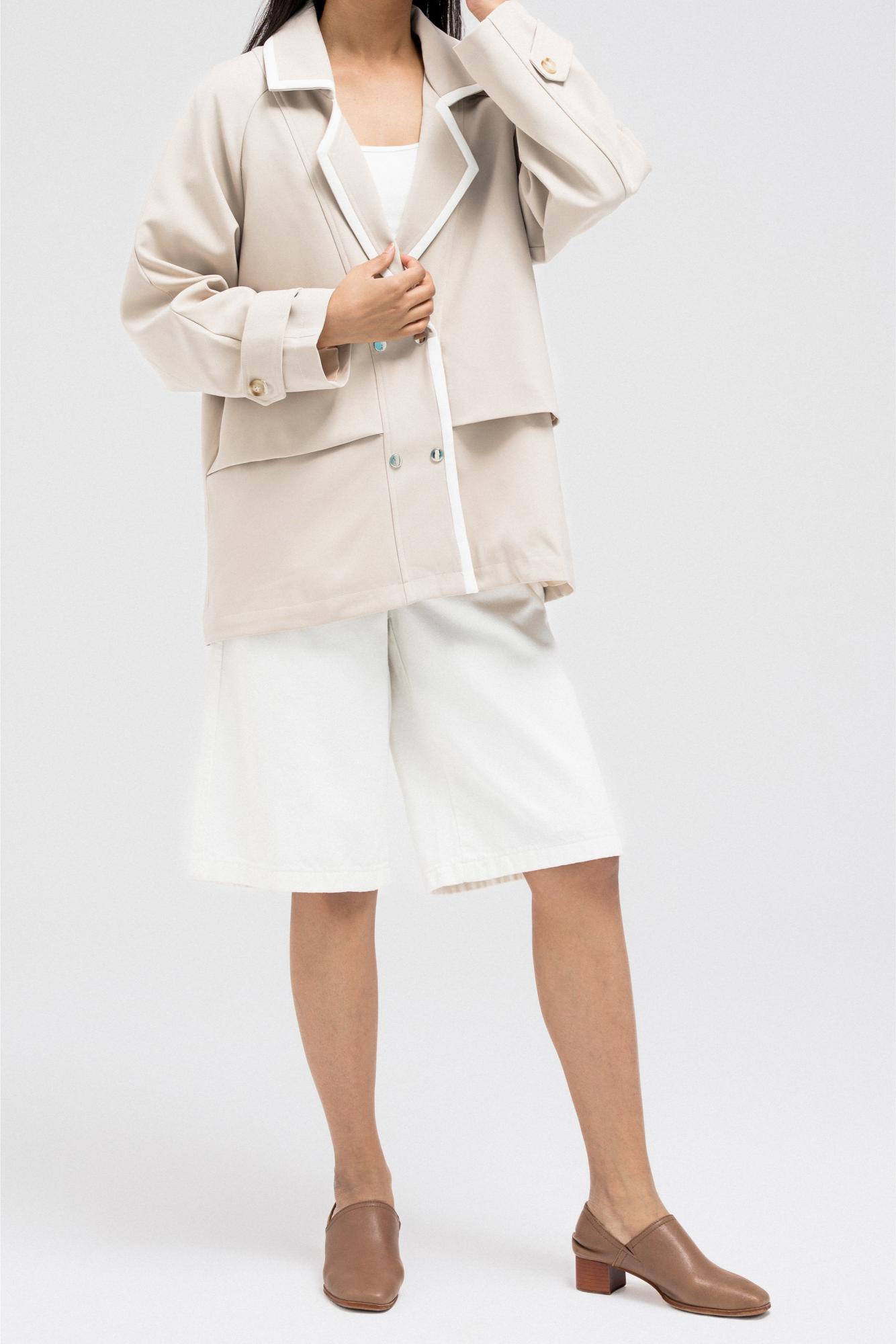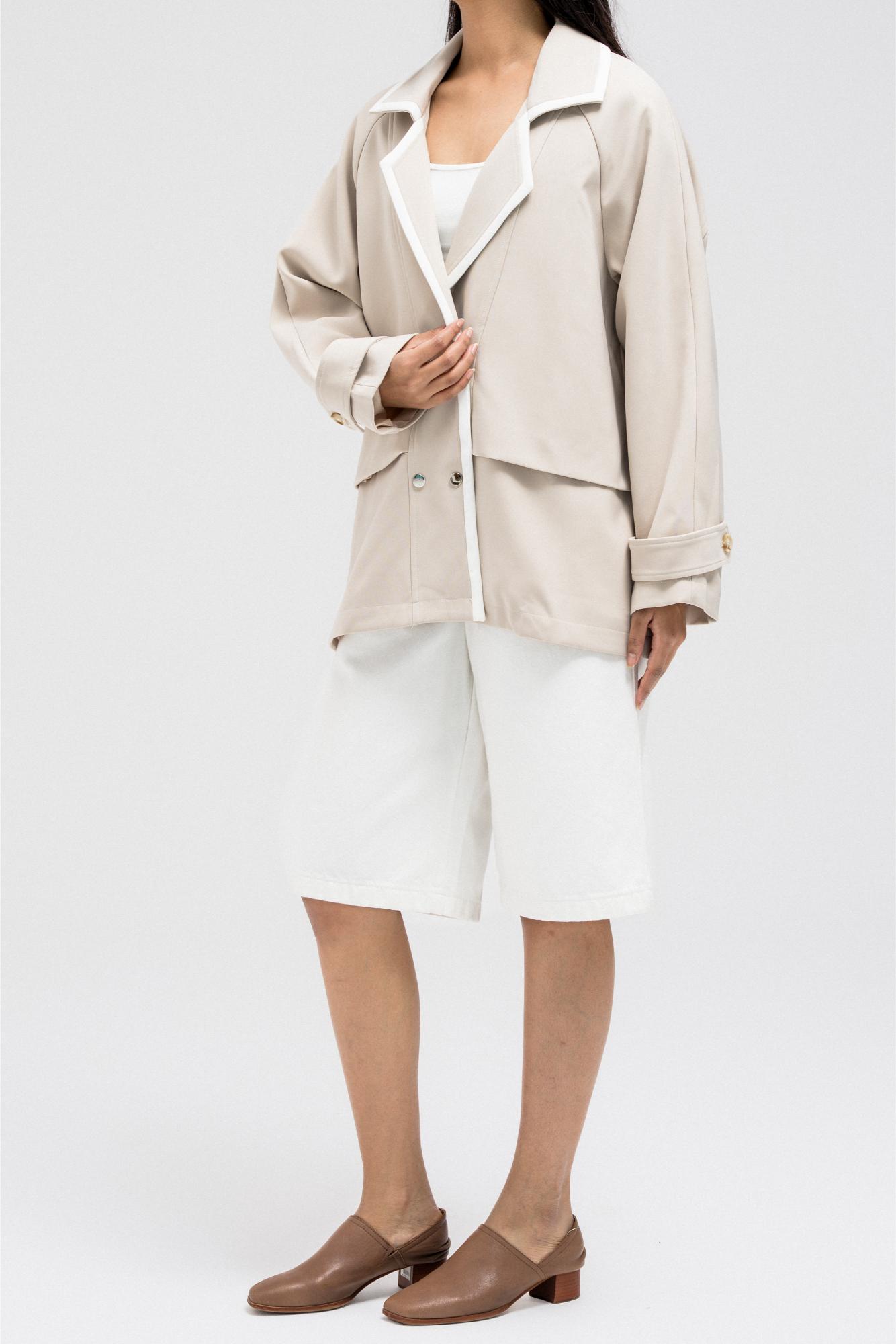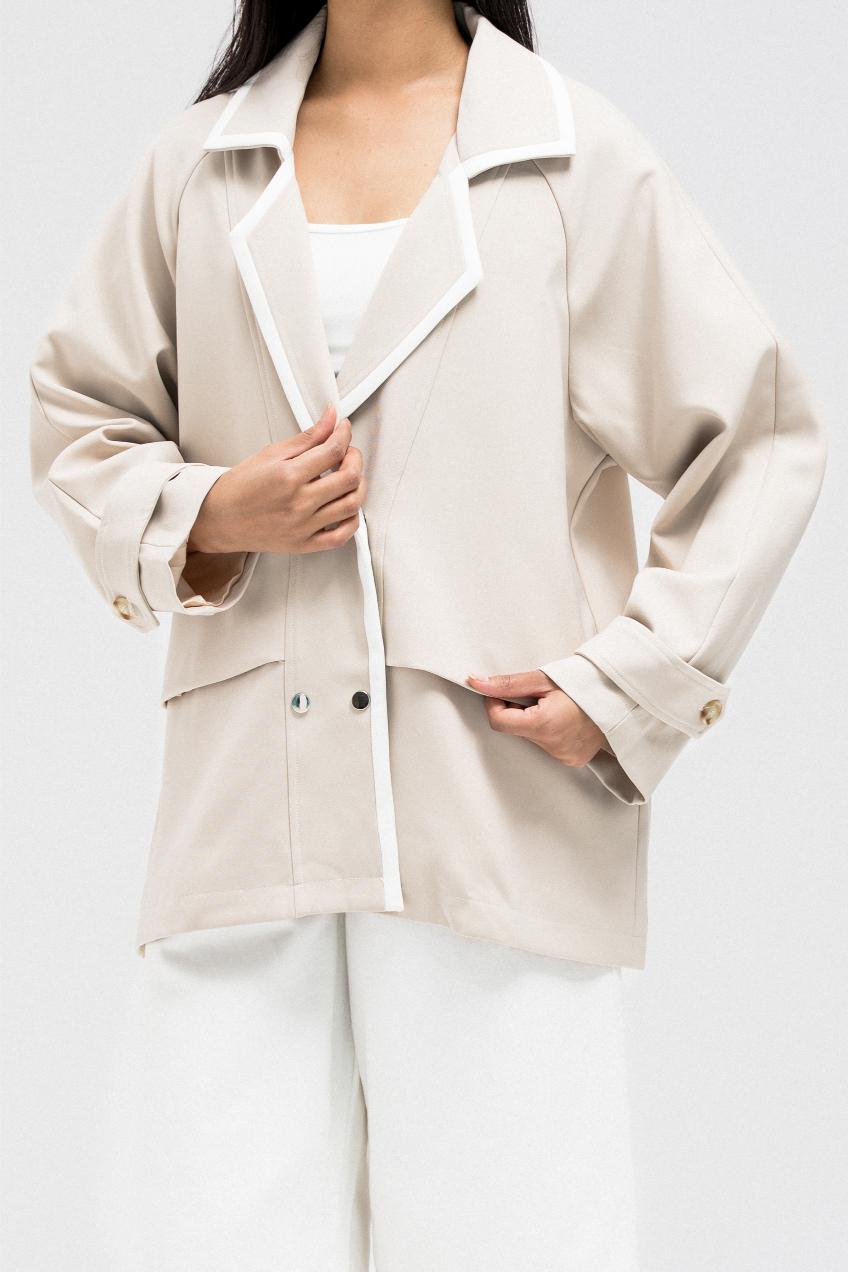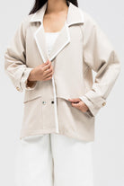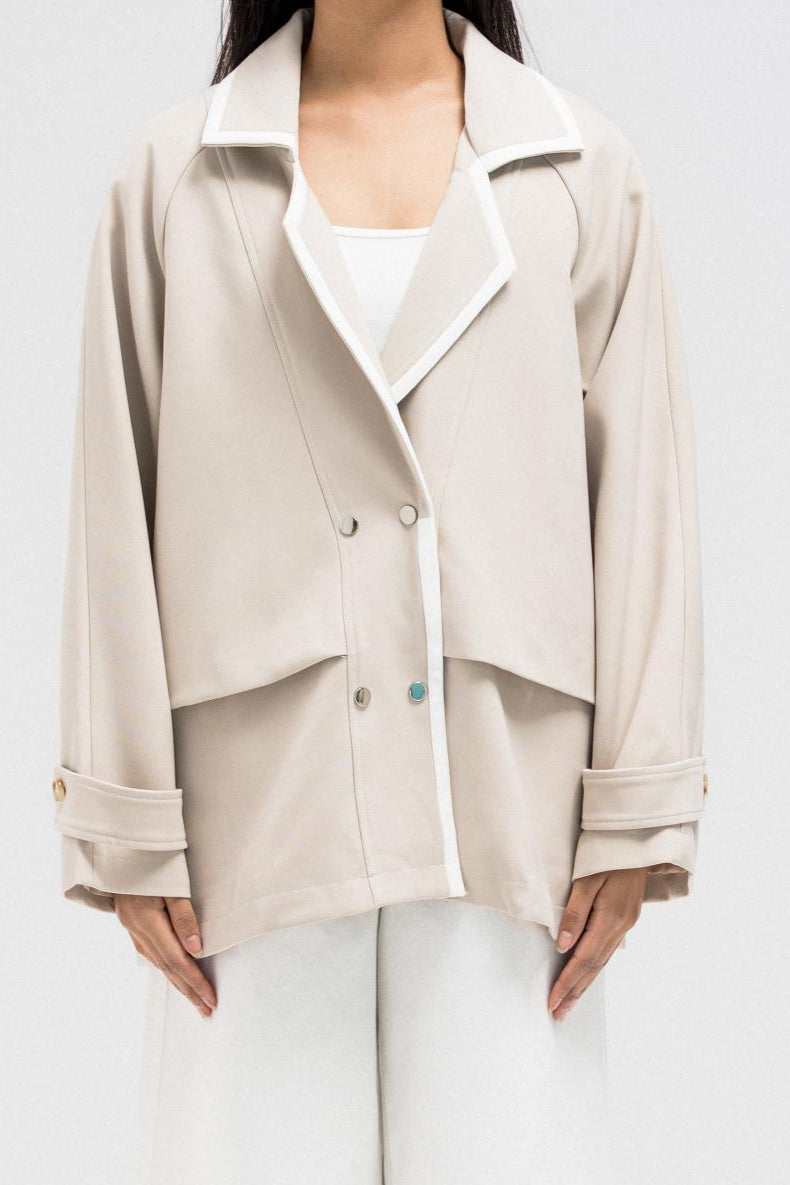 This blazer-inspired jacket features a wide lapel collar with contrast piping for a bold touch. It includes a double square metal clip closure and a soft, layered drape design for a relaxed fit. The sleeves are long with folded cuffs and button tab detailing.
