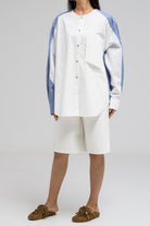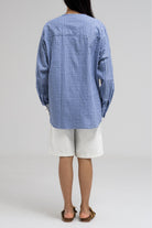 This relaxed-fit top features a mix of two contrasting fabrics. The front panel is plain with a round neckline and a front button closure, while the back and sleeves showcase a vibrant checkered pattern. Finished with a large front pocket and dropped shoulders for a laid-back, stylish look.