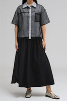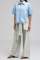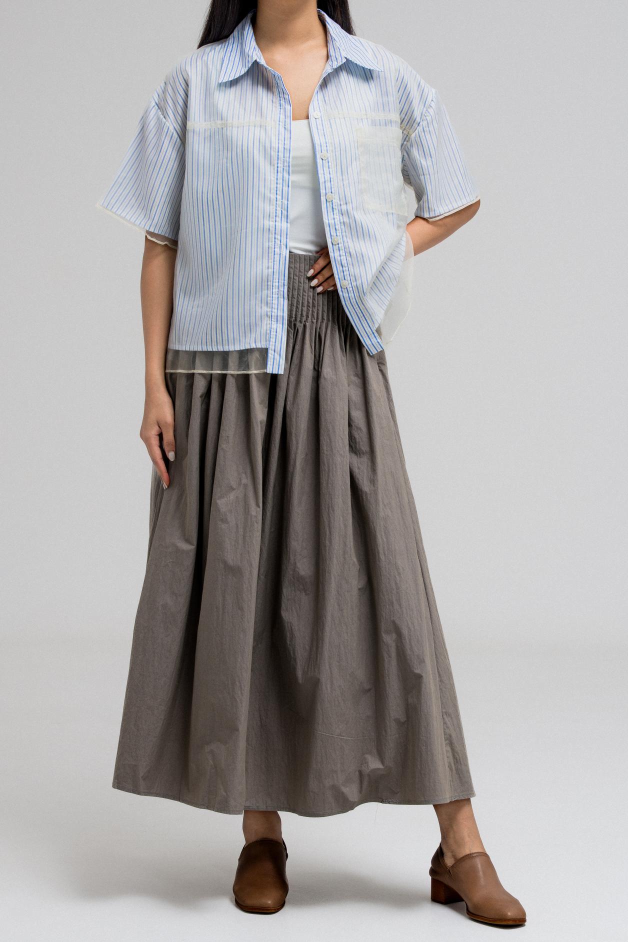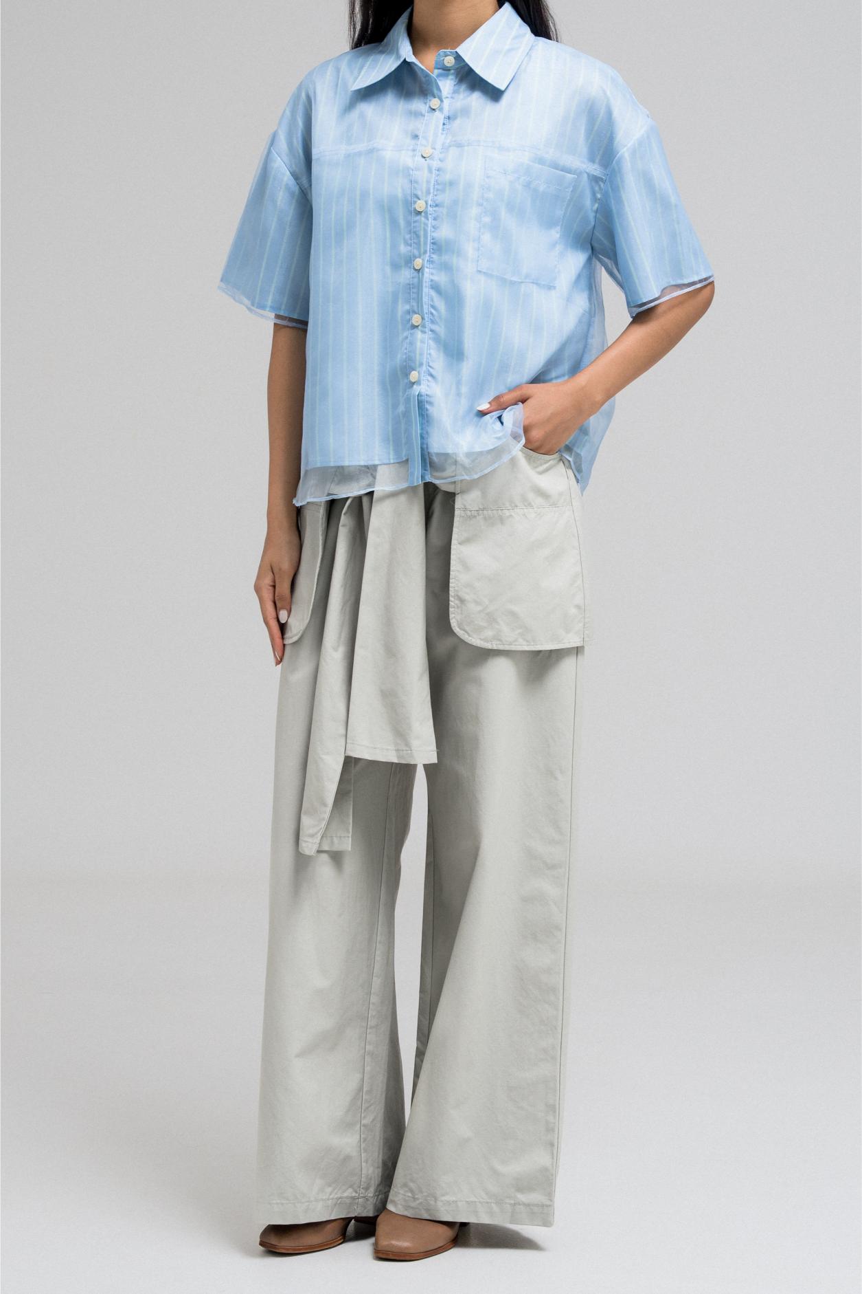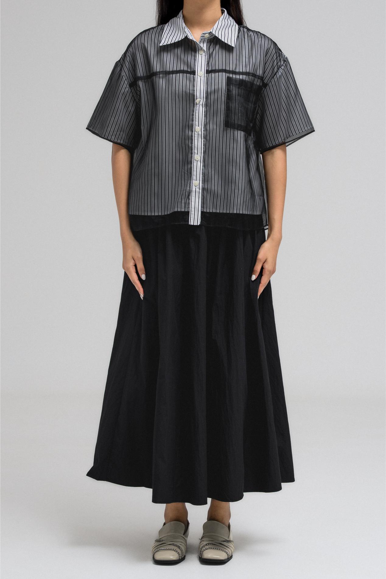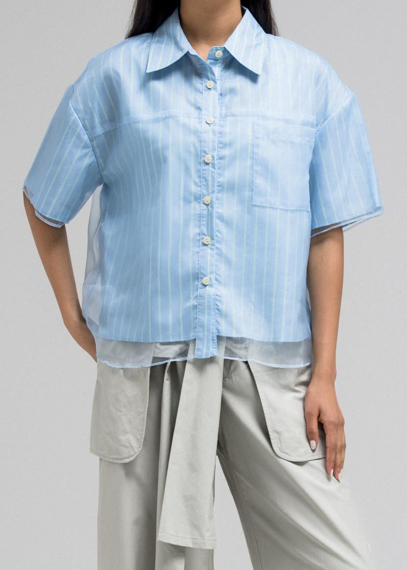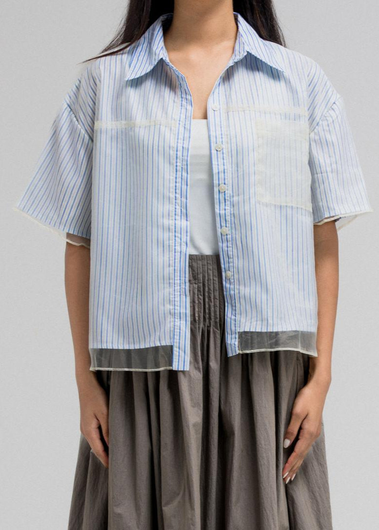 This stylish short-sleeve top features a layered design with a sheer, transparent outer layer that adds a light and airy feel. The inner layer showcases a vertical stripe pattern, giving the top a classic touch. It has a front button closure and a structured collar, while the sheer overlay includes a single chest pocket, subtly blending function with fashion. A perfect mix of casual and chic.