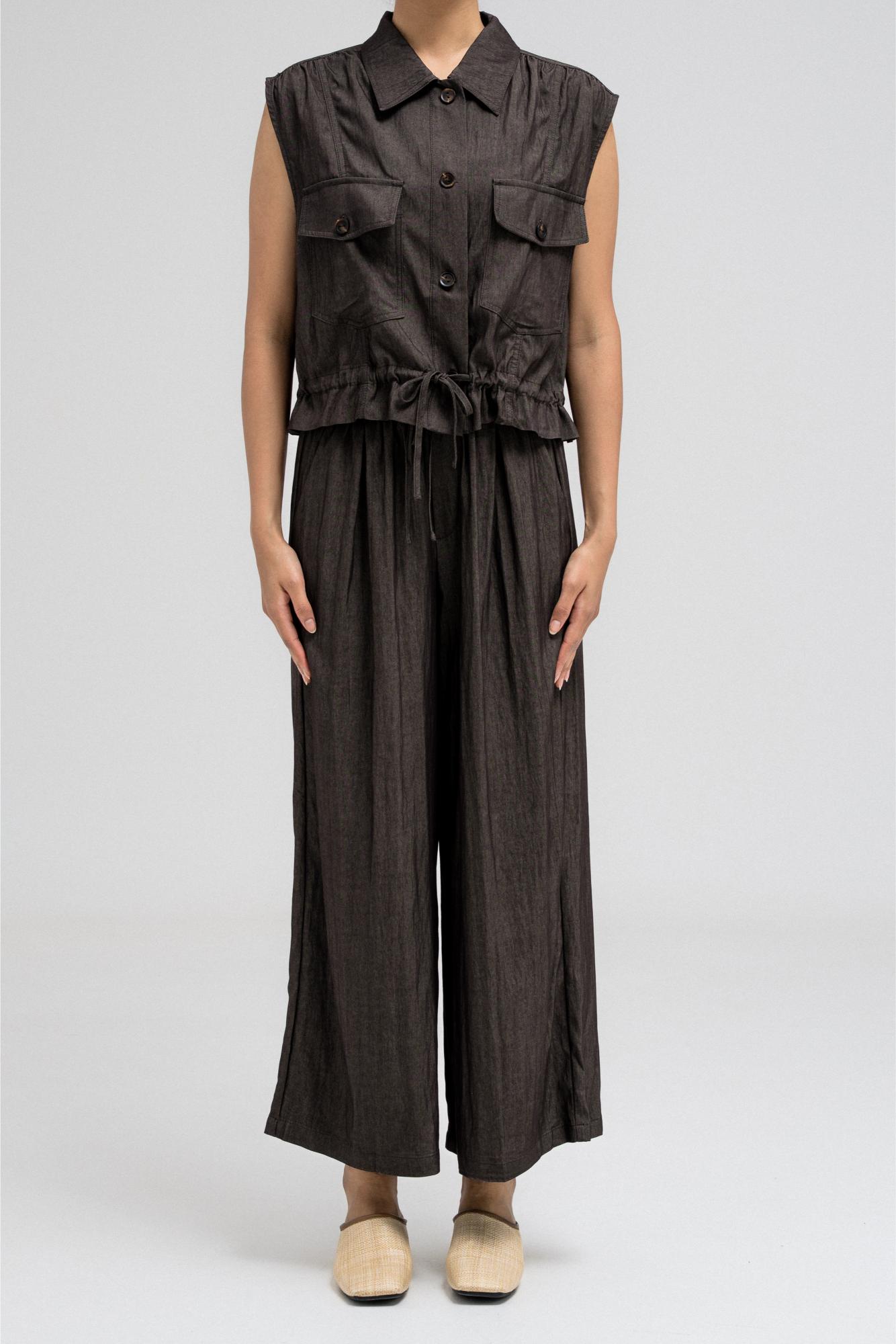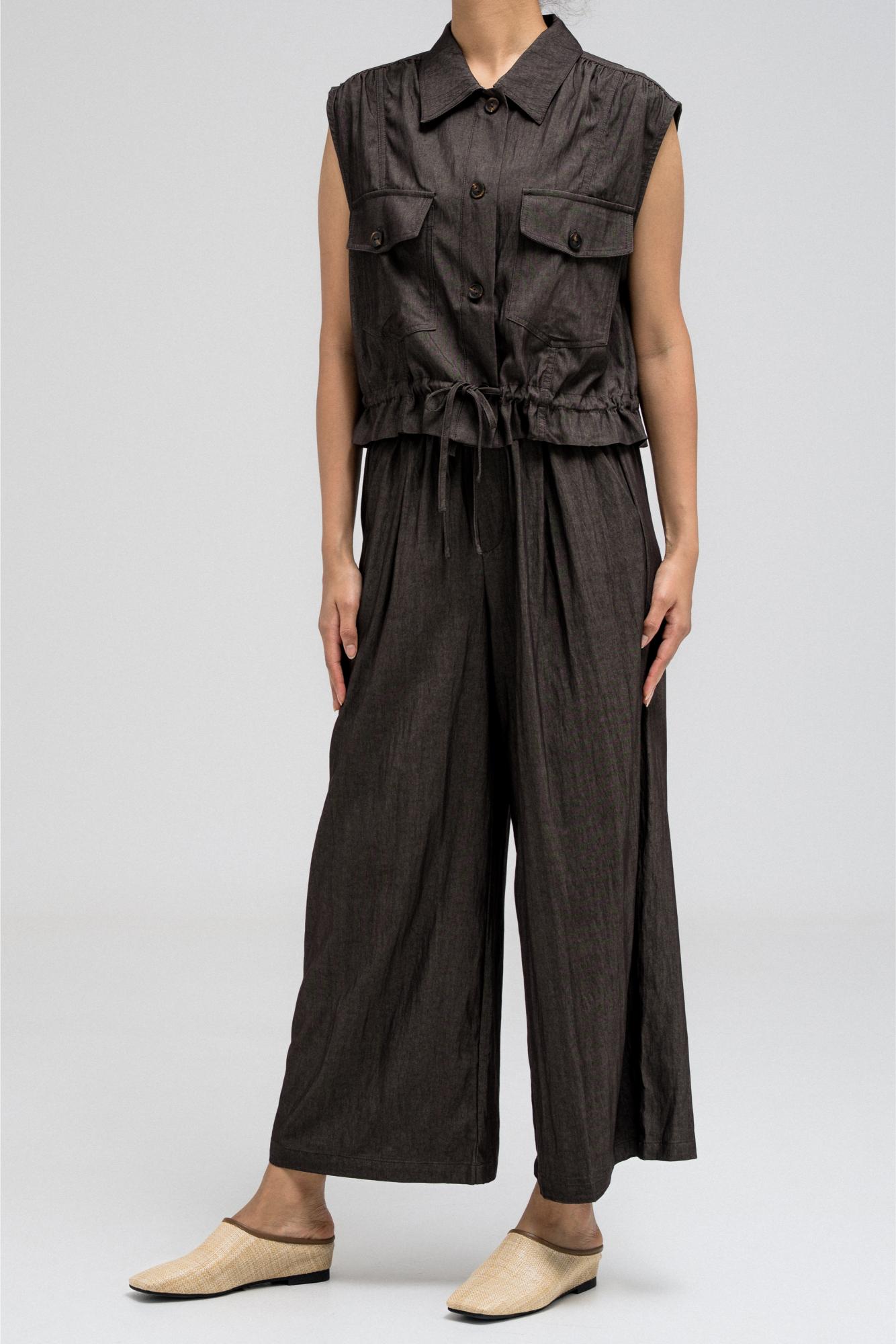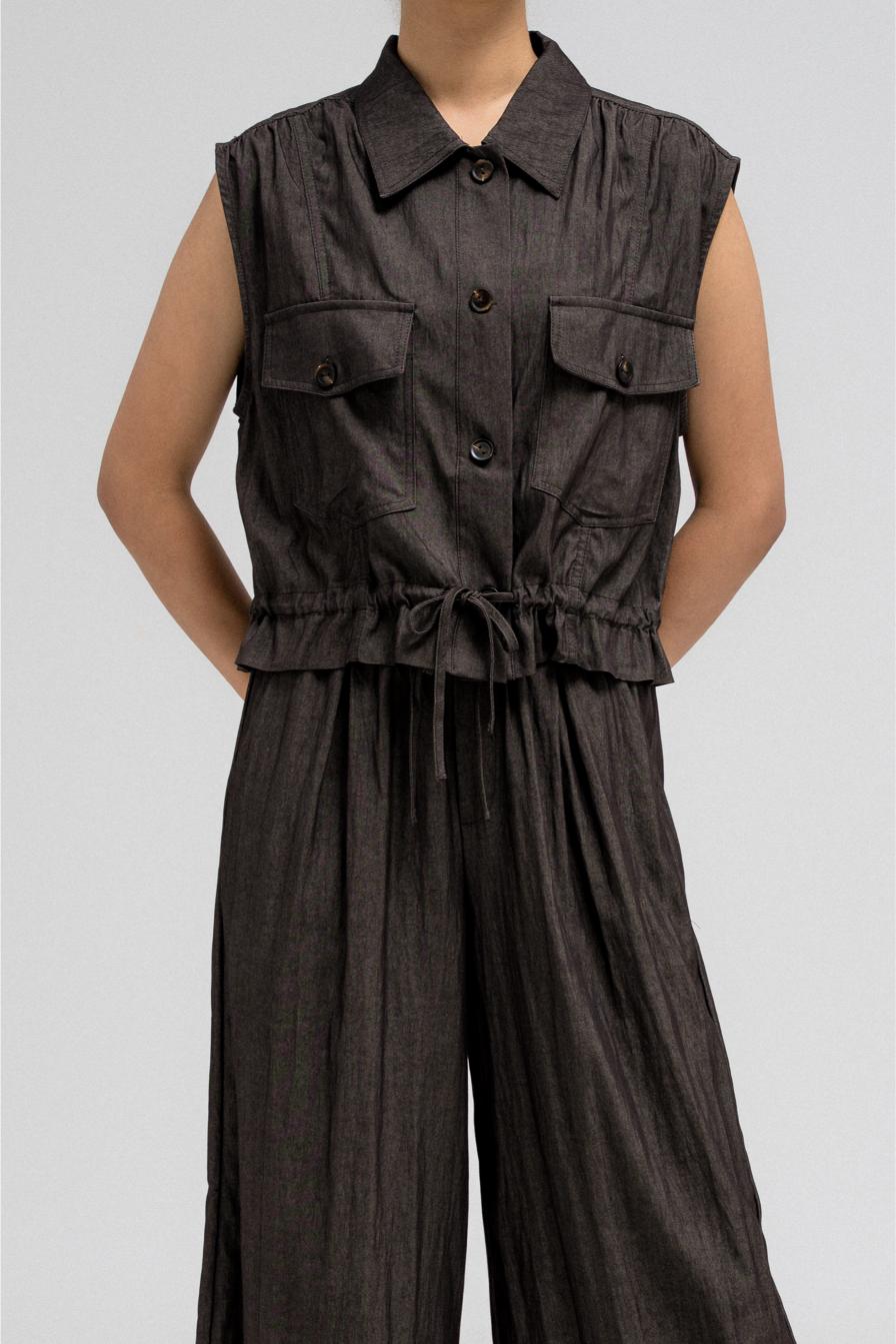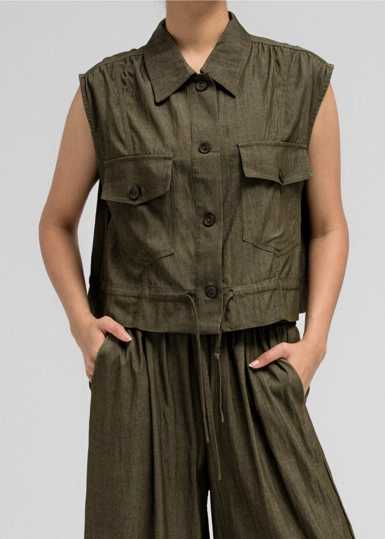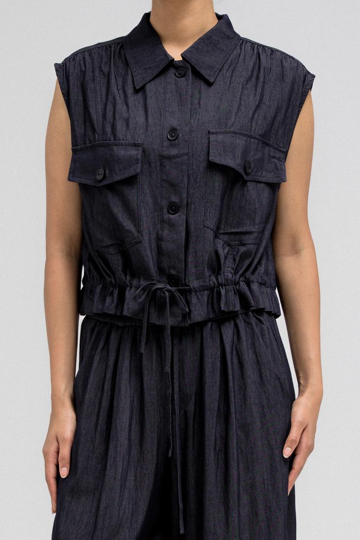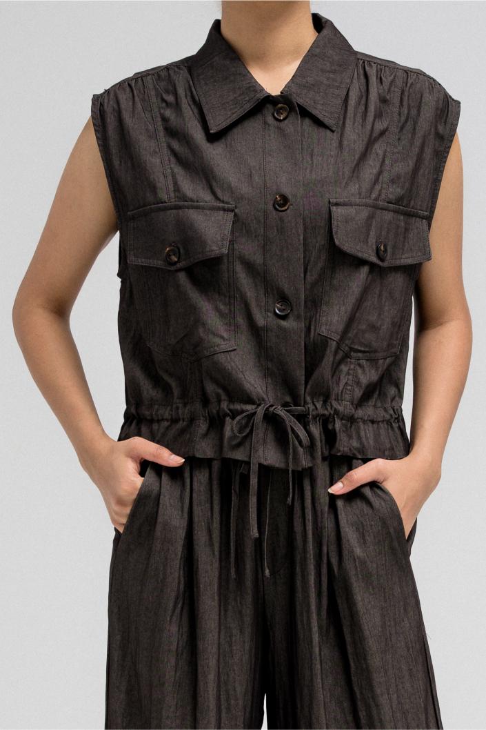 Sleeveless utility-style top features a structured shirt collar and front button closure. It includes two flap chest pockets with button closures, adding to its cargo-inspired look. The hem comes with an attached drawstring, allowing you to cinch and style it as desired. Nice to match with the coordinating pants for a full, put-together outfit.