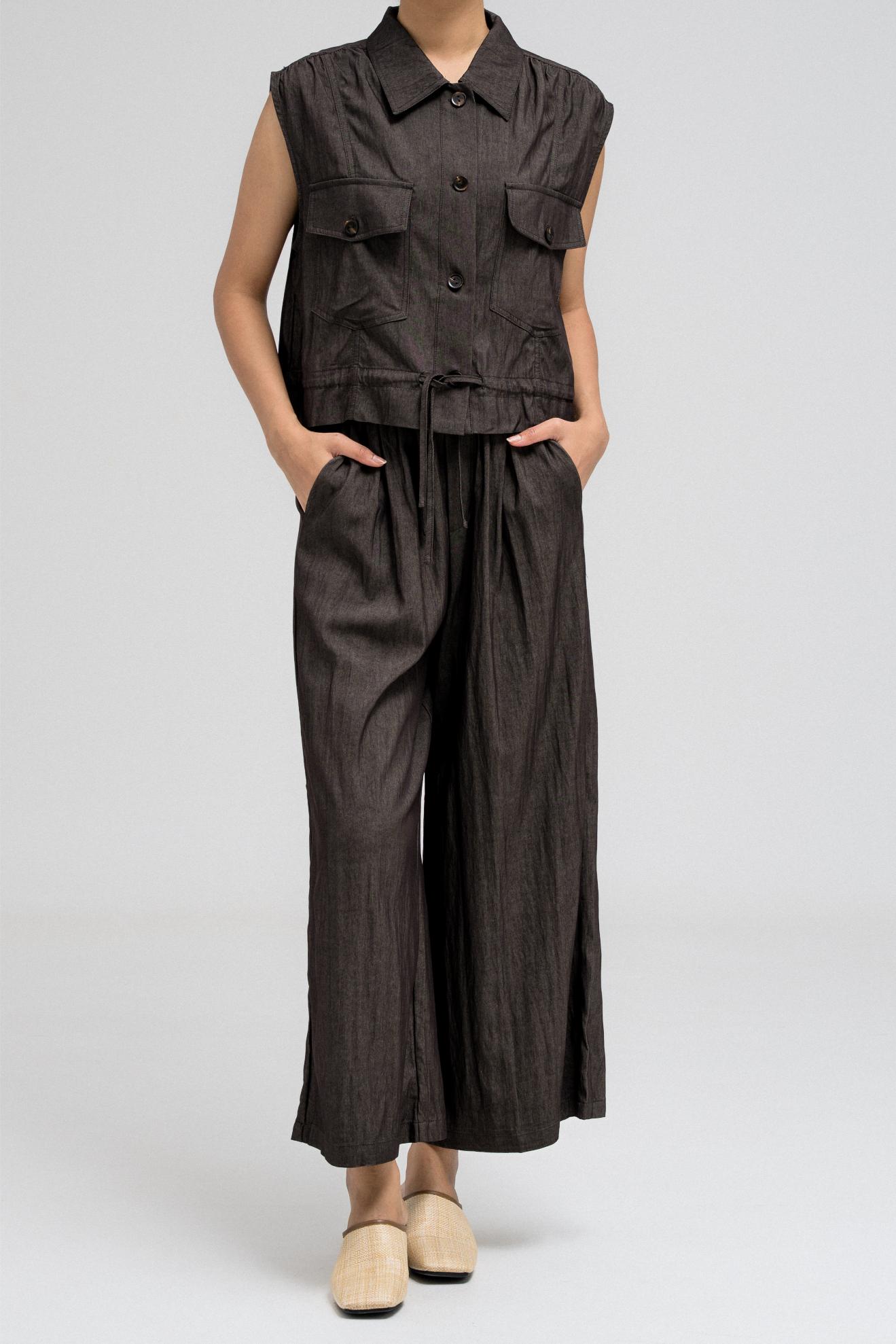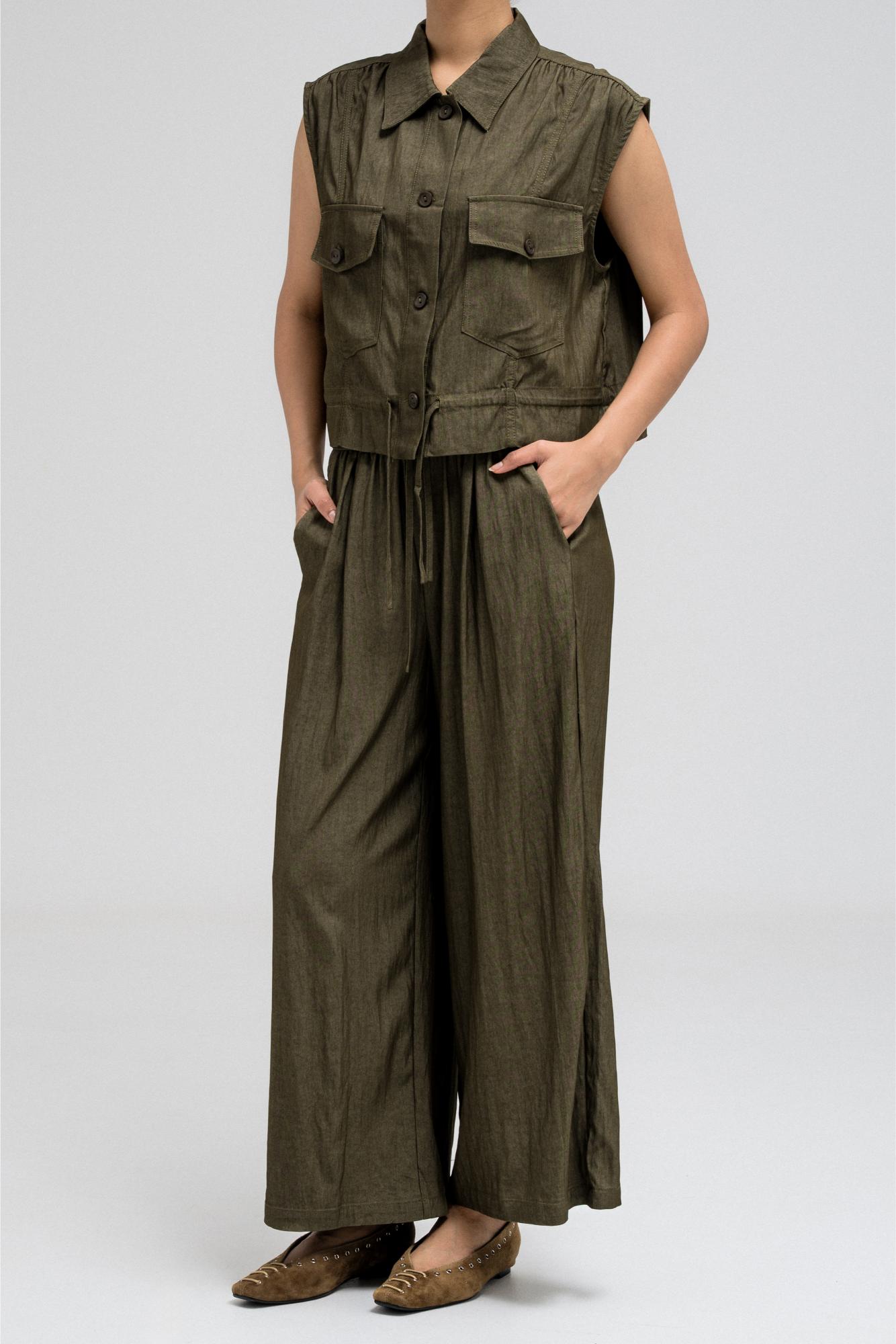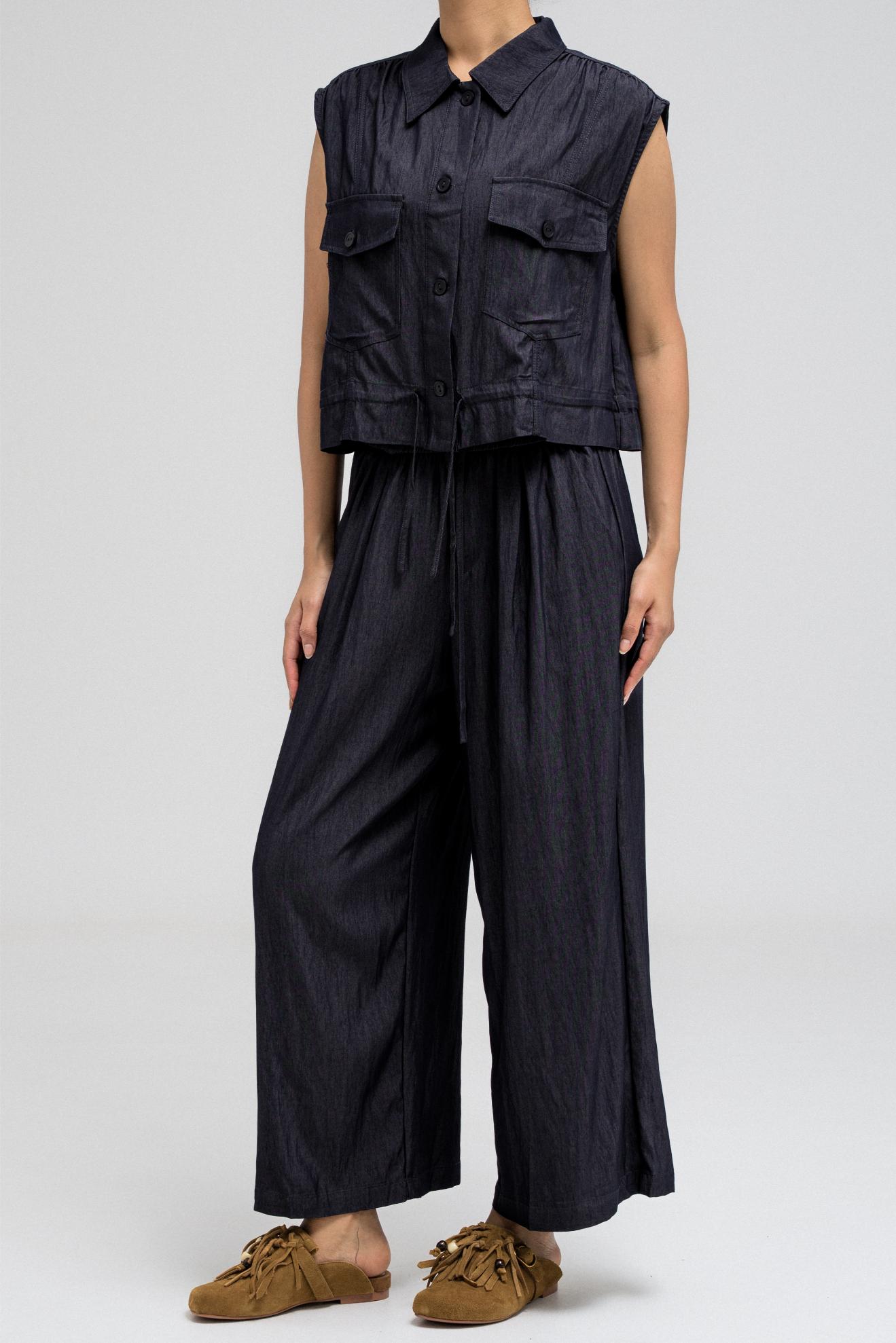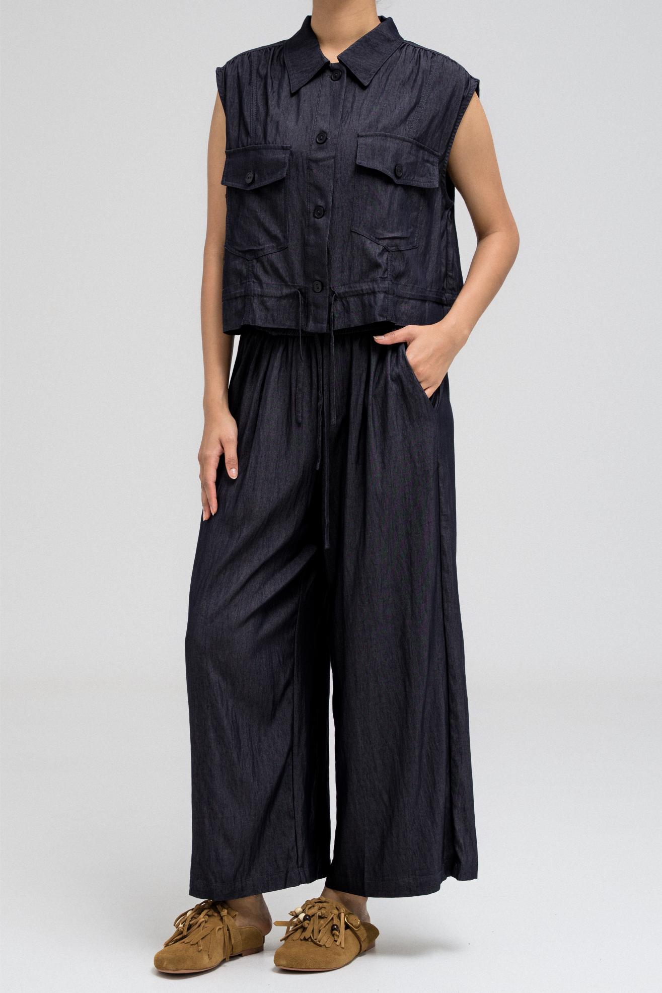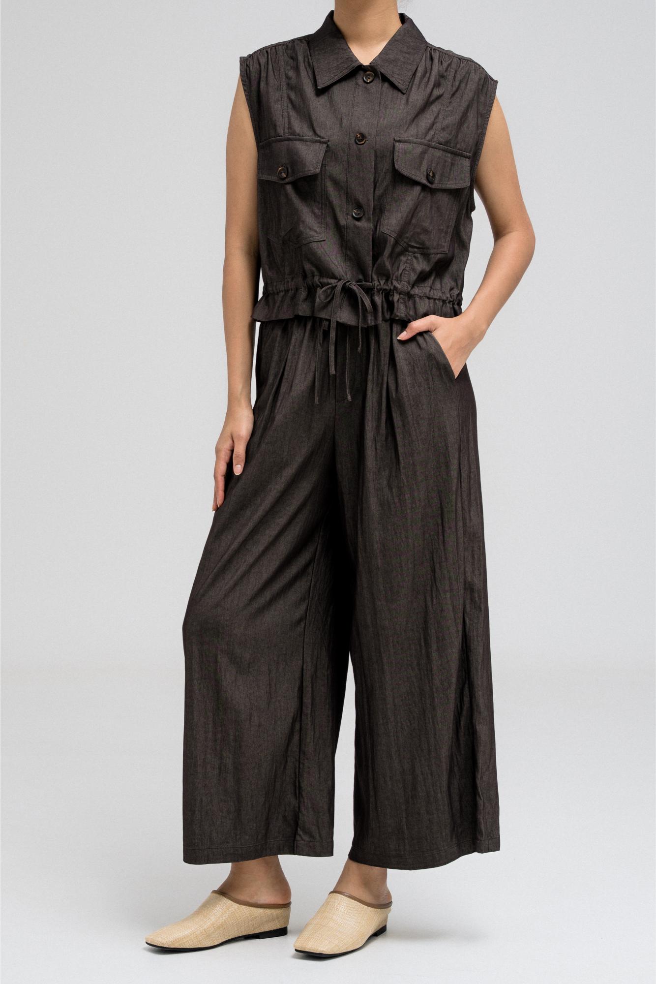 Sleeveless utility-style top features a structured shirt collar and front button closure. It includes two flap chest pockets with button closures, adding to its cargo-inspired look. The hem comes with an attached drawstring, allowing you to cinch and style it as desired. Nice to match with the coordinating pants for a full, put-together outfit.