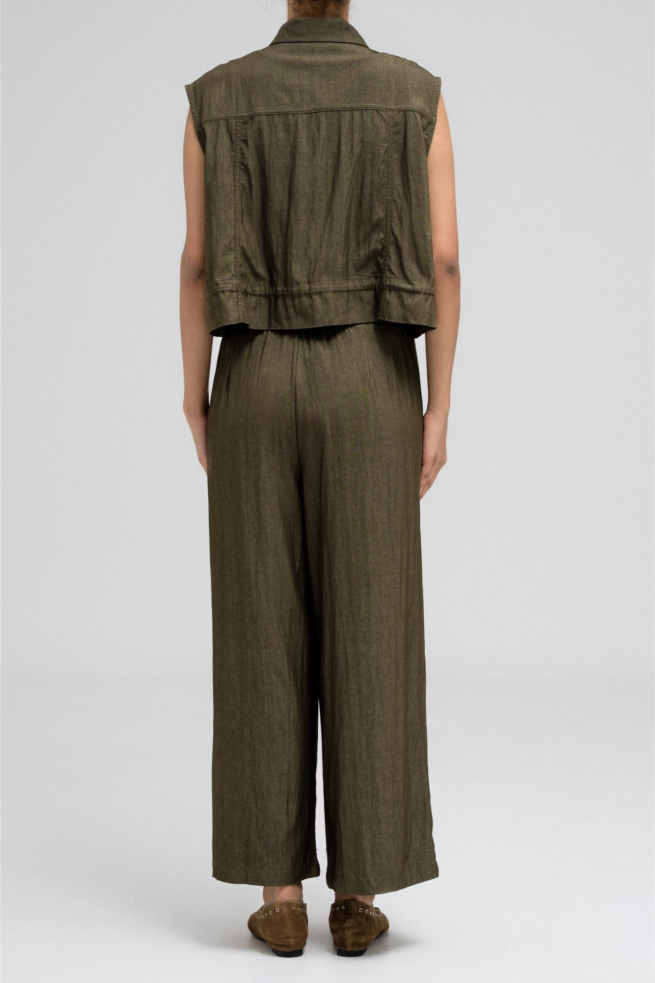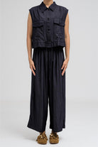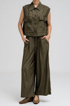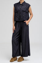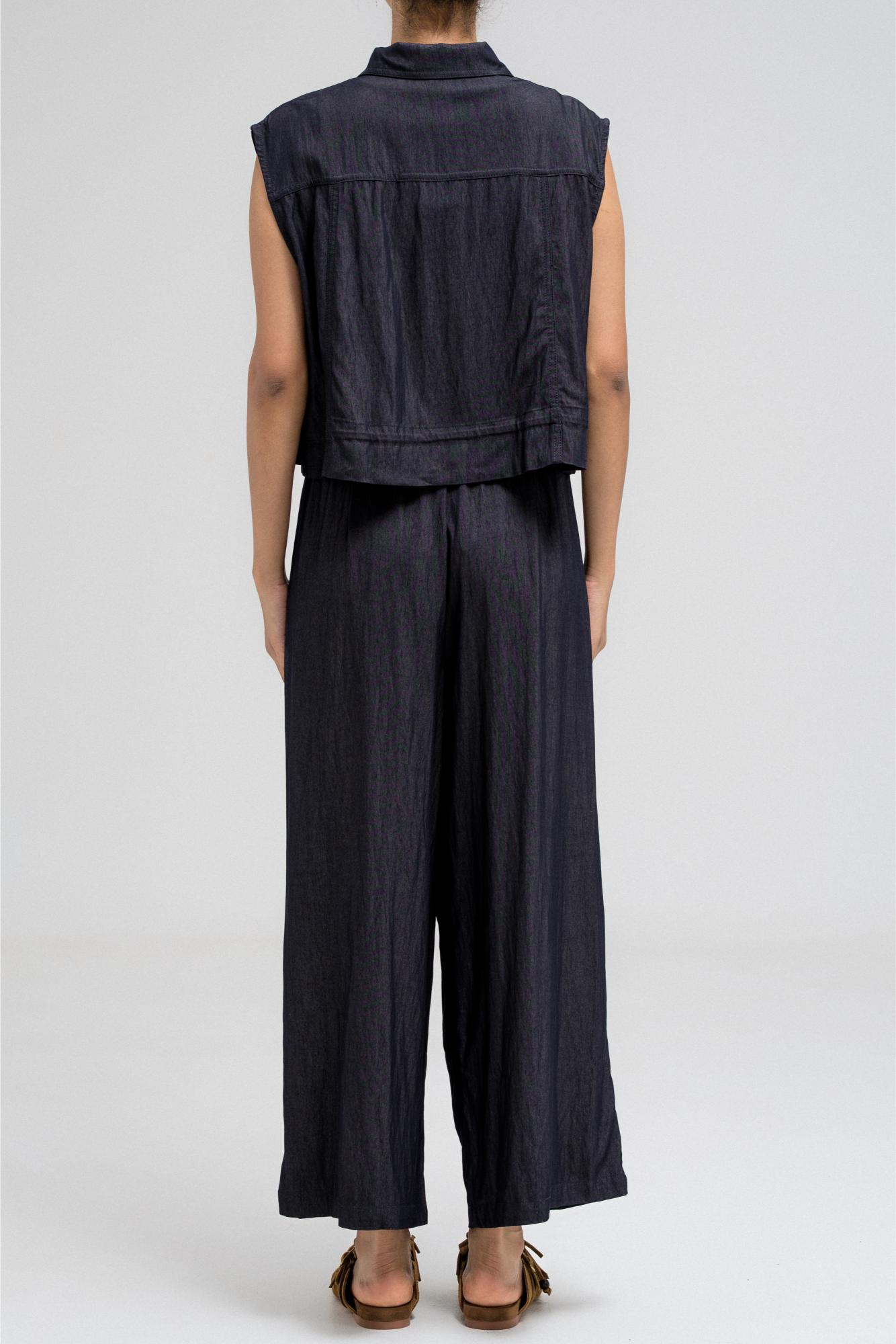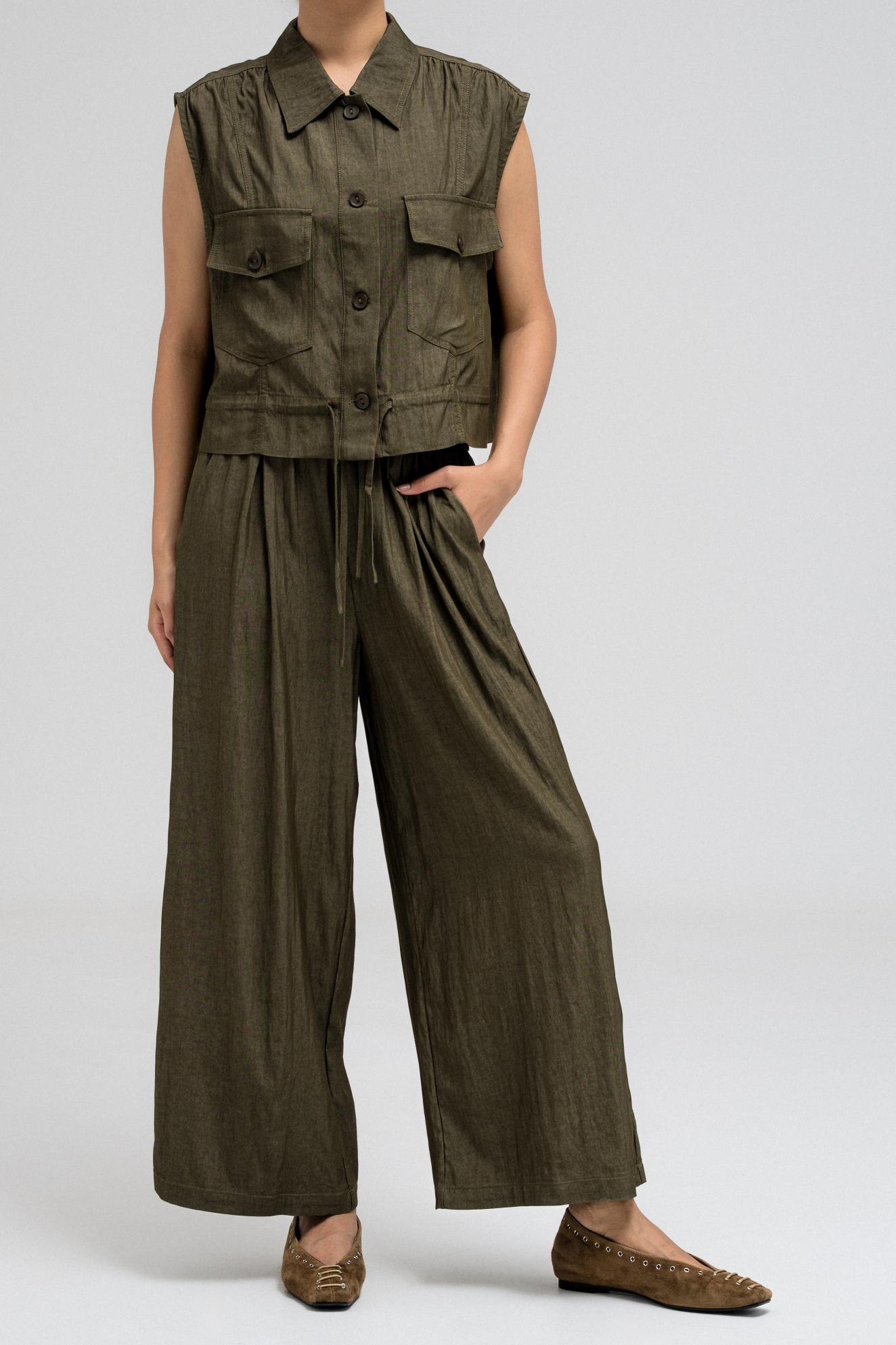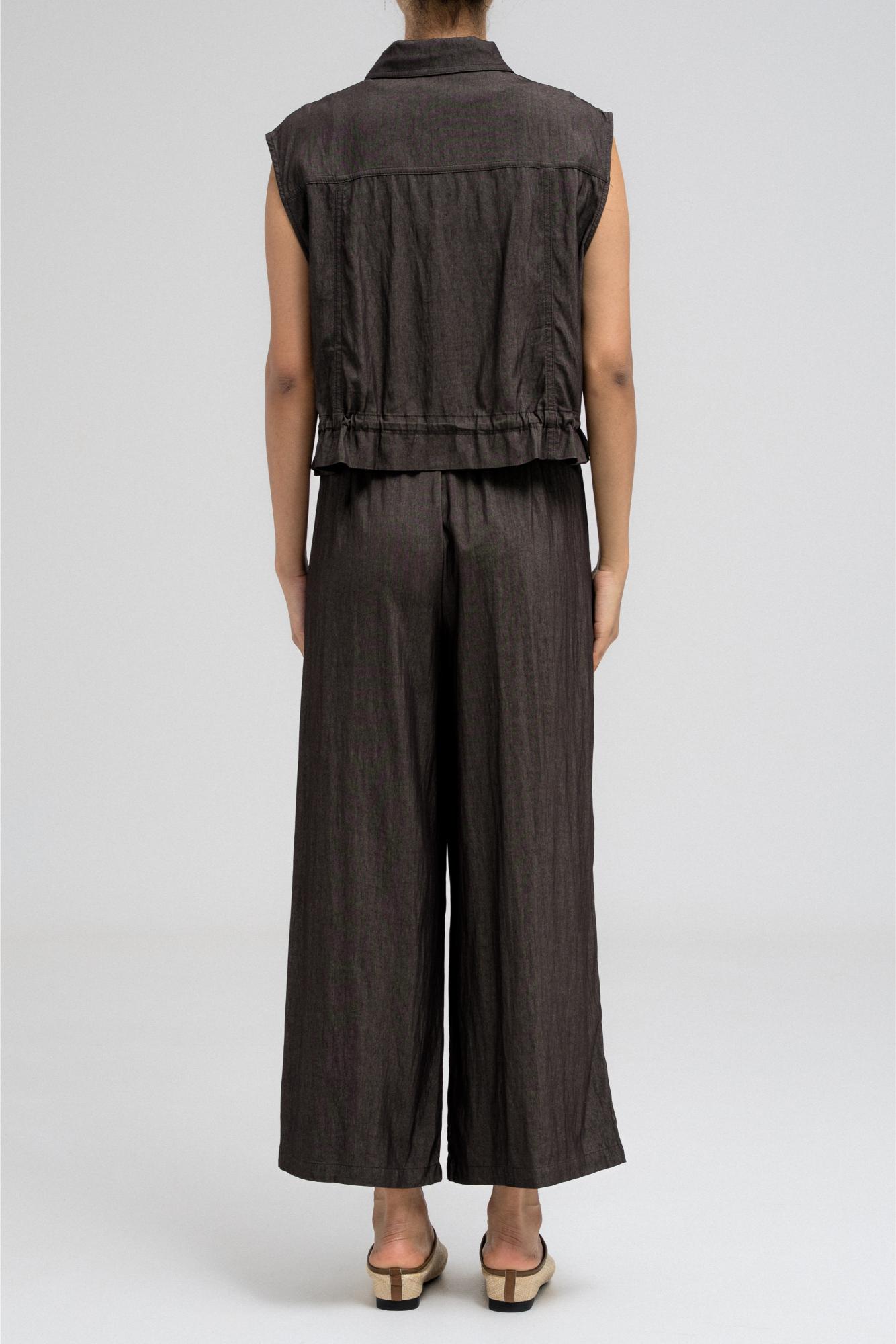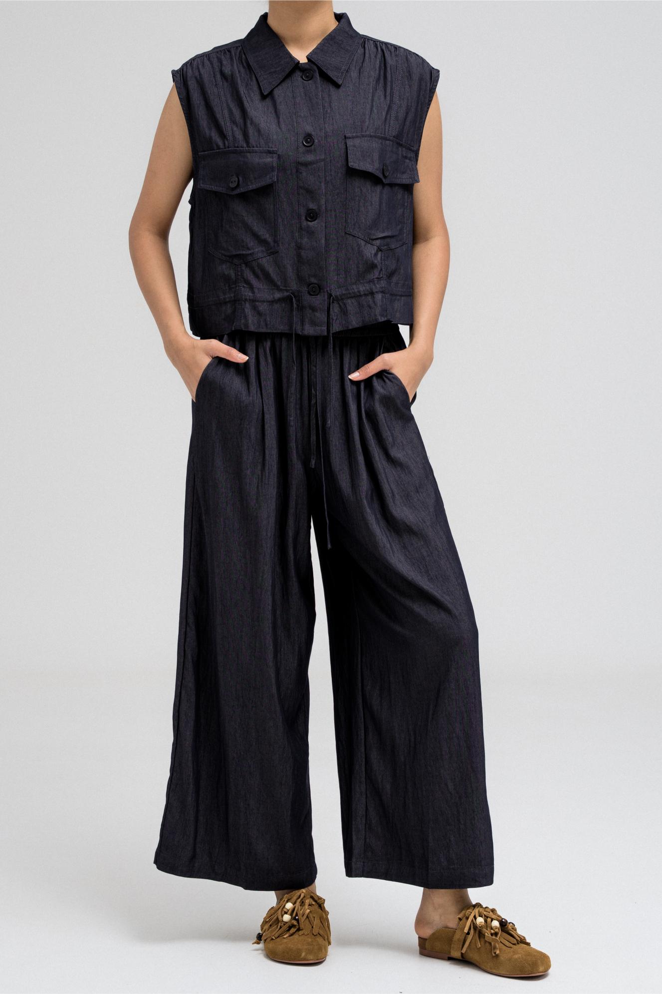 Sleeveless utility-style top features a structured shirt collar and front button closure. It includes two flap chest pockets with button closures, adding to its cargo-inspired look. The hem comes with an attached drawstring, allowing you to cinch and style it as desired. Nice to match with the coordinating pants for a full, put-together outfit.