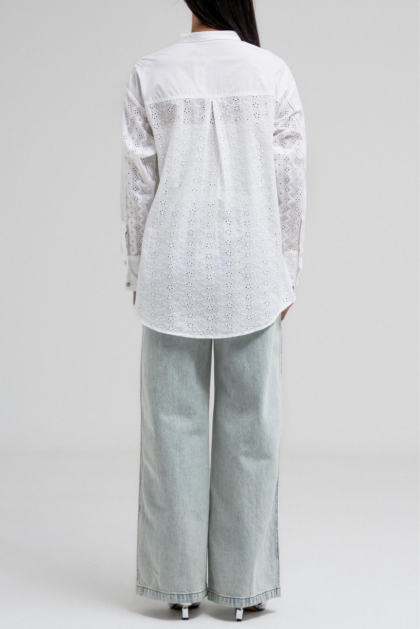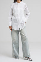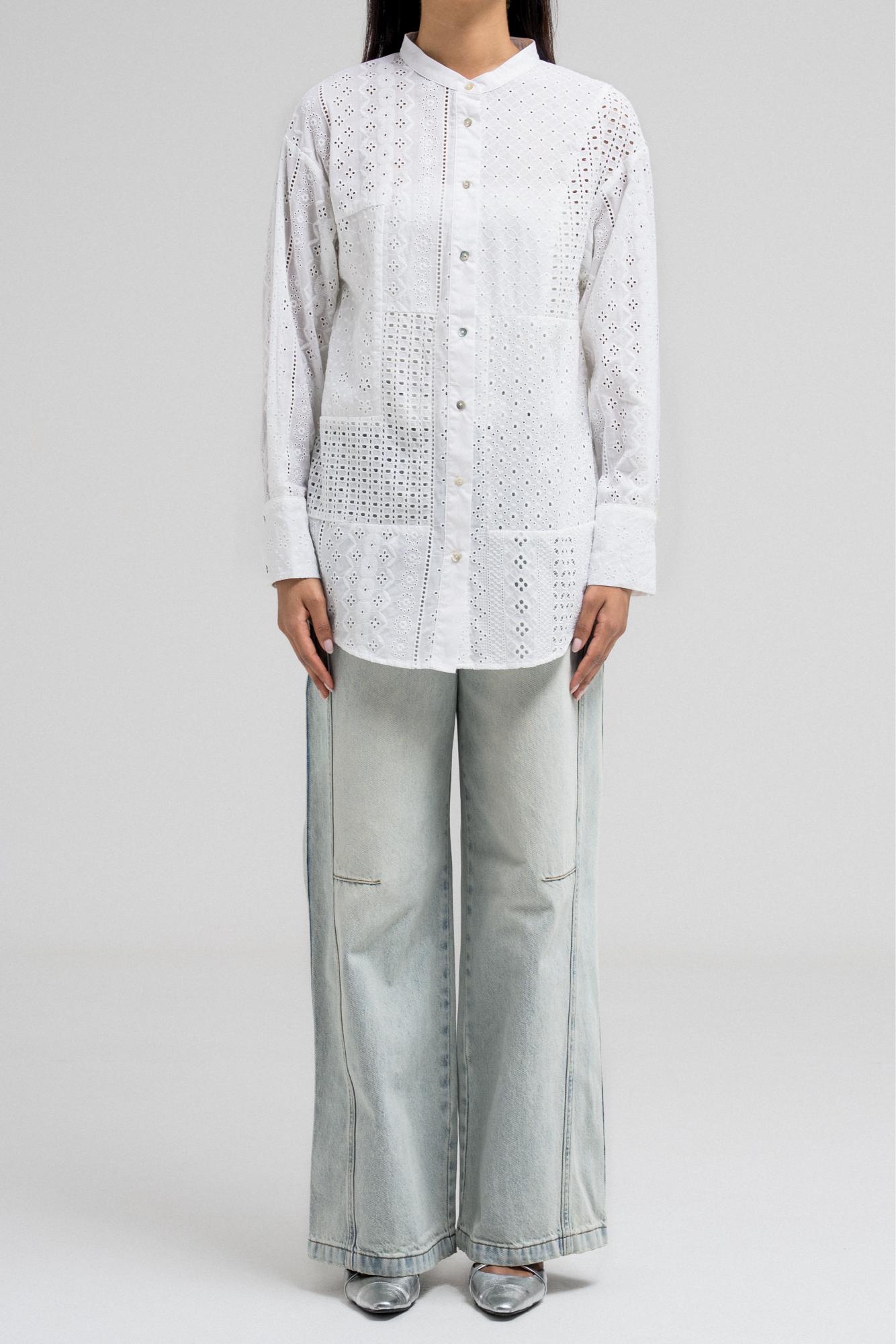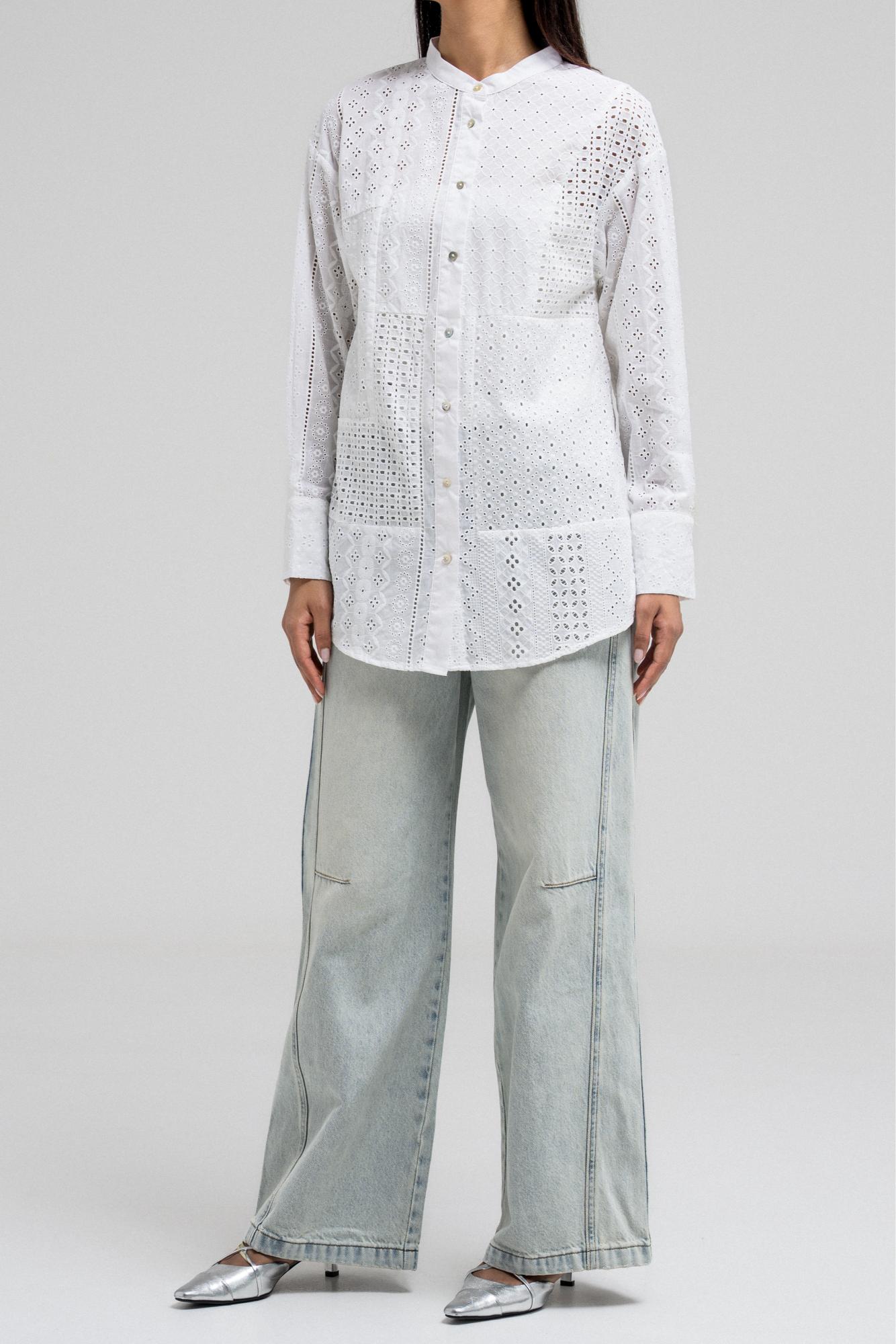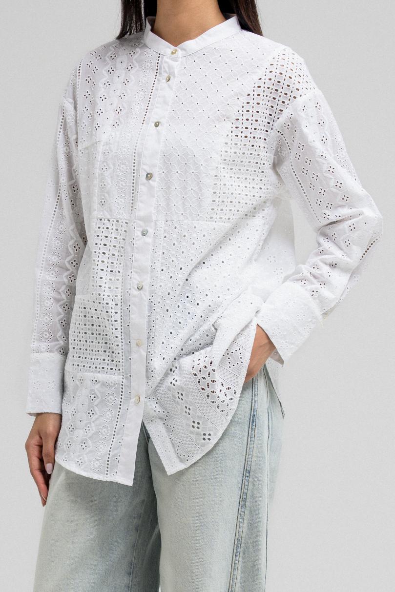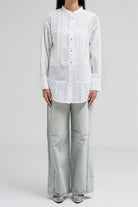 This top is crafted from a light, breathable material and features intricate all-over embroidery that adds a touch of elegance and texture. It includes a classic shirt collar, full front button closure.