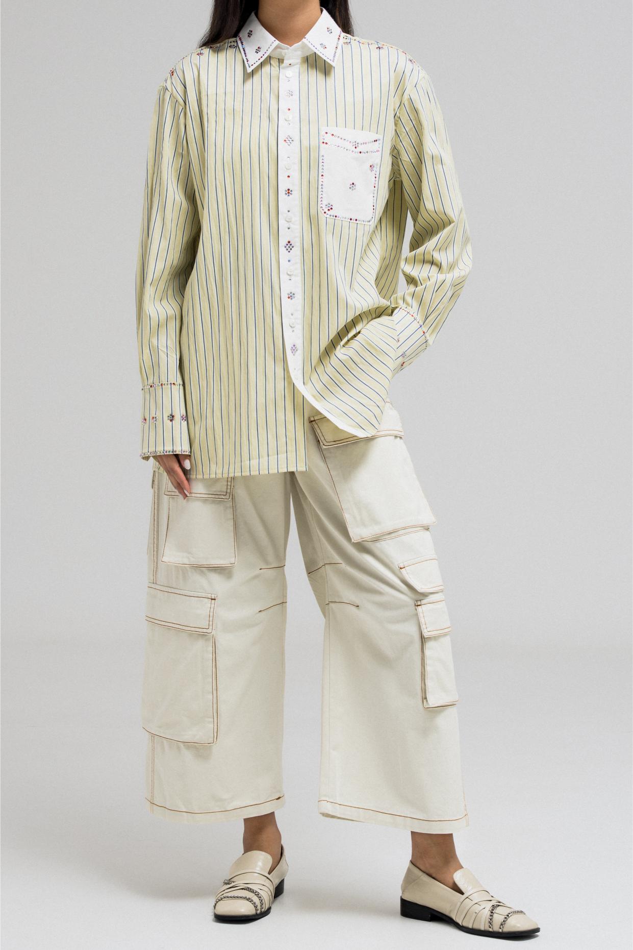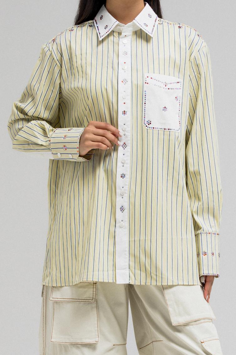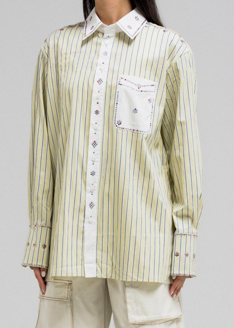 Top features a vertical stripe pattern throughout and a classic shirt collar. The design includes a front button closure and a contrast pocket on the chest. What makes this piece stand out is the rhinestone embellishment that outlines the collar, cuffs, and runs along the button placket adding a sparkling playful touch.
