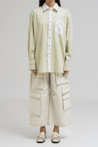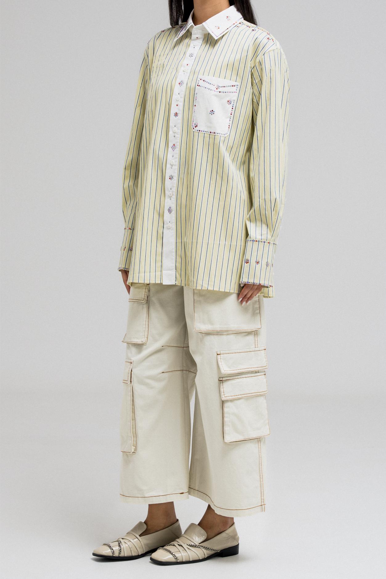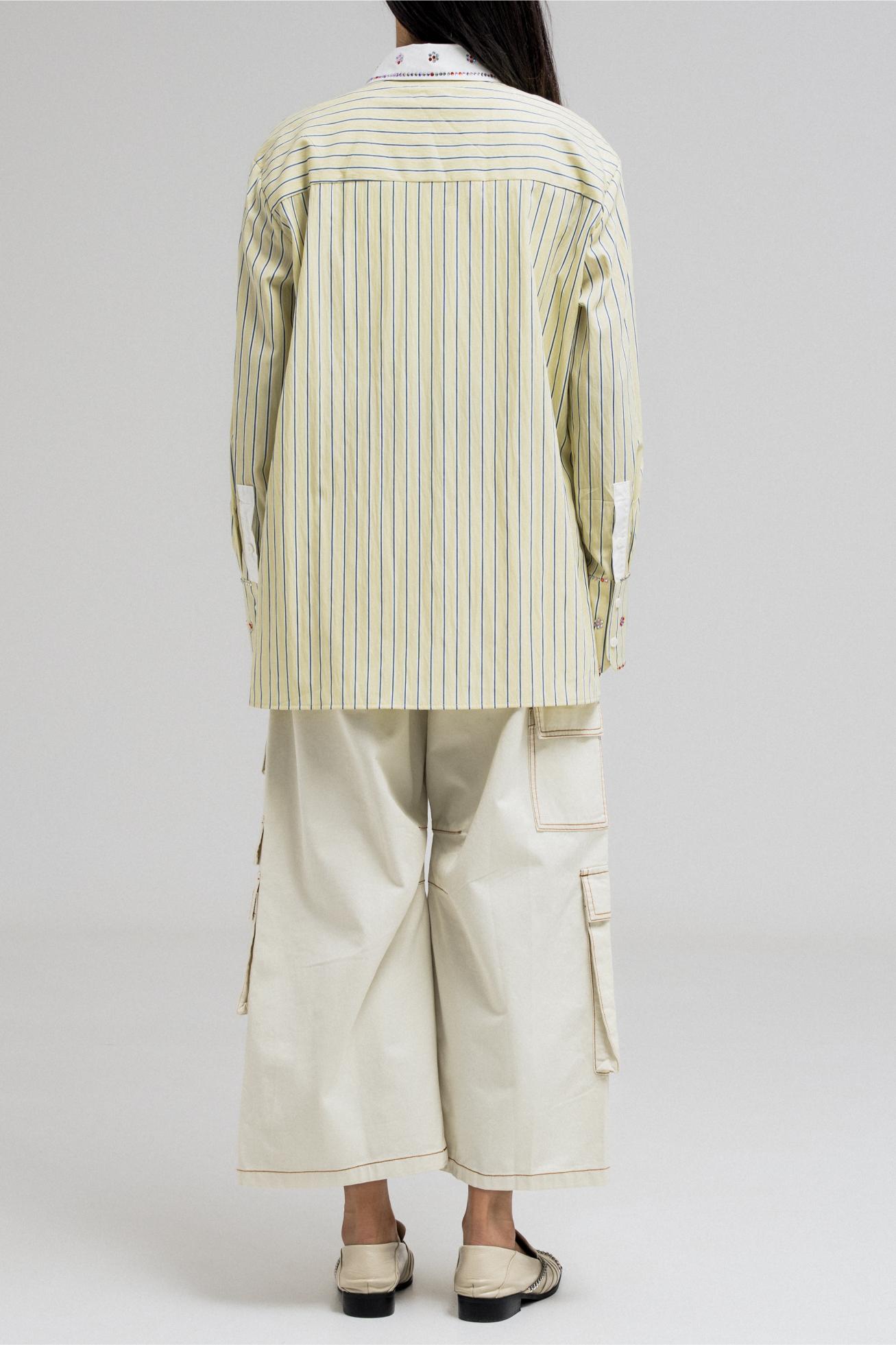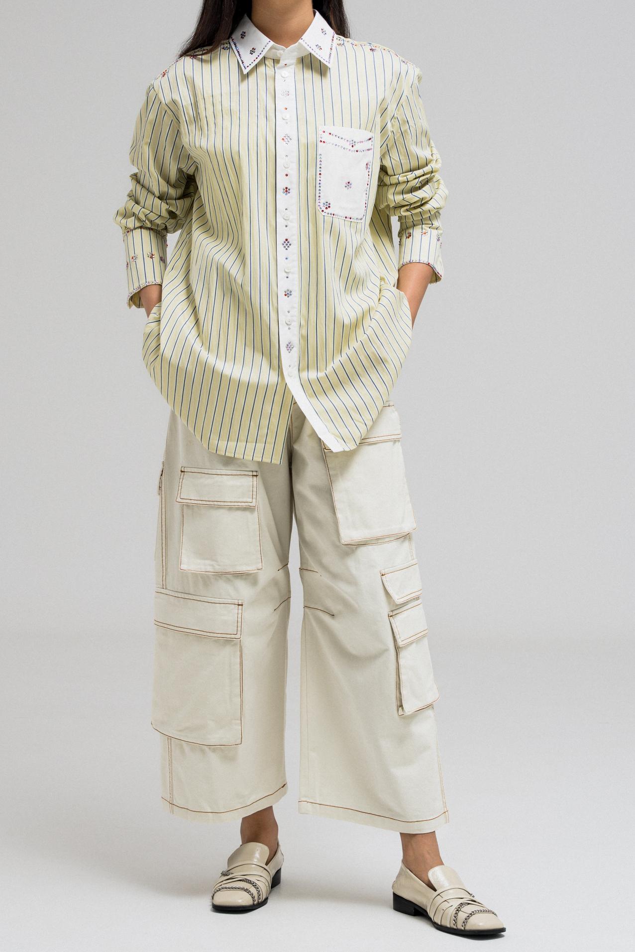 Top features a vertical stripe pattern throughout and a classic shirt collar. The design includes a front button closure and a contrast pocket on the chest. What makes this piece stand out is the rhinestone embellishment that outlines the collar, cuffs, and runs along the button placket adding a sparkling playful touch.