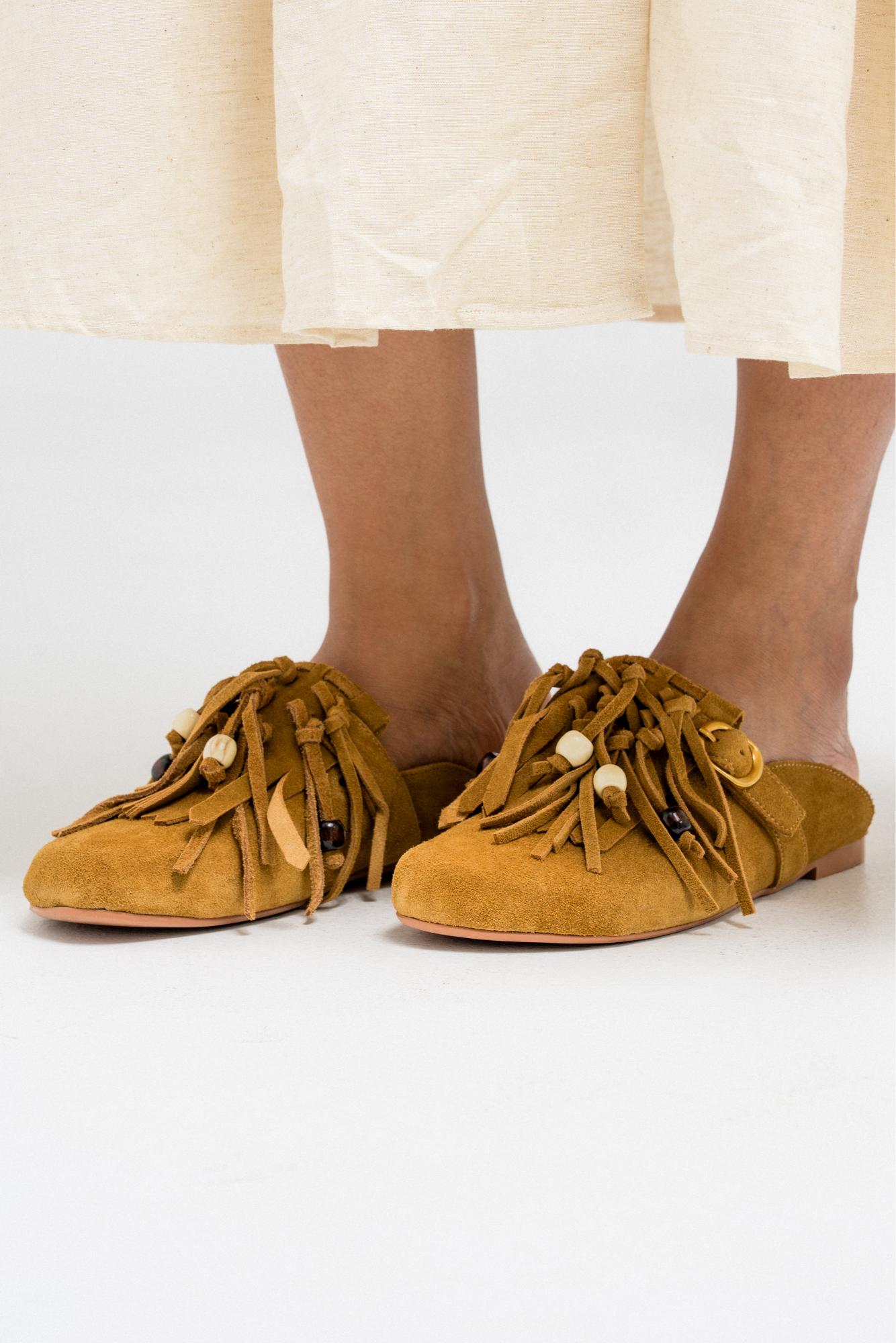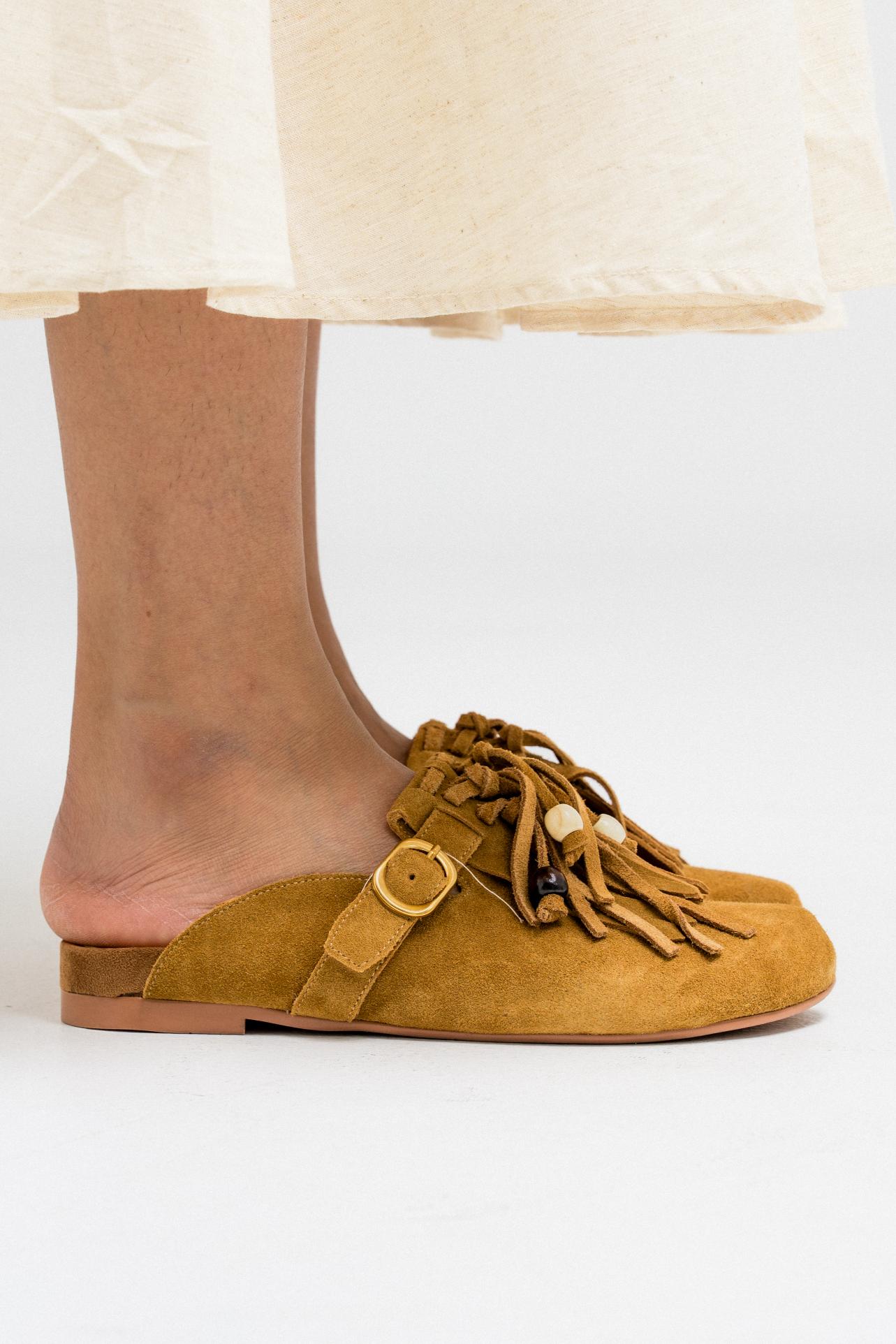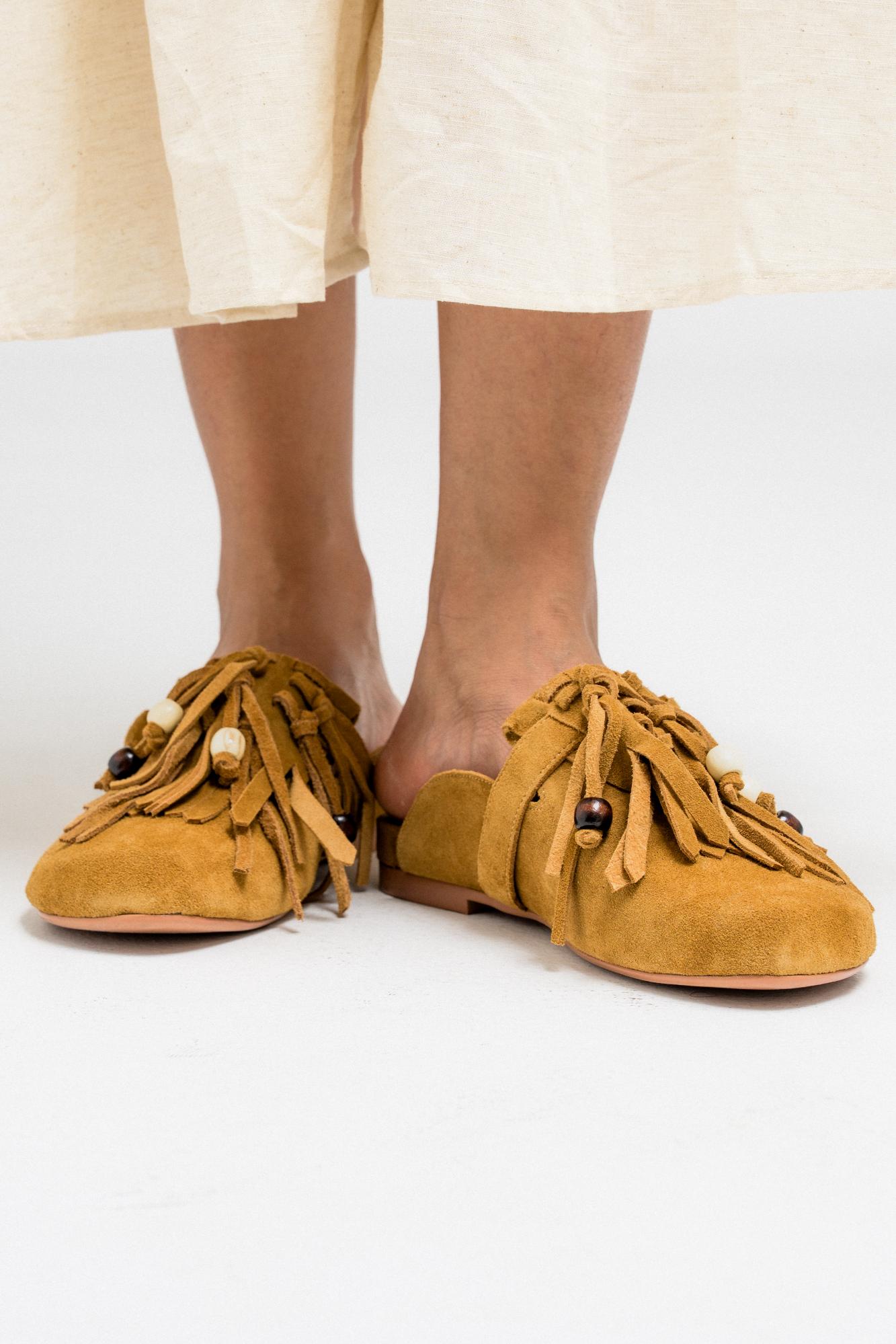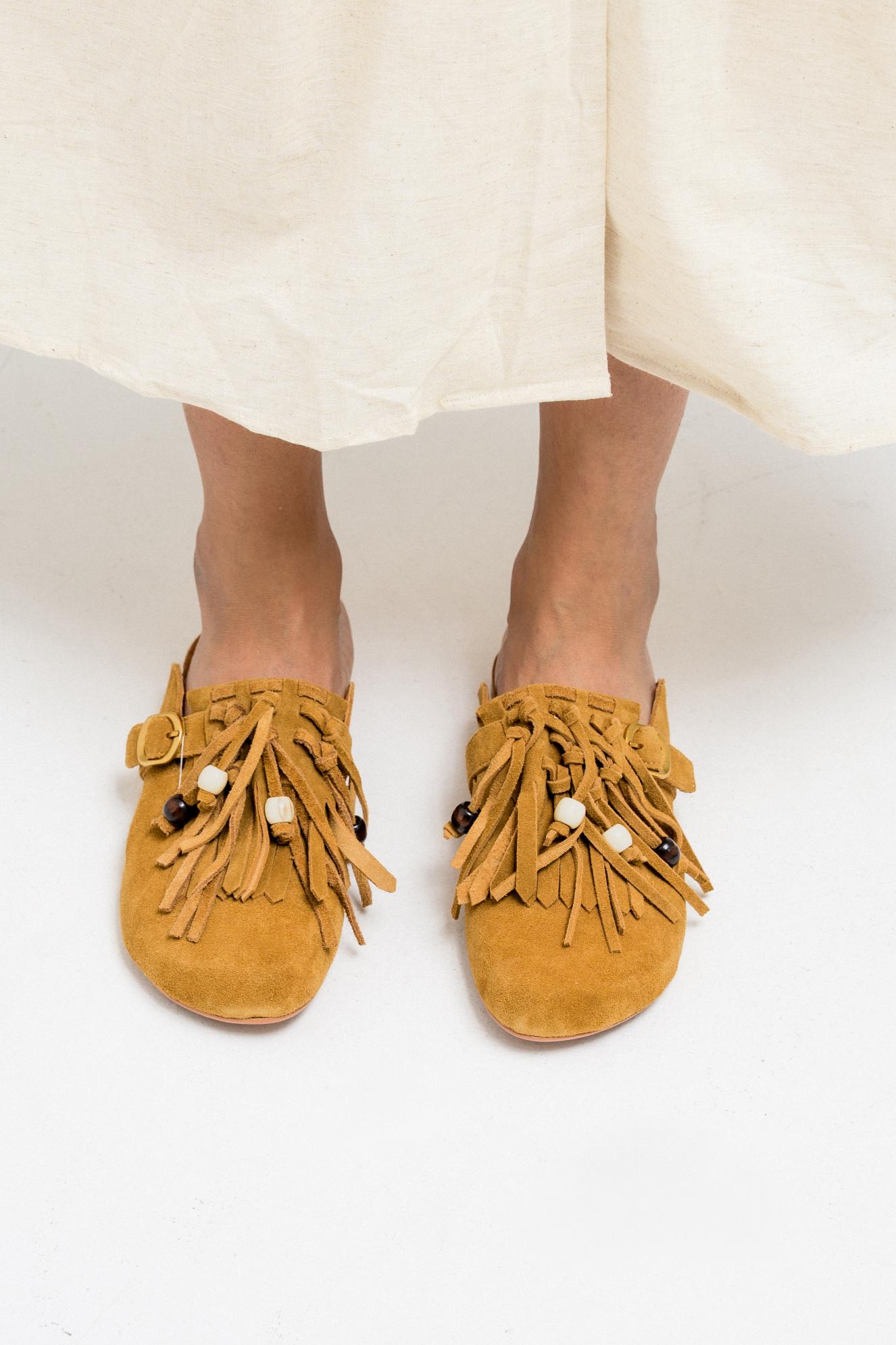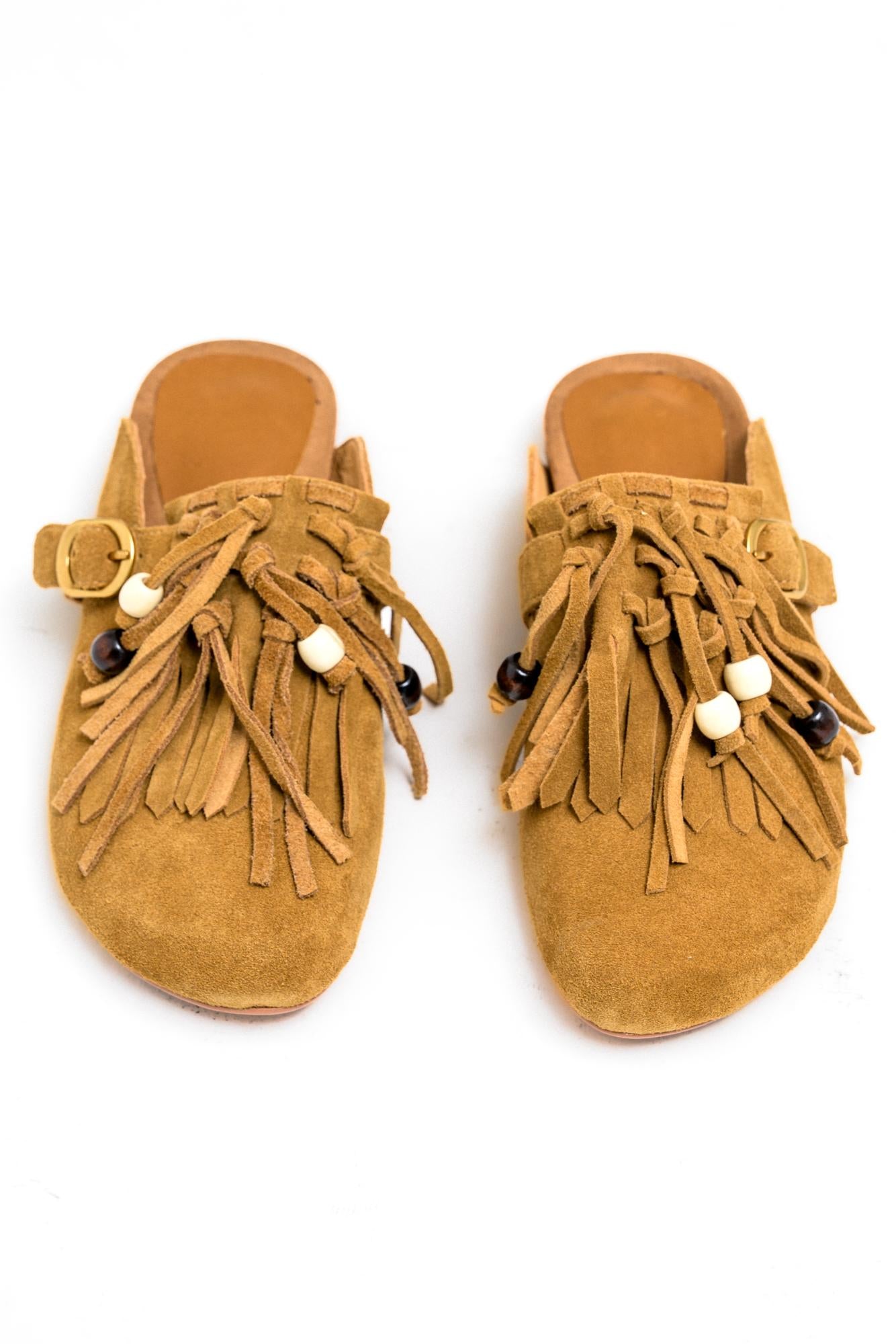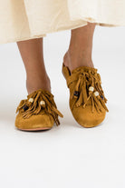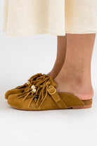 These slip-on shoes feature a soft suede finish with layered fringe detailing on top, giving them a fun and textured look. Decorated with small beads button accents and a side buckle, they add a playful twist to your outfit while staying comfortable and easy to wear.