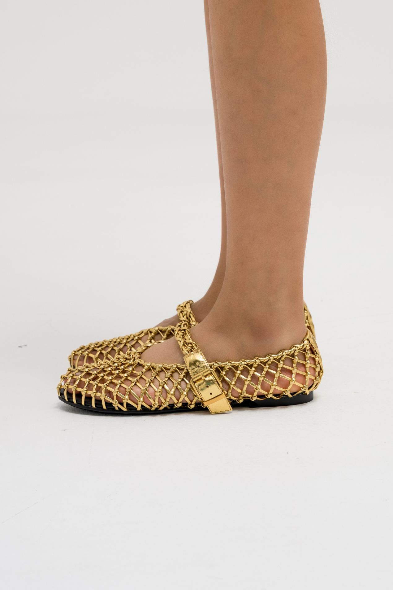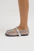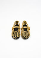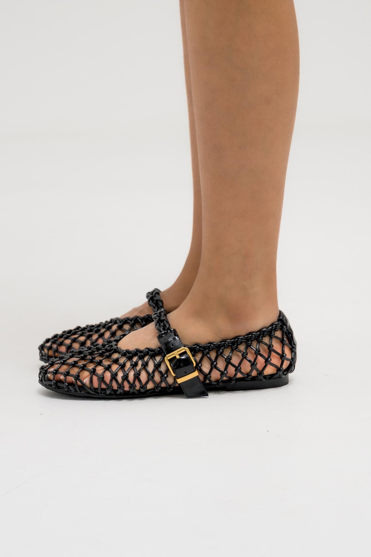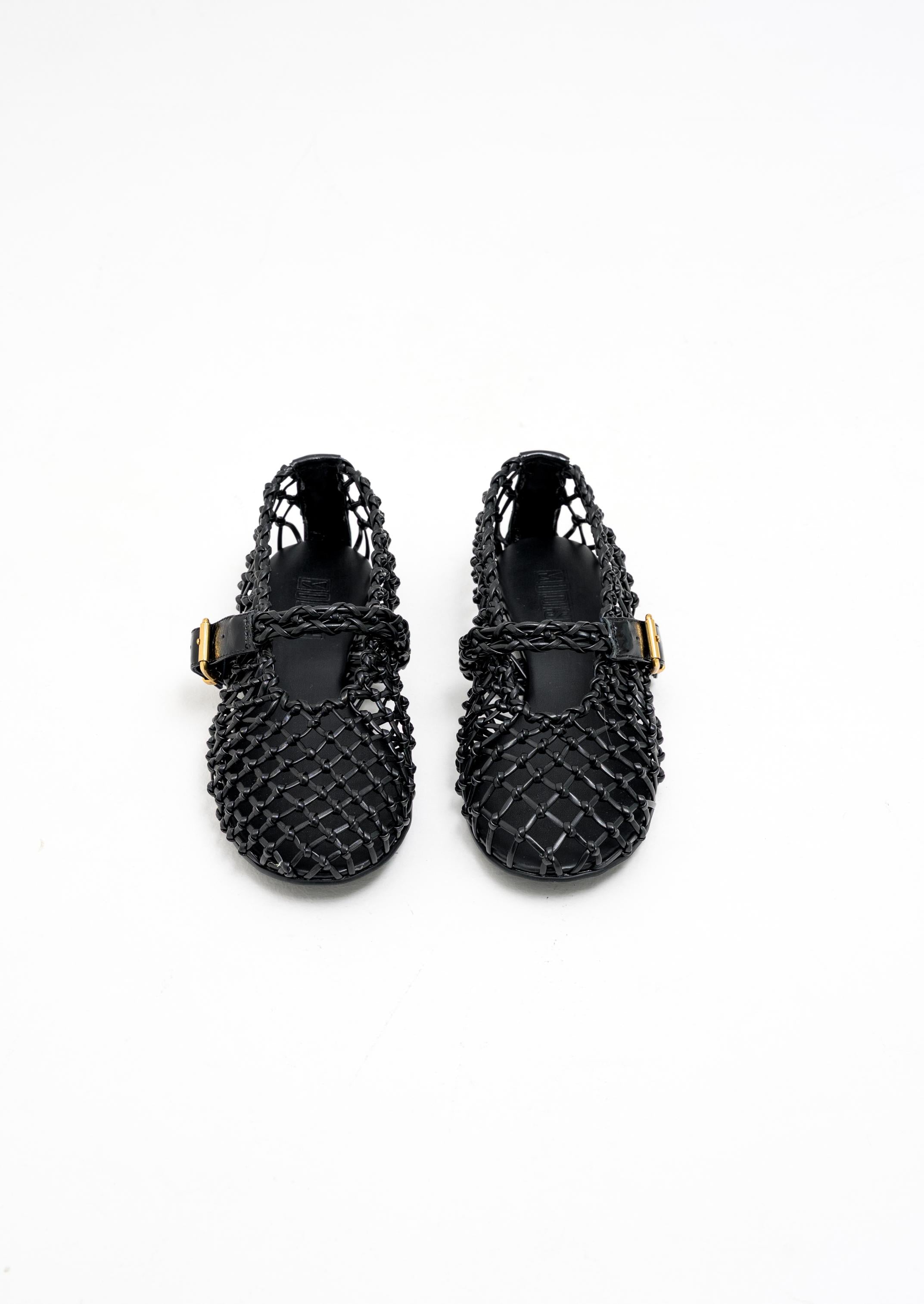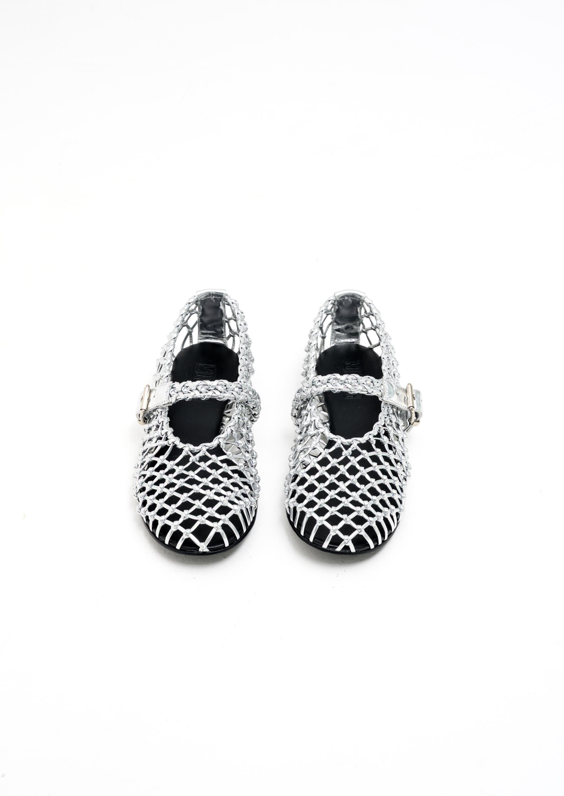Mesh flats featuring an intricate netted design for a bold statement. Designed with a classic Mary Jane design, these shoes include a secure strap with a metallic buckle closure. The open-weave structure offers breathability and a lightweight feel