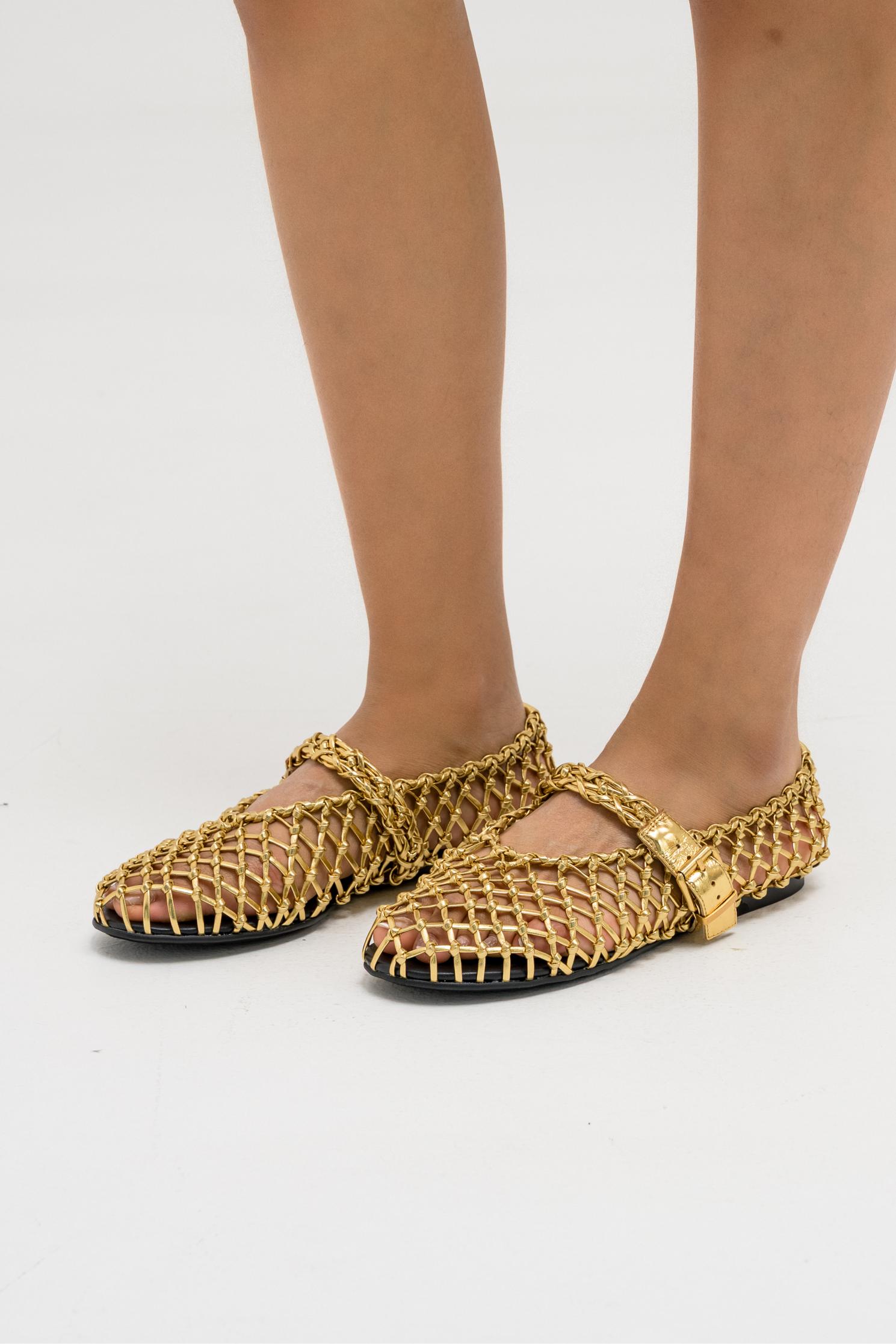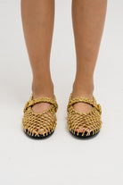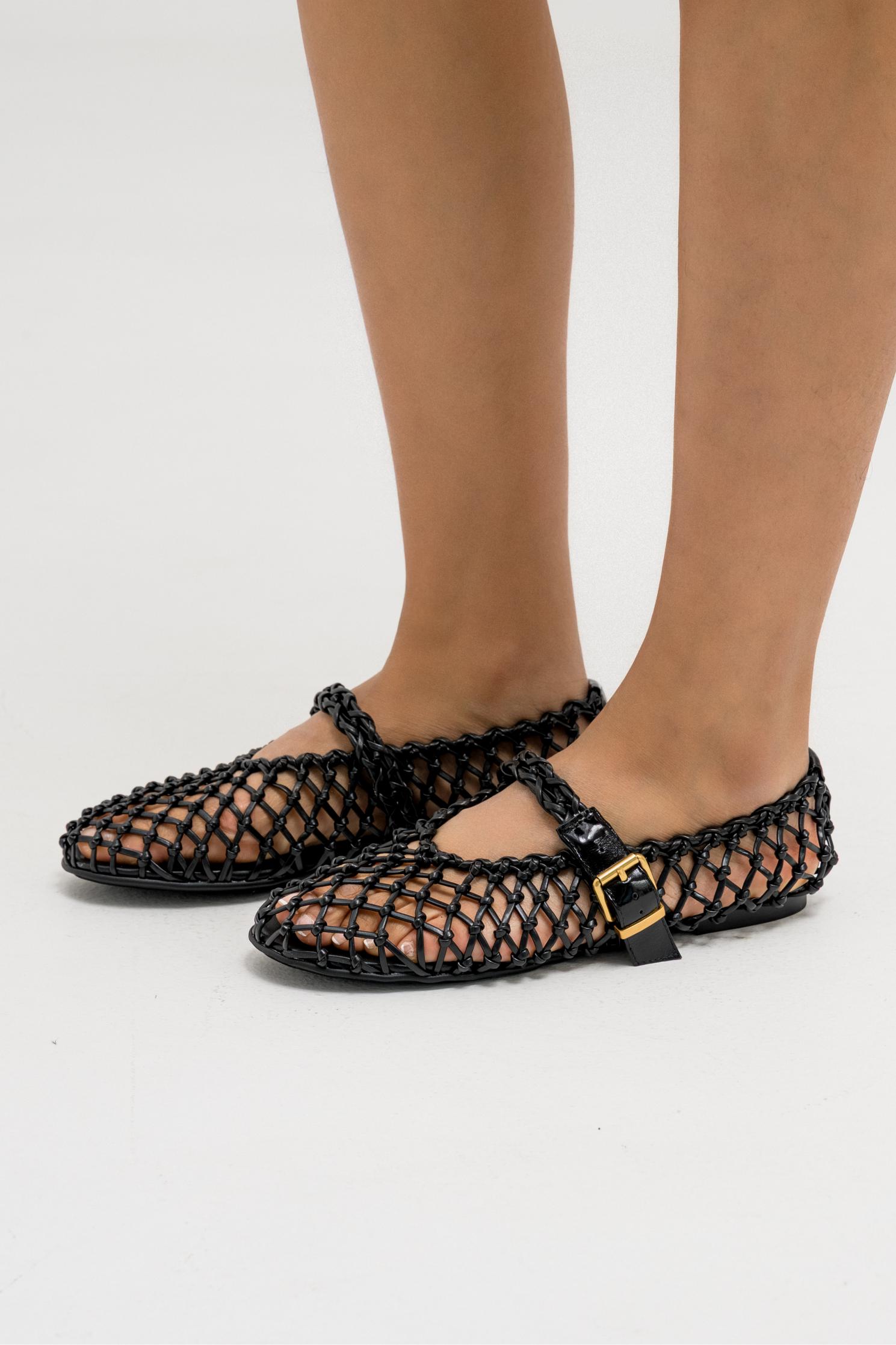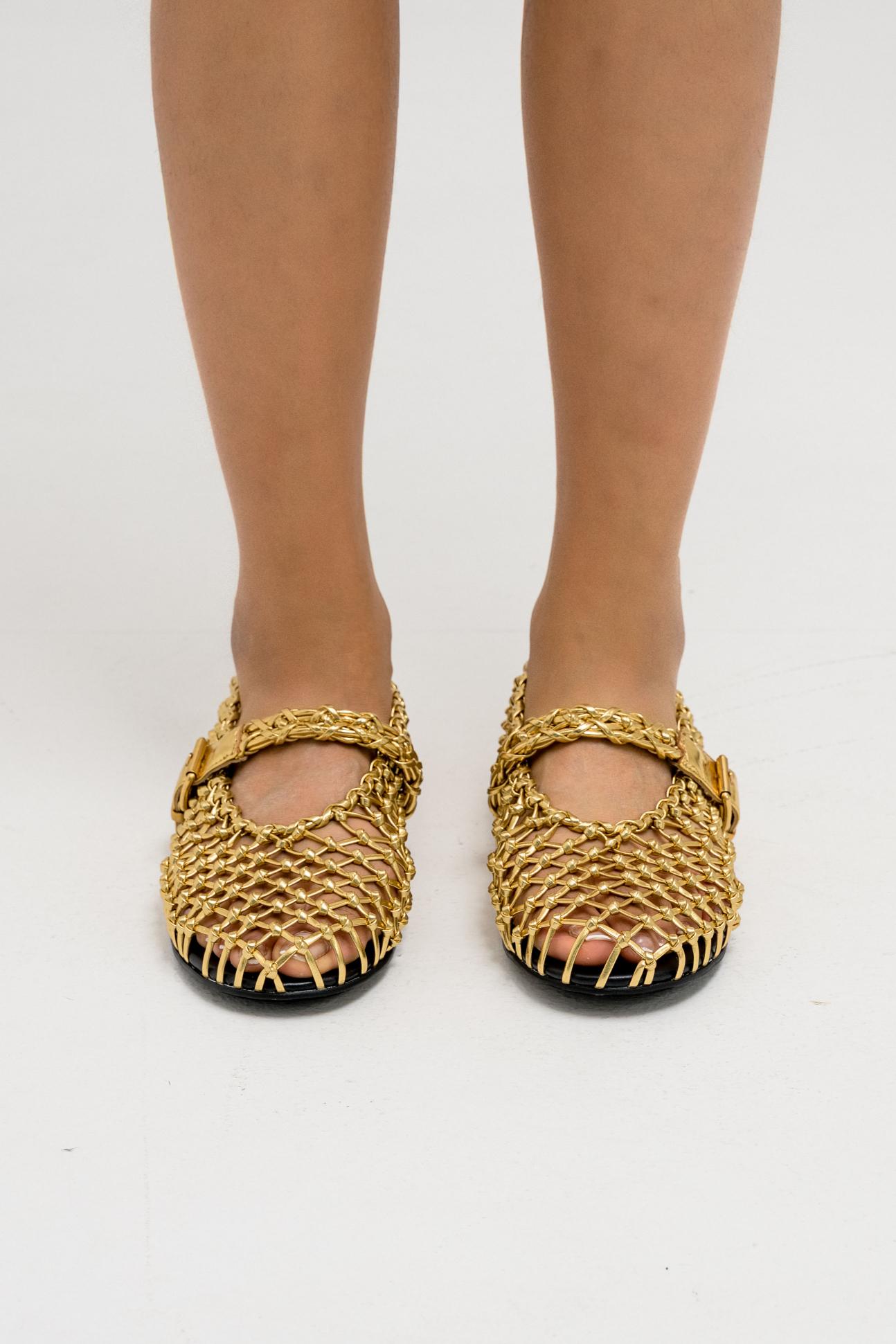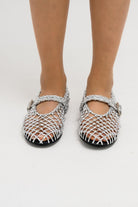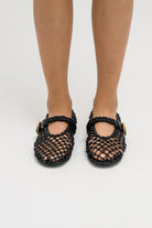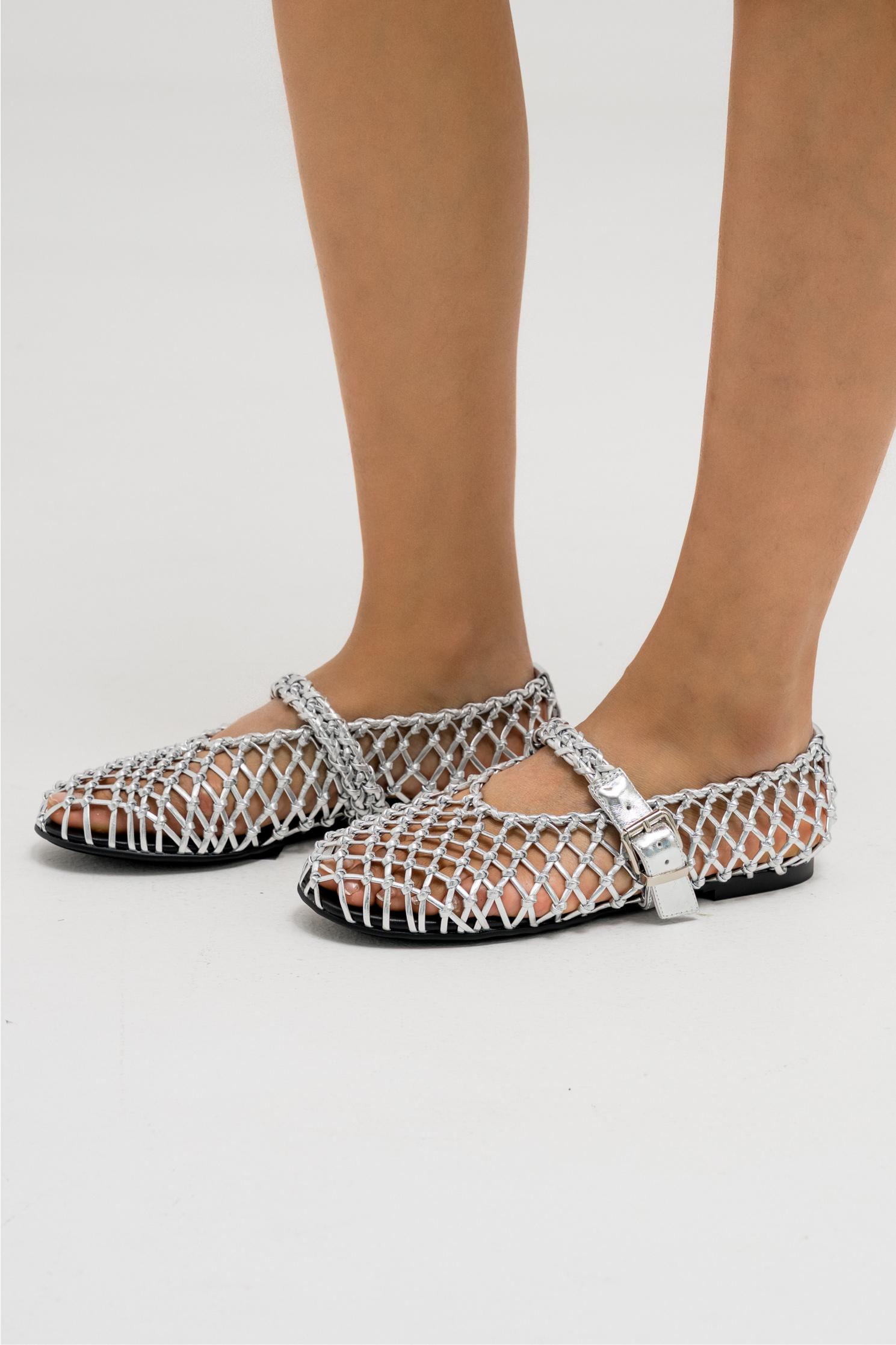 Mesh flats featuring an intricate netted design for a bold statement. Designed with a classic Mary Jane design, these shoes include a secure strap with a metallic buckle closure. The open-weave structure offers breathability and a lightweight feel