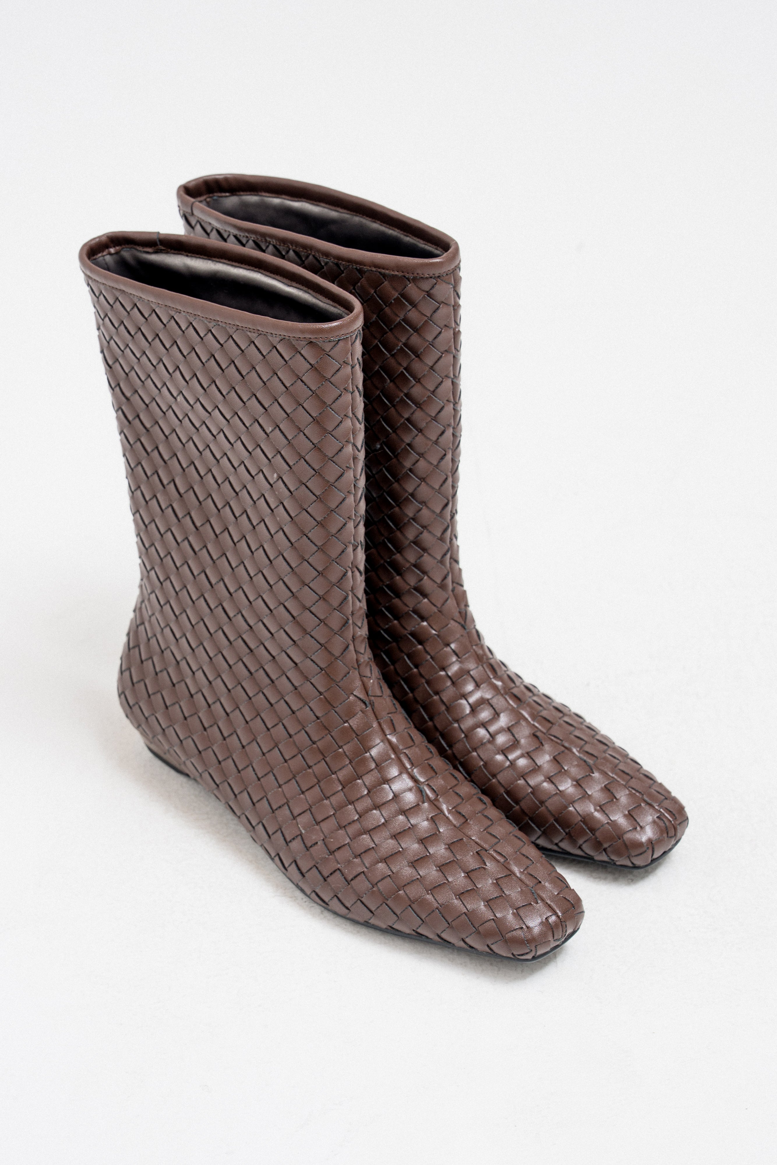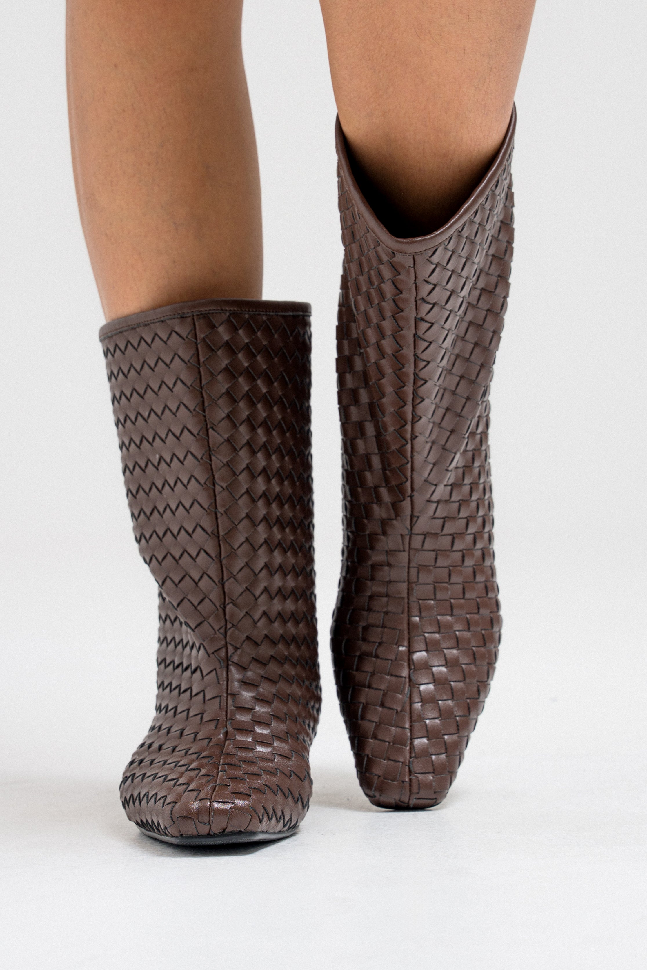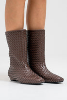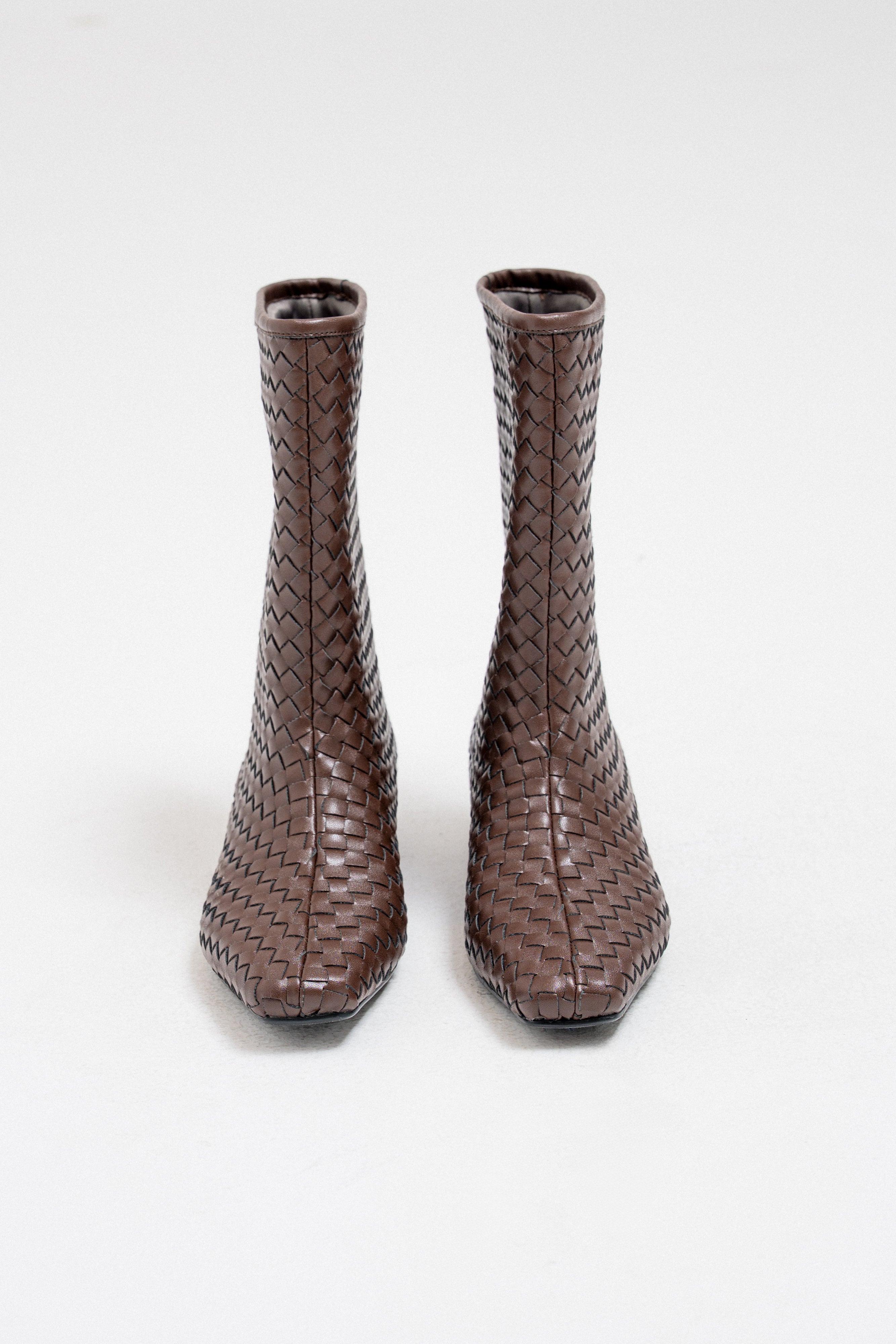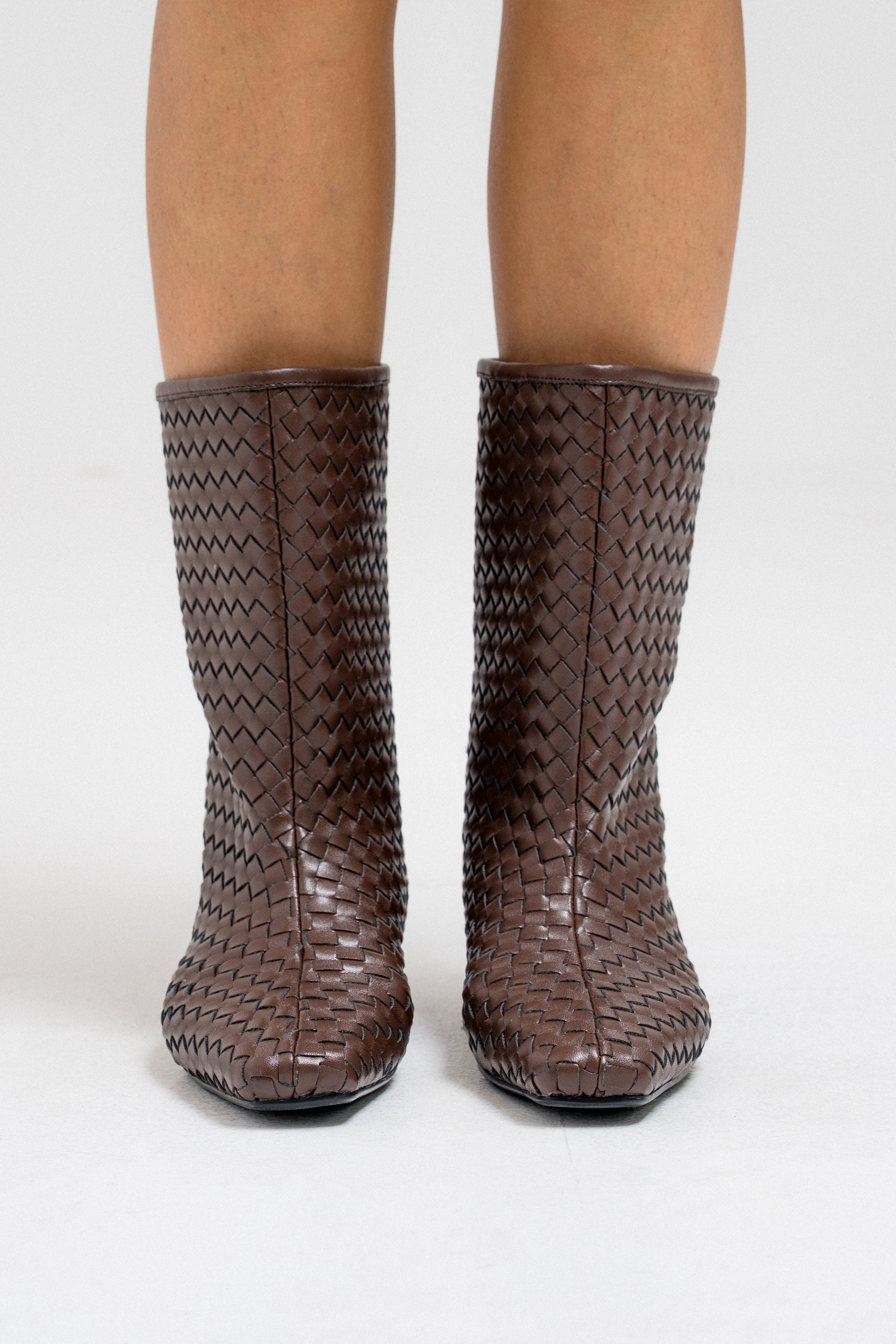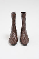 Sleek woven-textured ankle boots crafted from soft faux leather. The minimal pointed-toe design and block heel create a refined yet contemporary look, ideal for both casual and formal outfits.