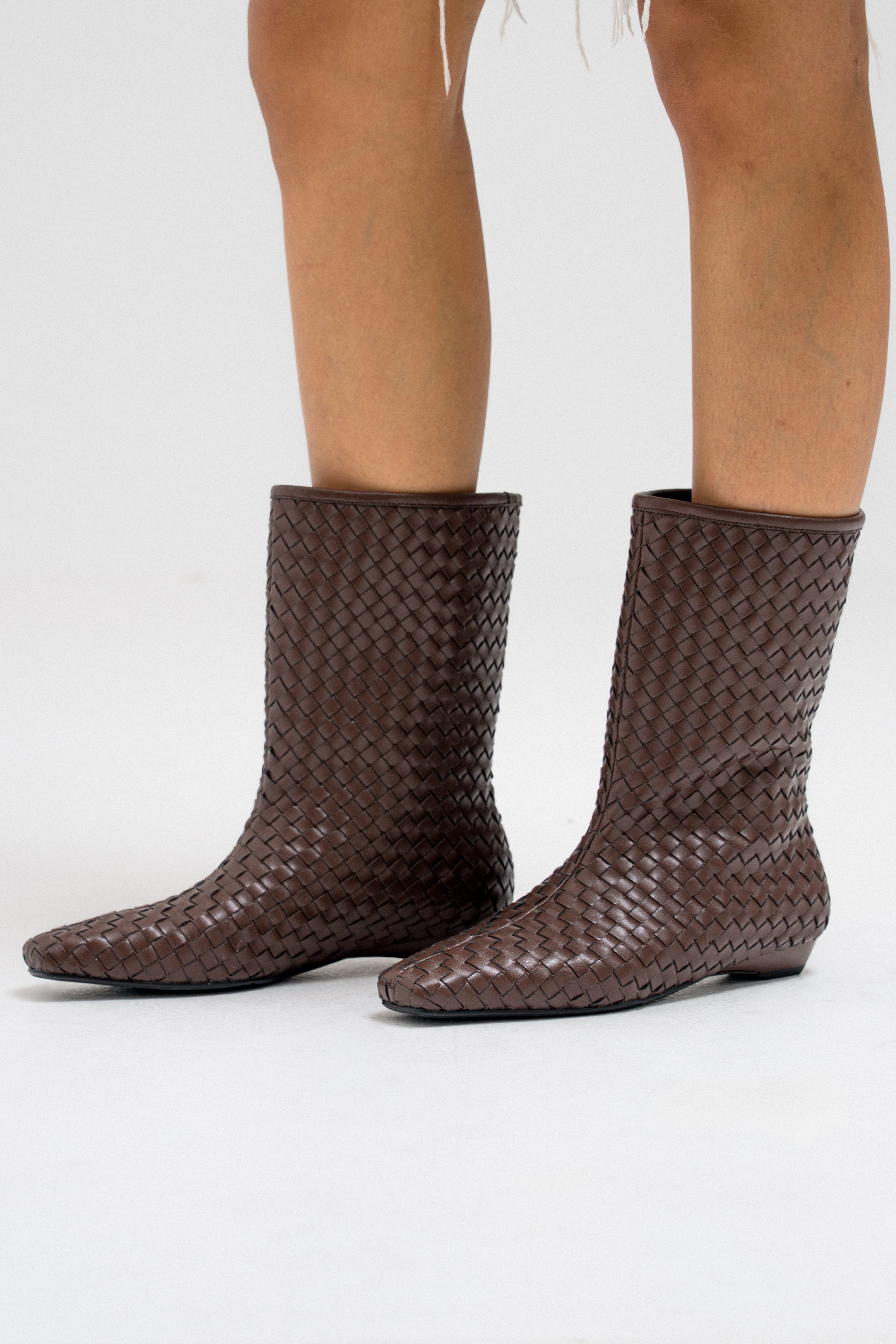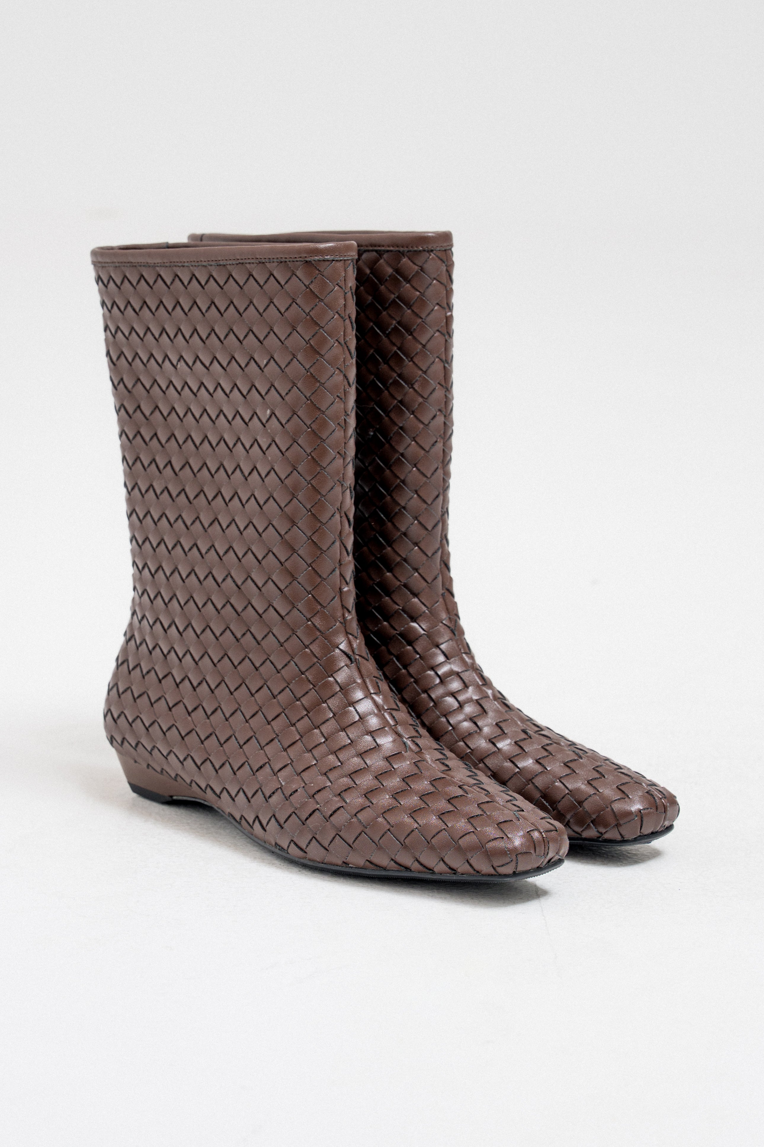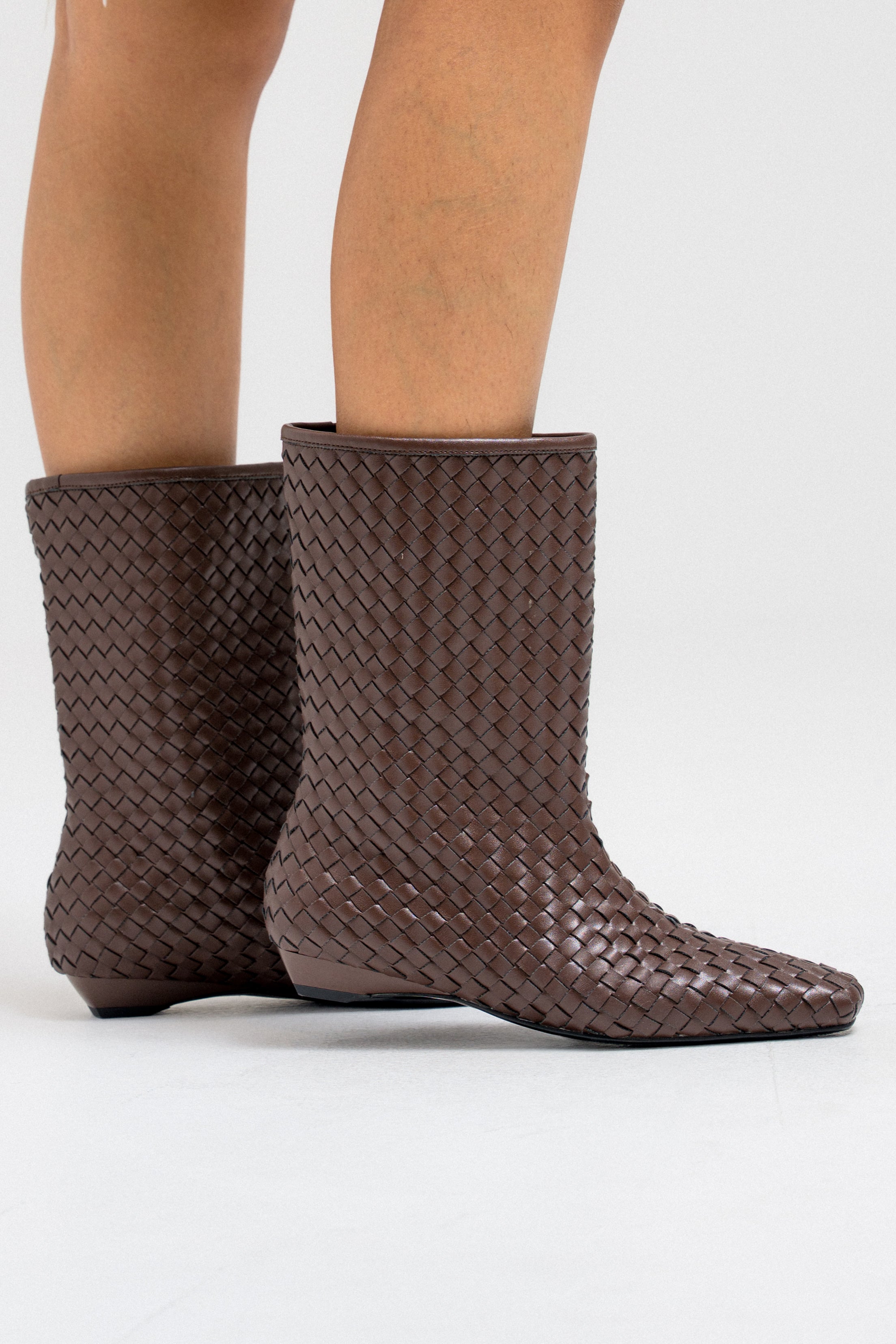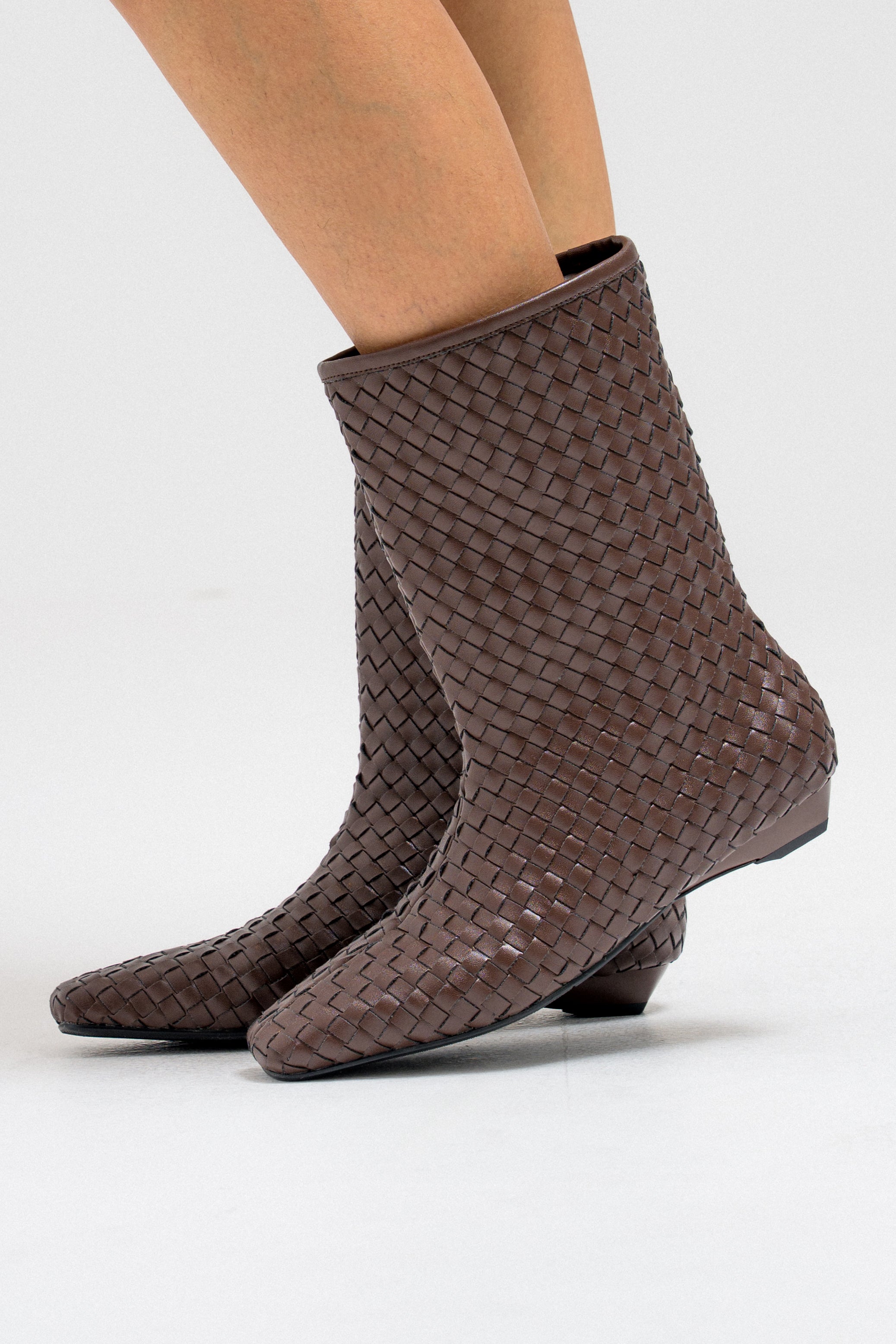 Sleek woven-textured ankle boots crafted from soft faux leather. The minimal pointed-toe design and block heel create a refined yet contemporary look, ideal for both casual and formal outfits.