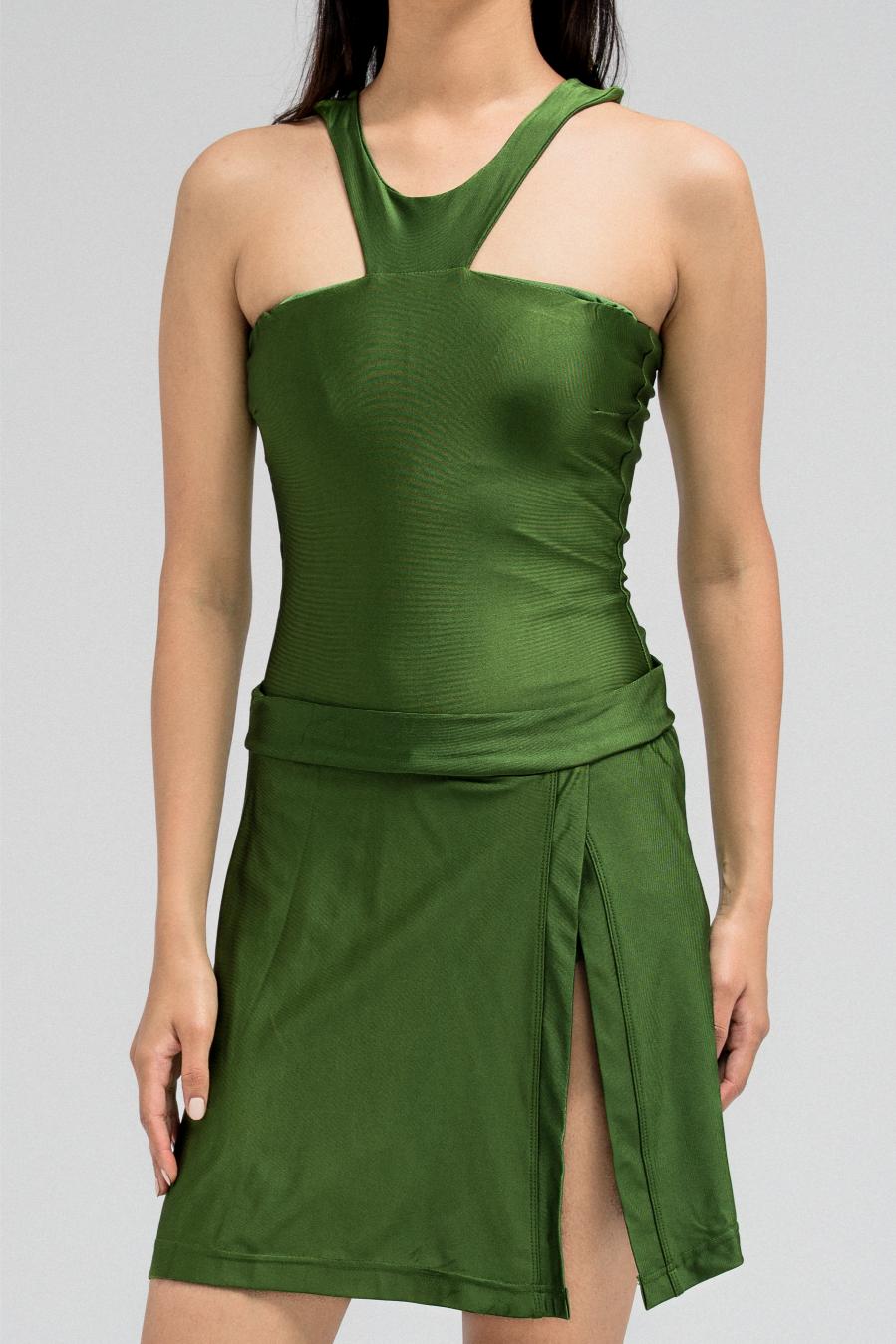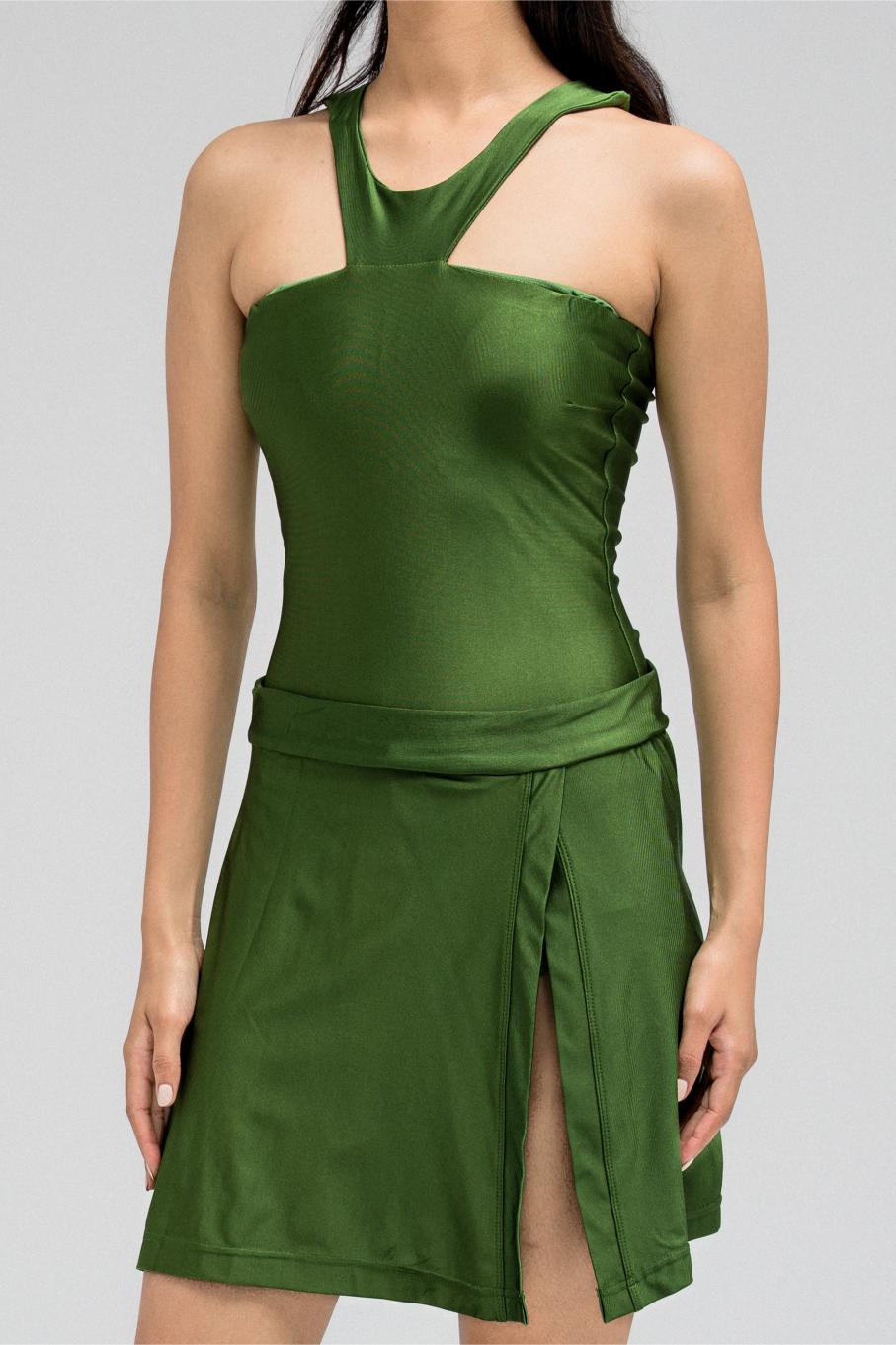 Swim set features a one-piece swimsuit with a wrap-around neck design. The swimsuit includes built-in padding for extra support and comfort. It’s paired with a matching skirt that is designed with hidden shorts underneath for more coverage and ease of movement. The skirted shorts feature an elastic waistband for a comfortable fit.
