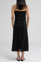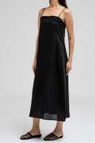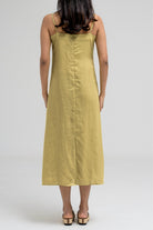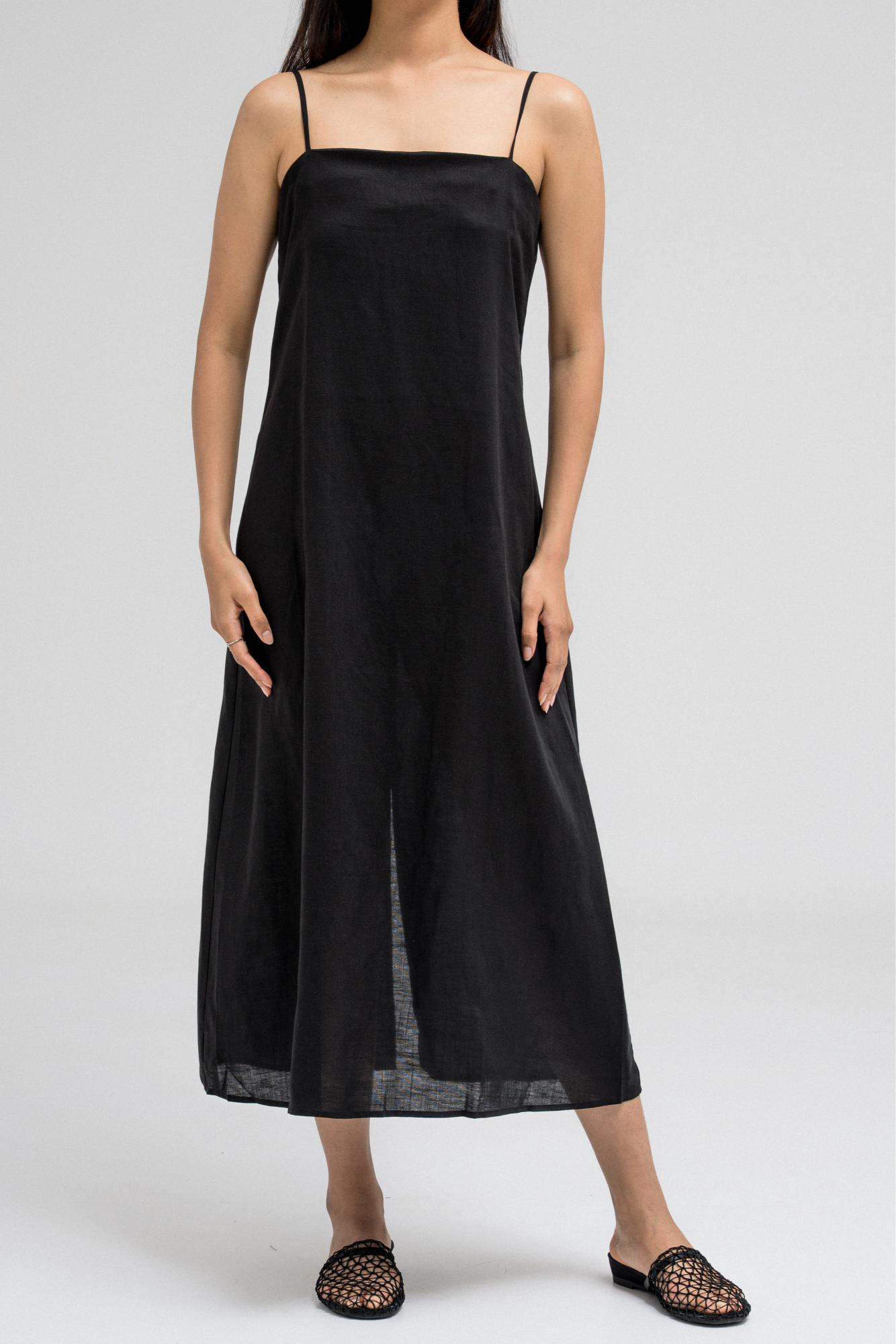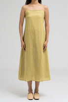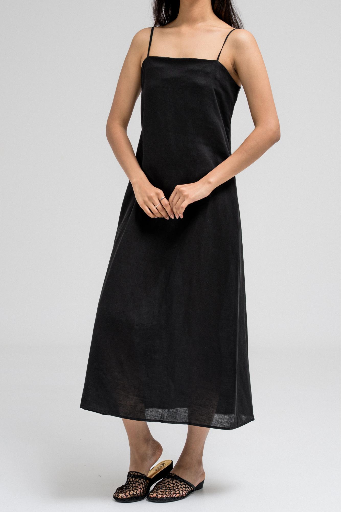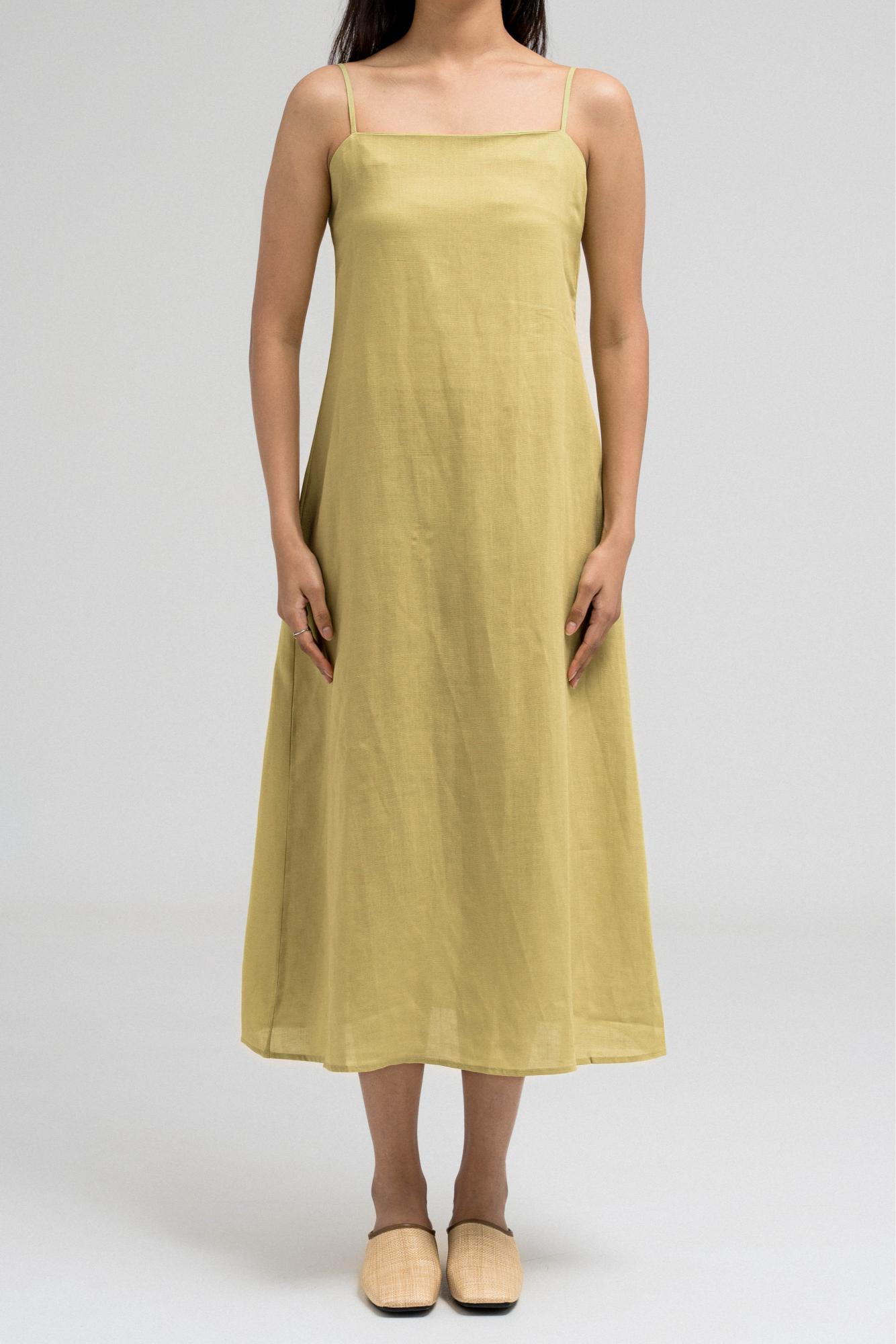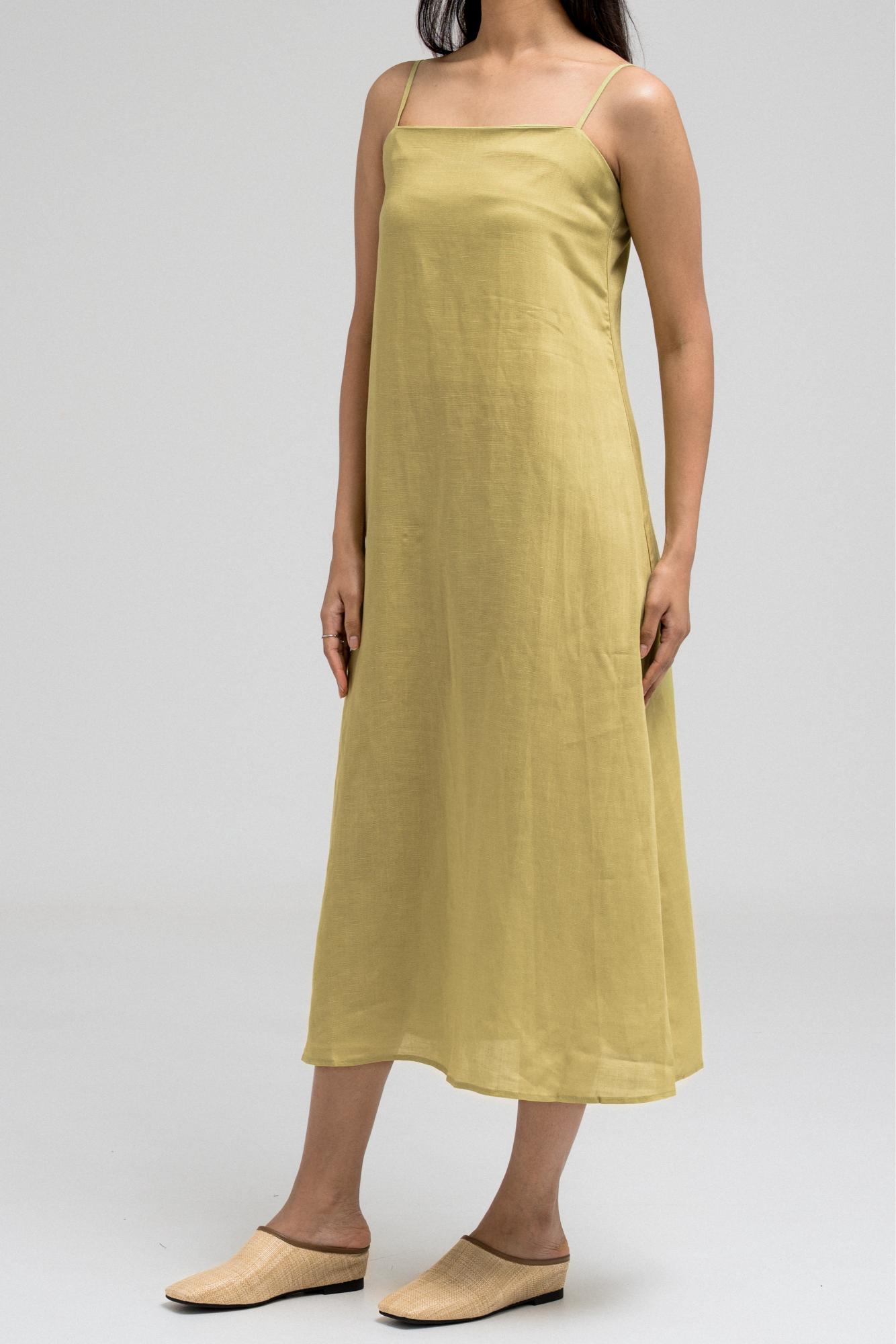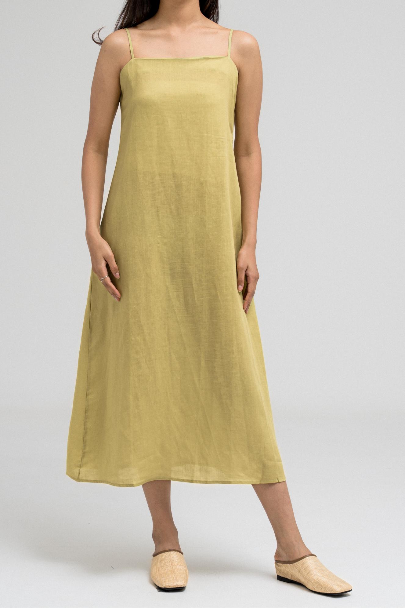 This dress is crafted from a lightweight linen fabric. It features thin shoulder straps and a long, flattering silhouette. Designed with a back zipper closure for ease, it’s ideal to pair with its matching short-sleeve linen shirt for a coordinated and stylish outfit.