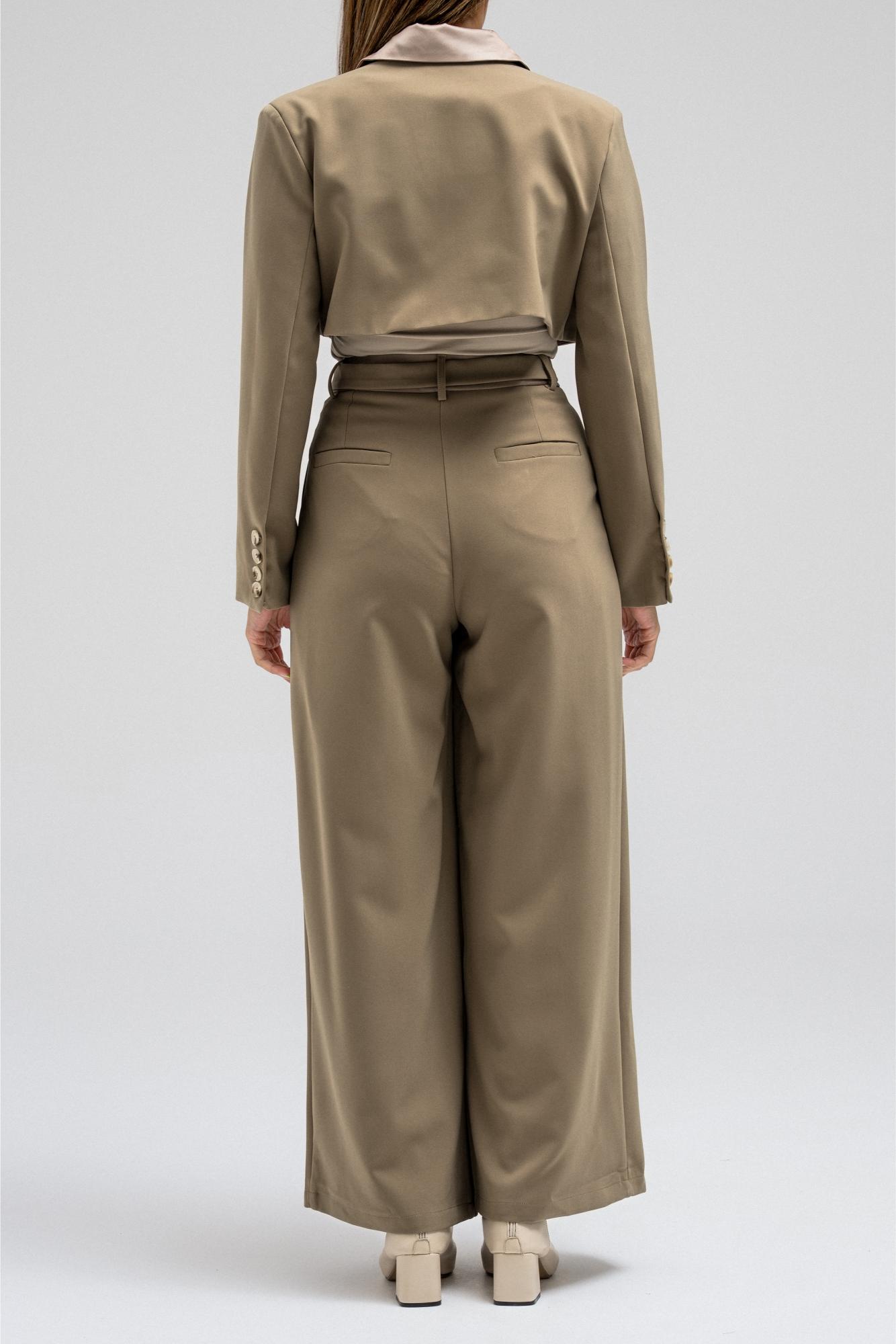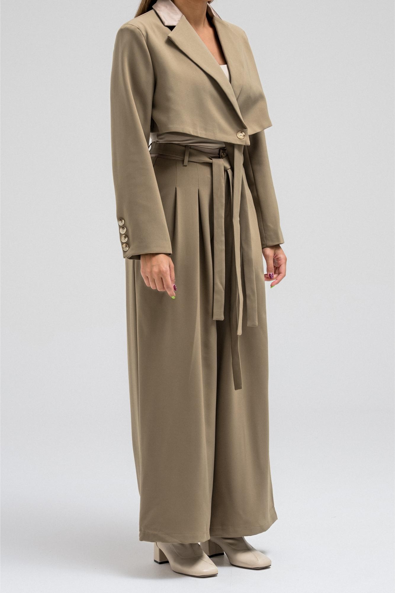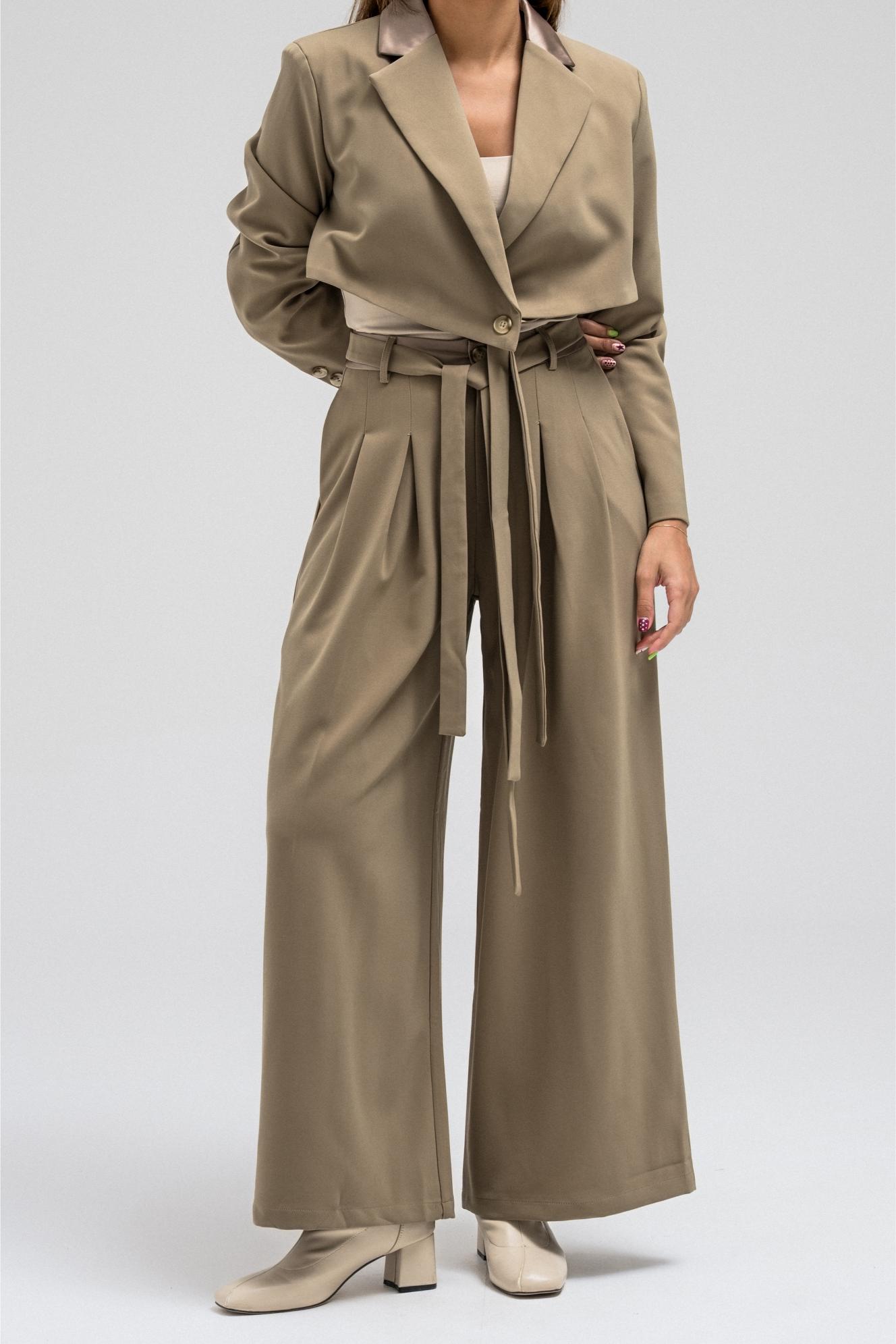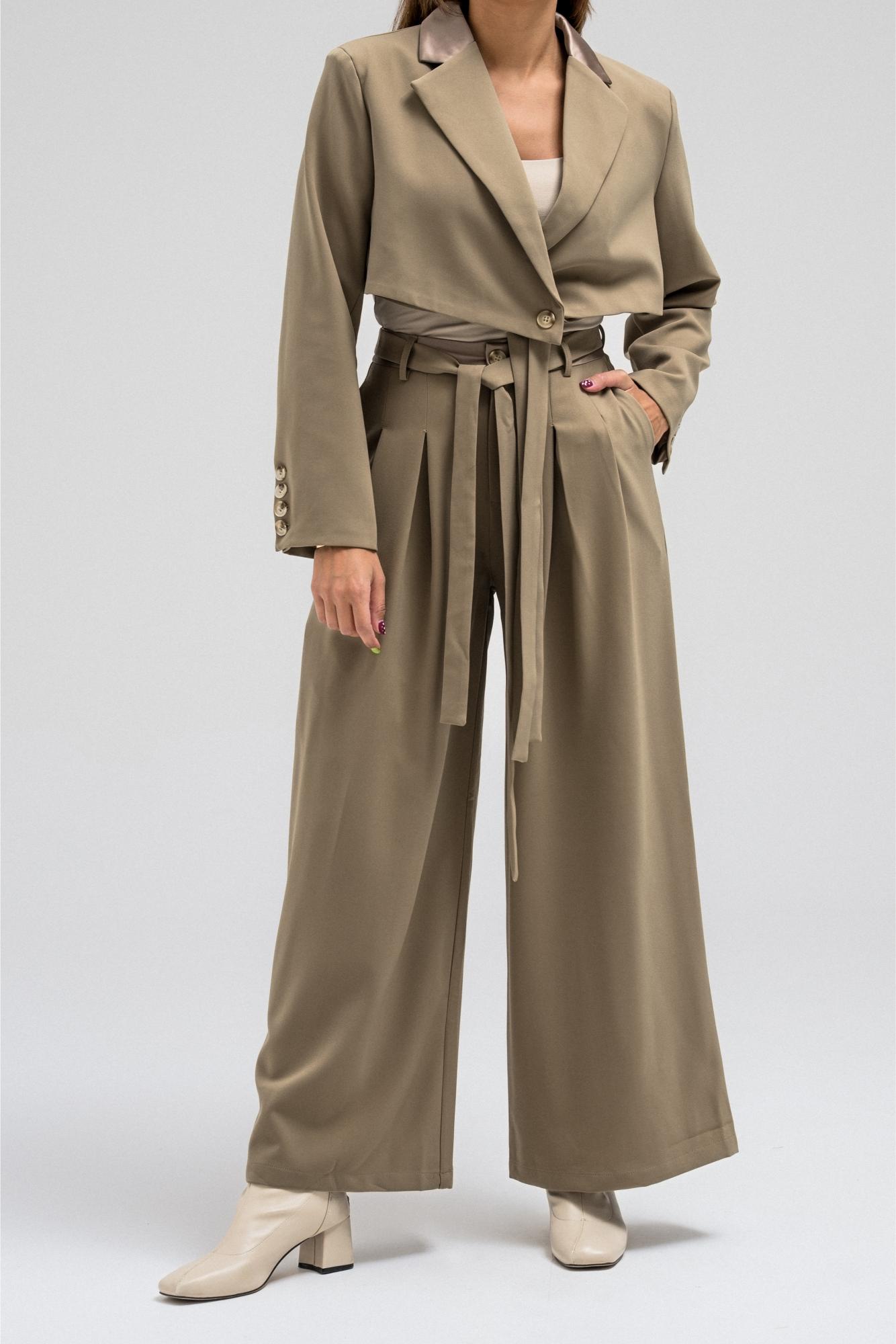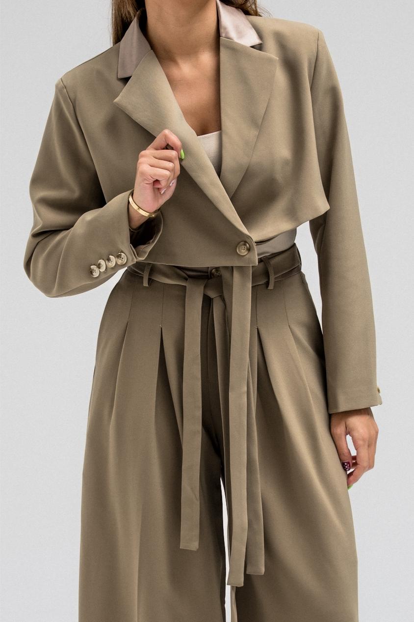 Tailored cropped blazer featuring a sharp notched lapel collar and front button closure. Designed with an attached belt to cinch the waist for a structured silhouette. Pairs perfectly with the matching pants for a coordinated look.