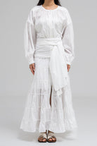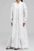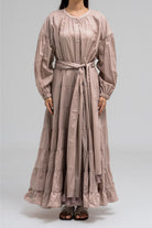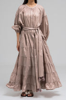 This effortlessly elegant dress features a round neck collar, flowy silhouette, and a ruffled hem for added movement. Designed with side pockets and elastic cuffs for a soft, gathered sleeve look. It comes with a matching long scarf that adds versatility. it can be worn as a waist belt, draped around the neck, or styled freely to elevate your look.