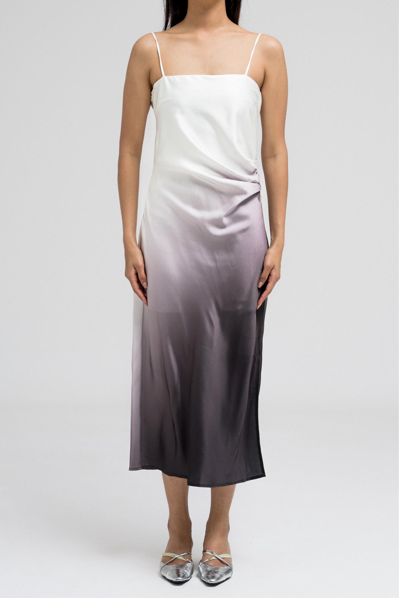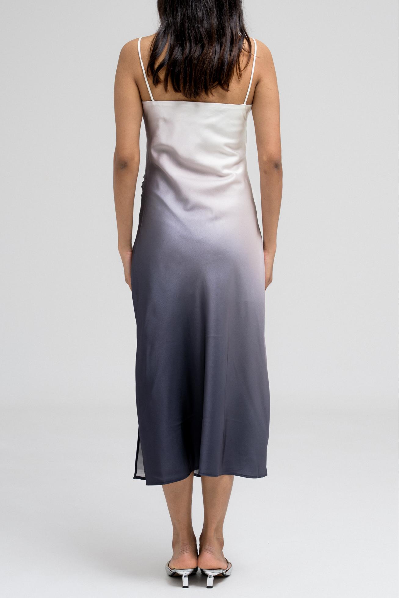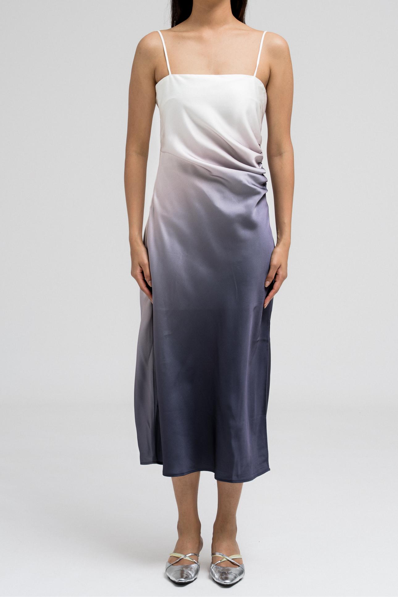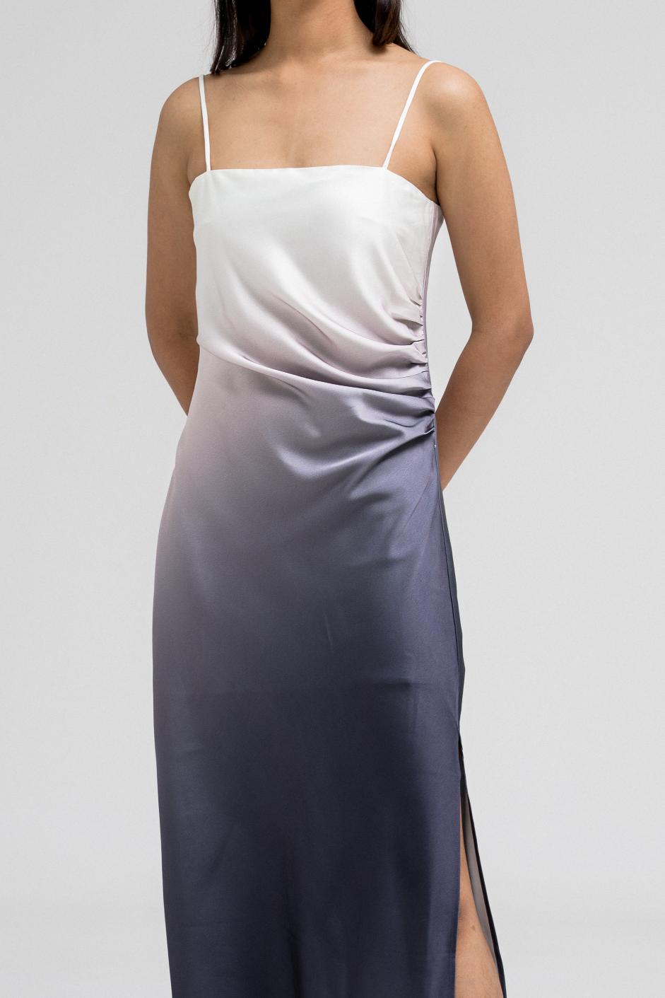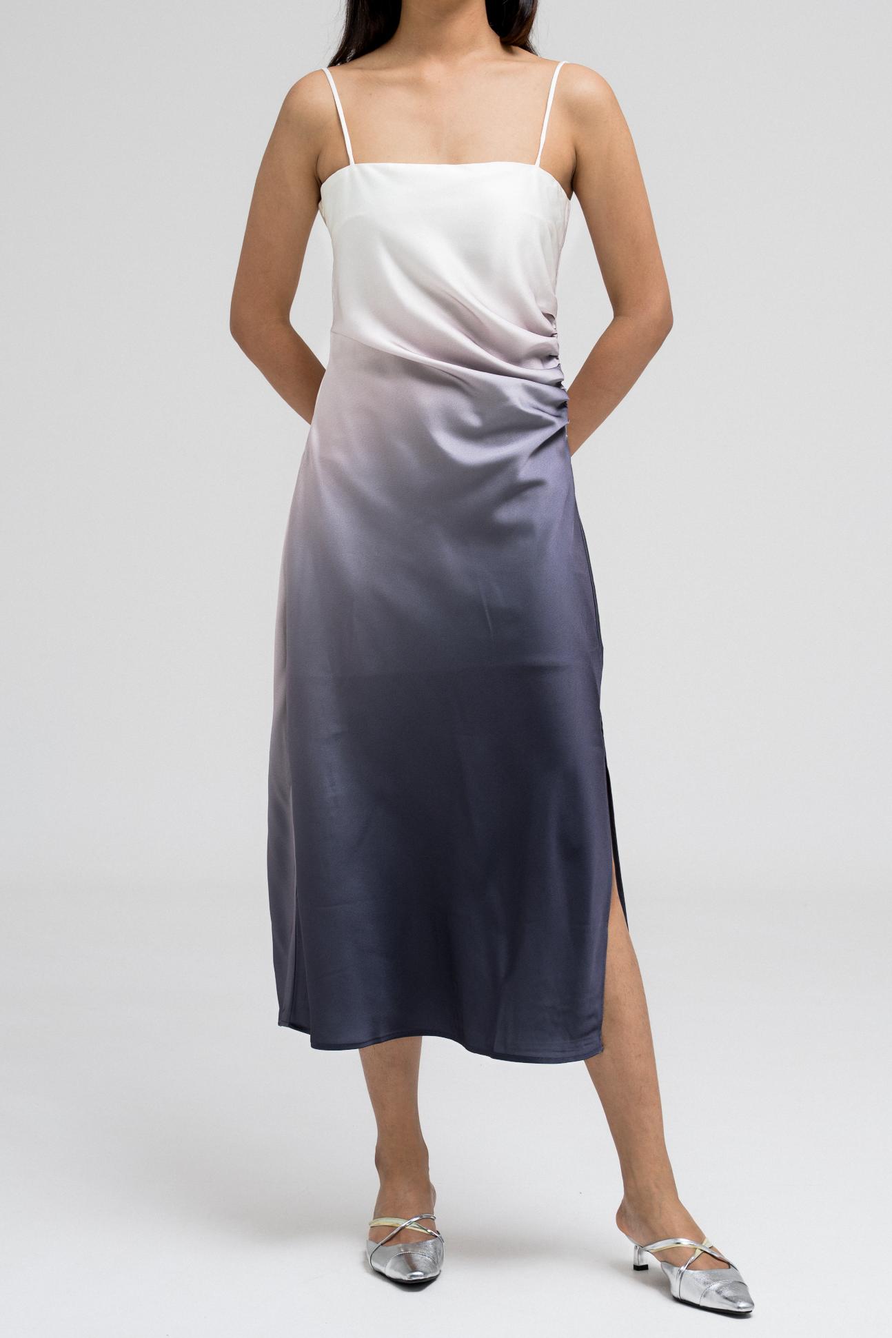 This elegant satin dress features a soft ombré gradient and a subtle front draped detail that adds a flattering touch. It also includes a back zipper closure. Designed with delicate spaghetti straps and a smooth, flowy style, it's the perfect statement piece for both day and evening looks. For a polished outfit, it pairs beautifully with the matching ombré blazer.