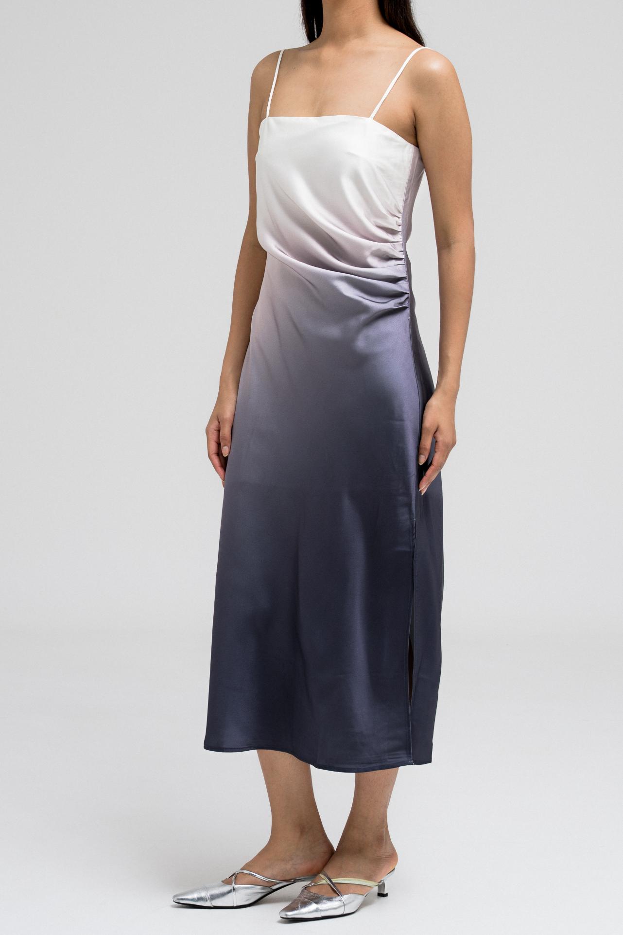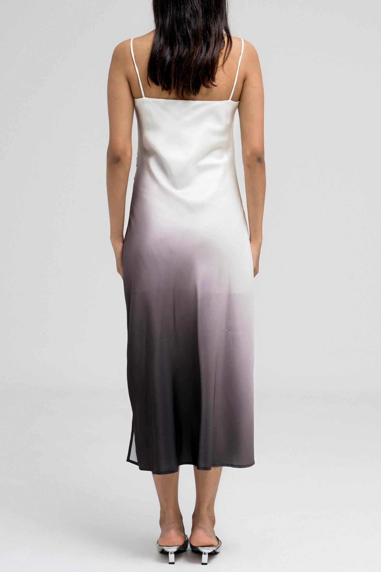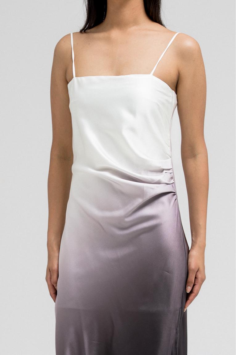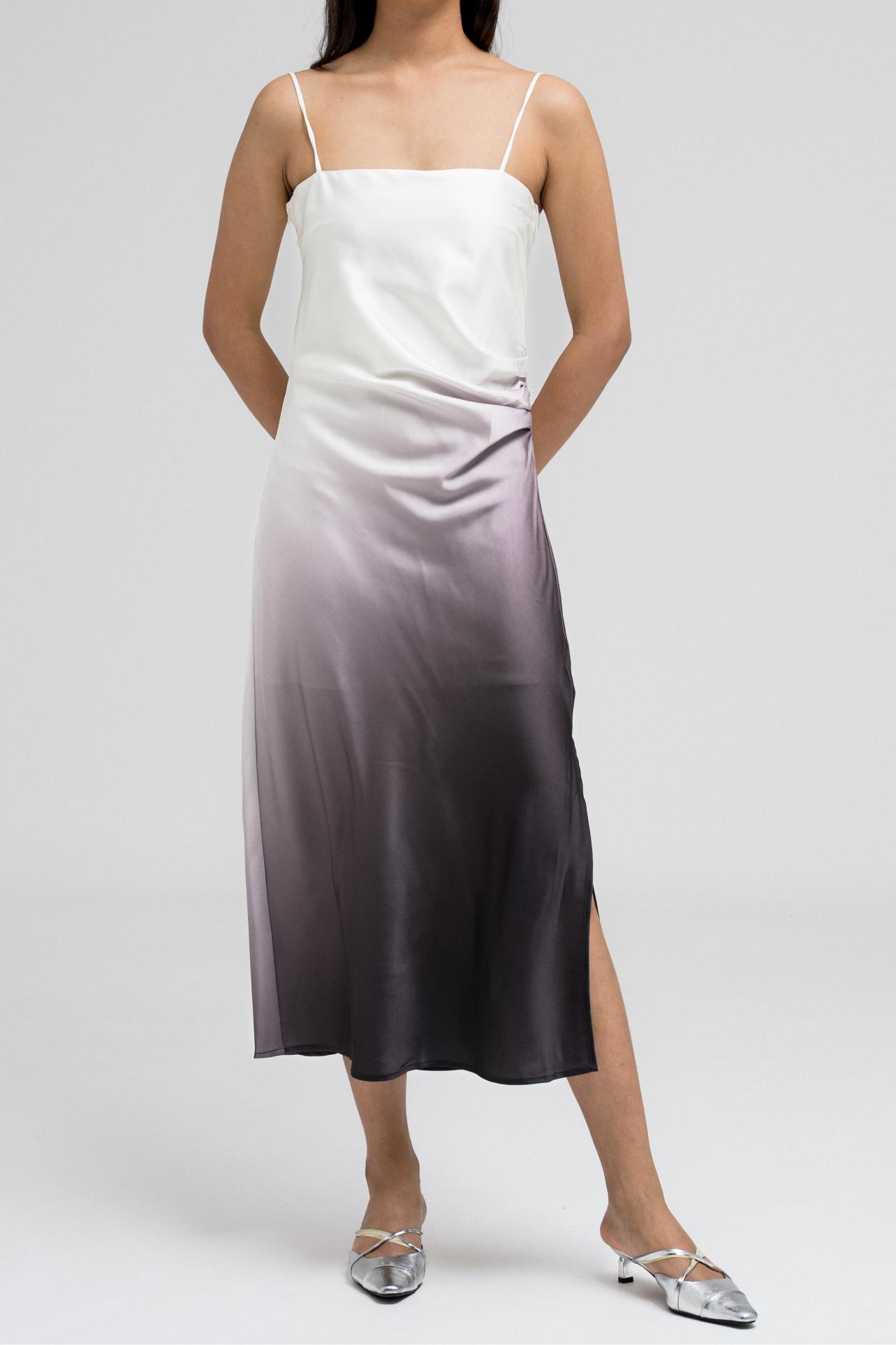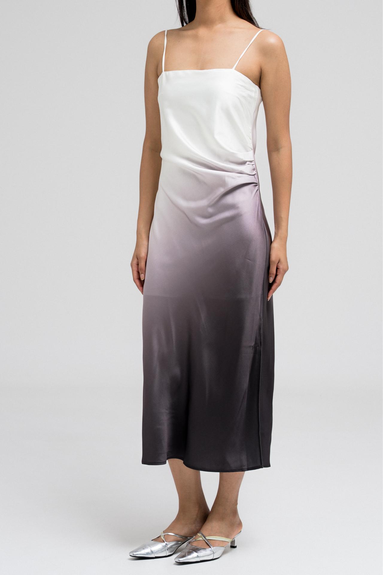 This elegant satin dress features a soft ombré gradient and a subtle front draped detail that adds a flattering touch. It also includes a back zipper closure. Designed with delicate spaghetti straps and a smooth, flowy style, it's the perfect statement piece for both day and evening looks. For a polished outfit, it pairs beautifully with the matching ombré blazer.