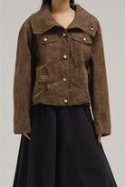 Crafted from soft suede, this jacket blends minimal structure with timeless ease. It comes with a wide-point collar, snap-button front closure, and subtle flap accents across the chest. Slightly cropped with a boxy fit, it’s a versatile layering piece for casual to semi-polished outfits.