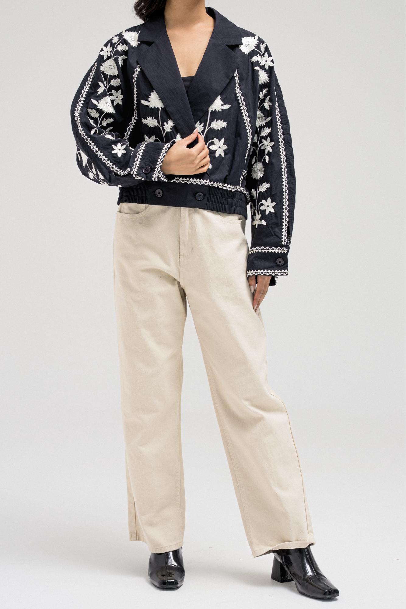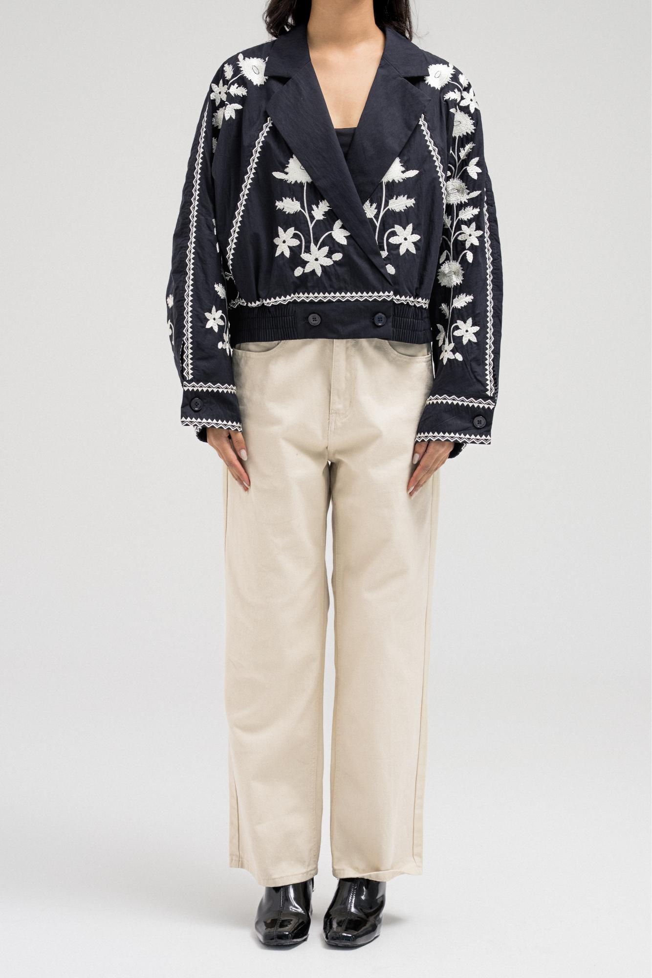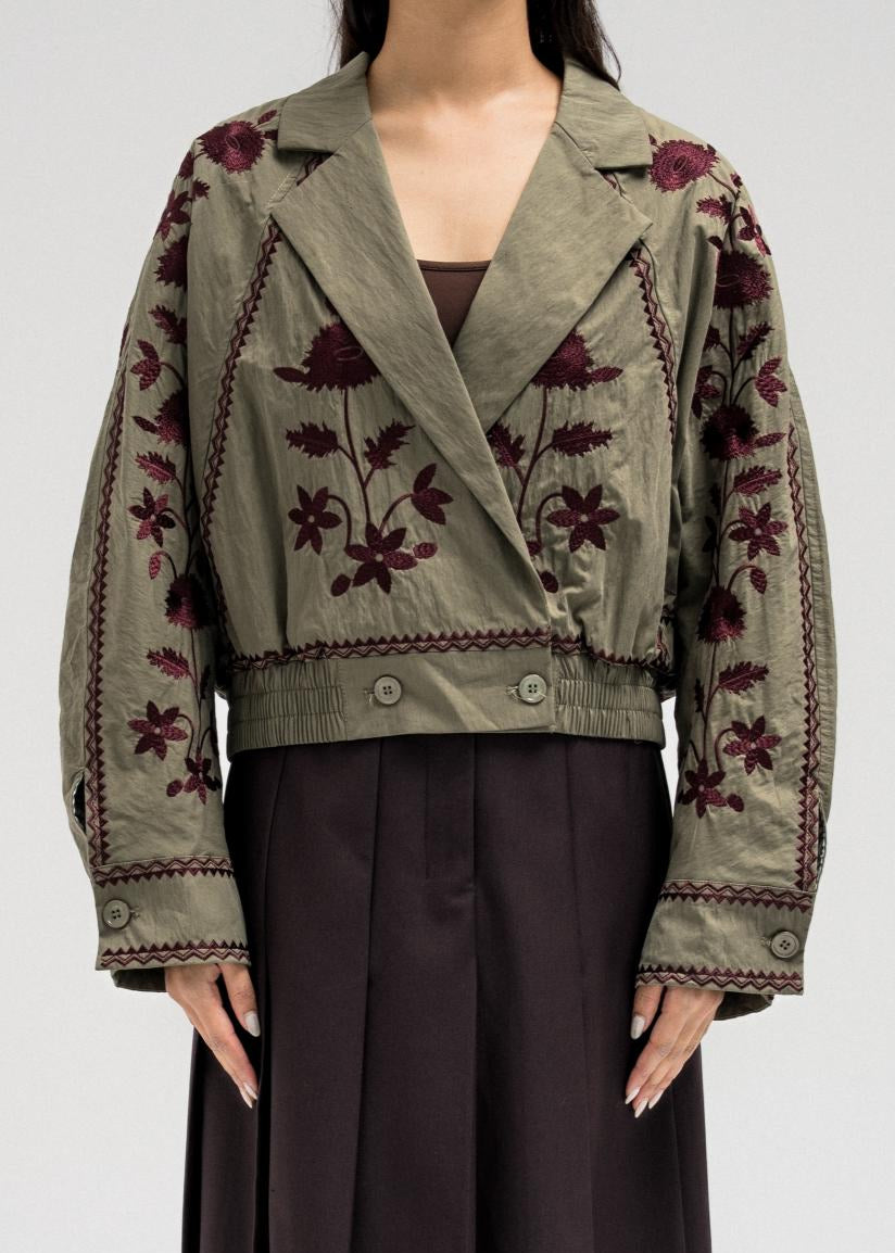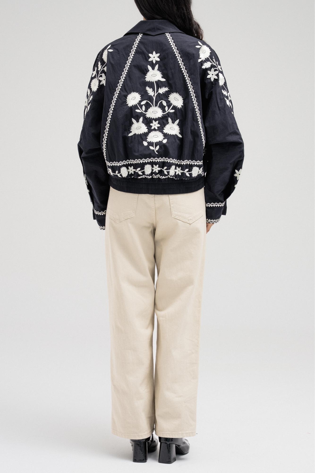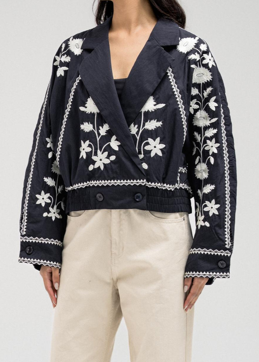 Cropped jacket designed with a bomber-inspired silhouette and elastic-style hem. Features floral embroidery stitched across the sleeves and body, a classic front collar, and double front closure. A statement piece blending structure with feminine detailing.
