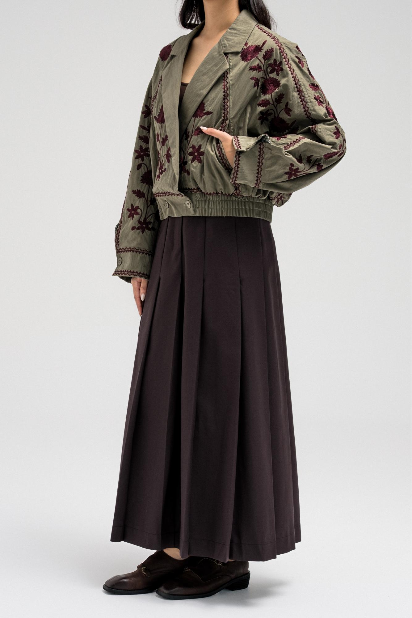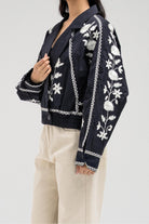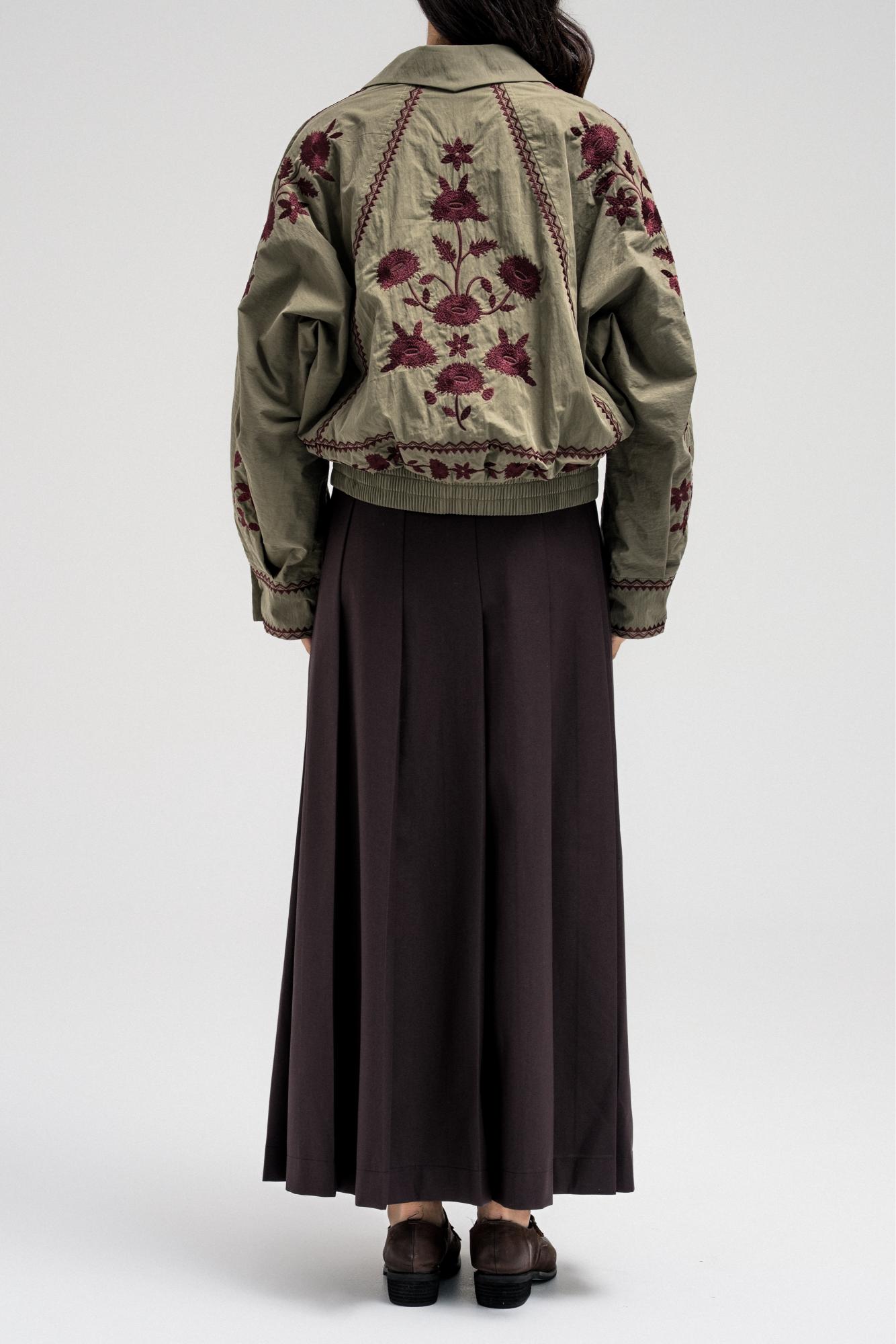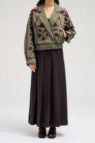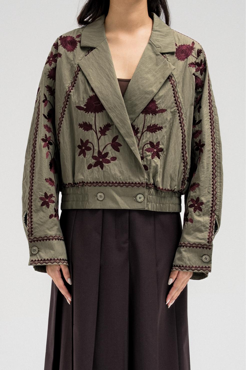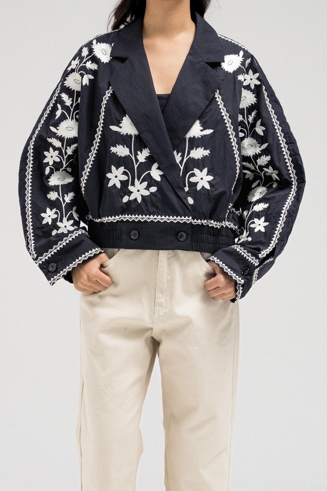 Cropped jacket designed with a bomber-inspired silhouette and elastic-style hem. Features floral embroidery stitched across the sleeves and body, a classic front collar, and double front closure. A statement piece blending structure with feminine detailing.