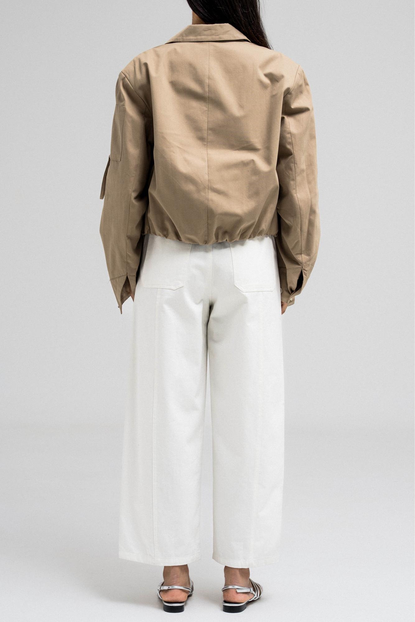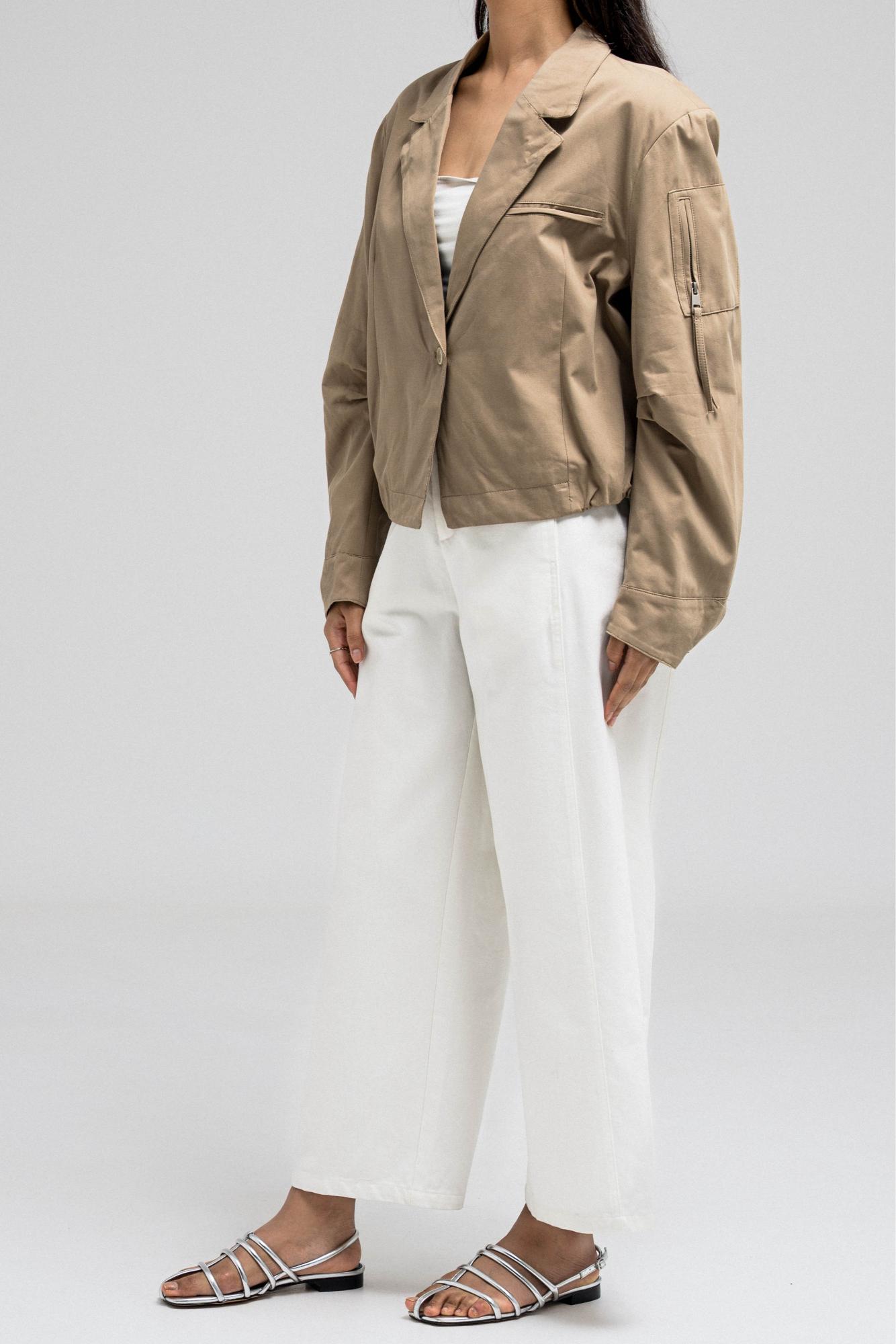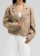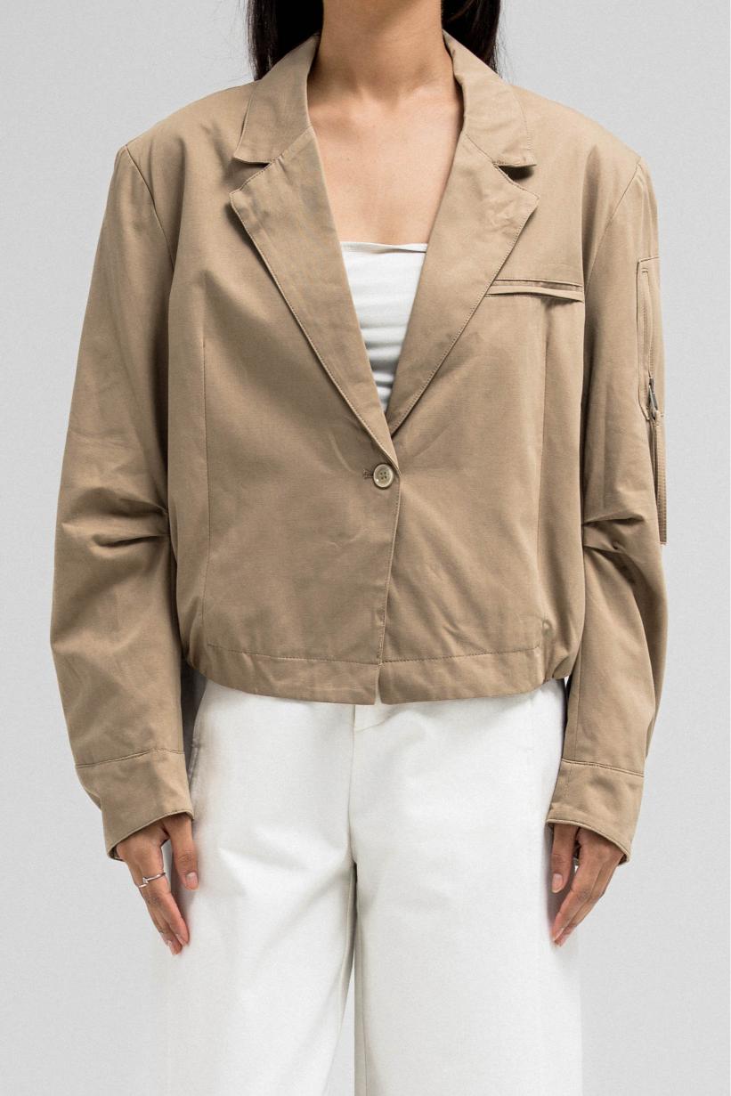 Cropped jacket combines the structure of a blazer with the ease of a bomber. It features a classic blazer-style collar and a single front button closure. The back showcases an elastic waistband for a comfortable, cinched fit. A standout detail is the zippered pocket on the sleeve, adding a modern touch. Perfect for layering with both casual and smart looks.