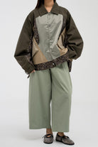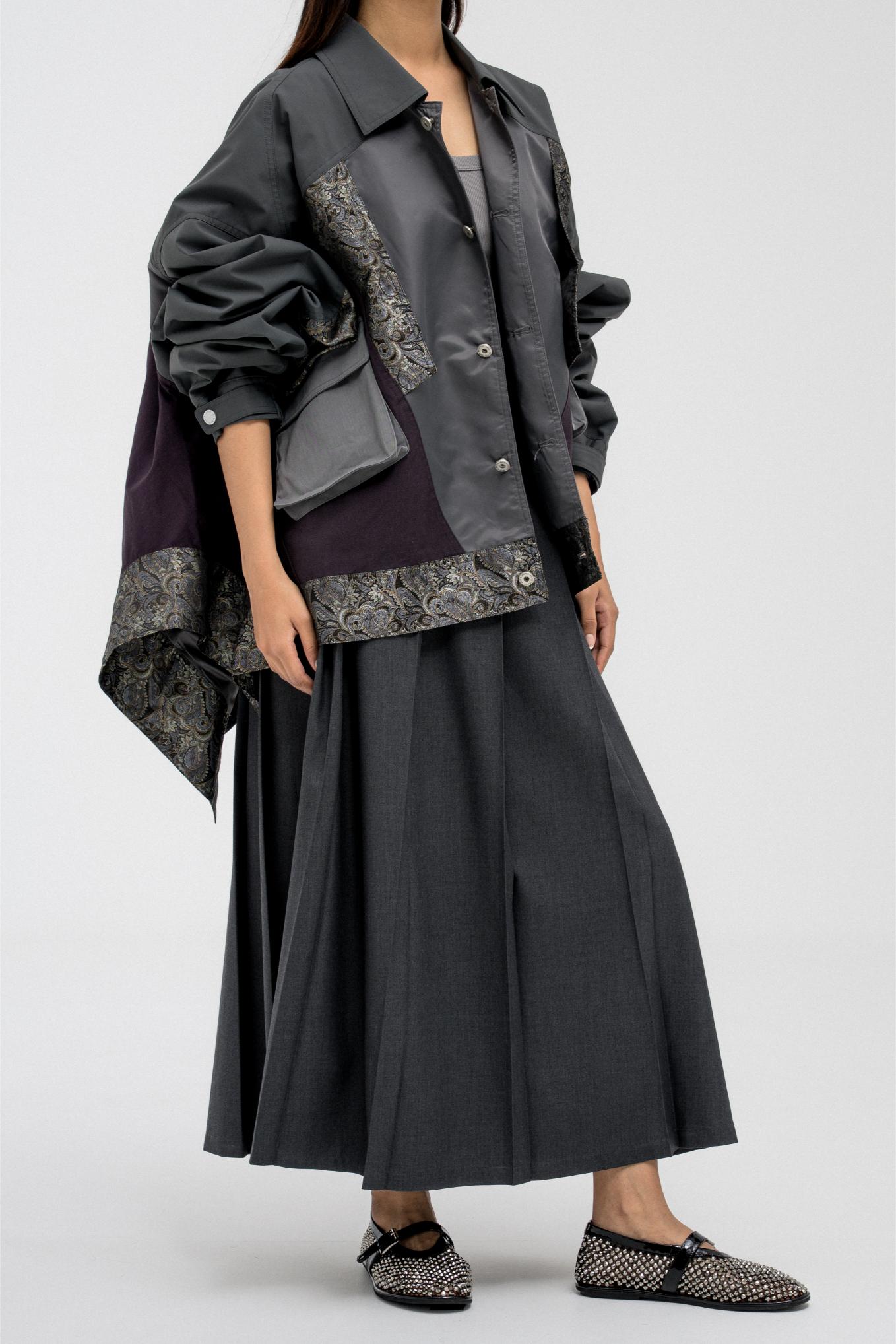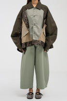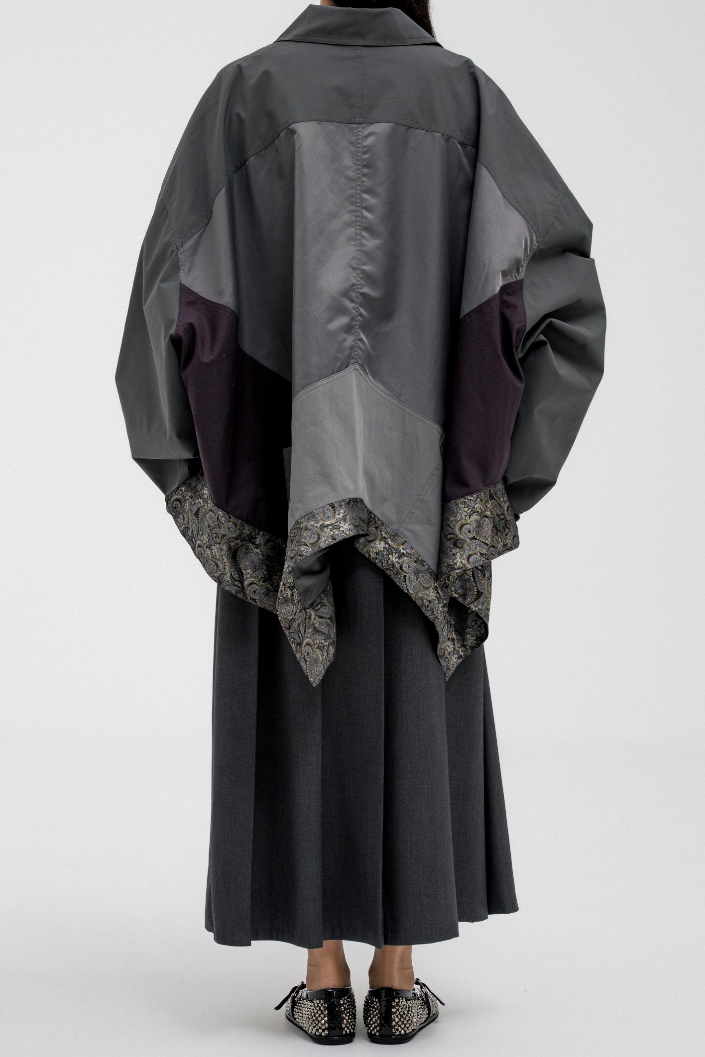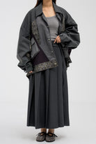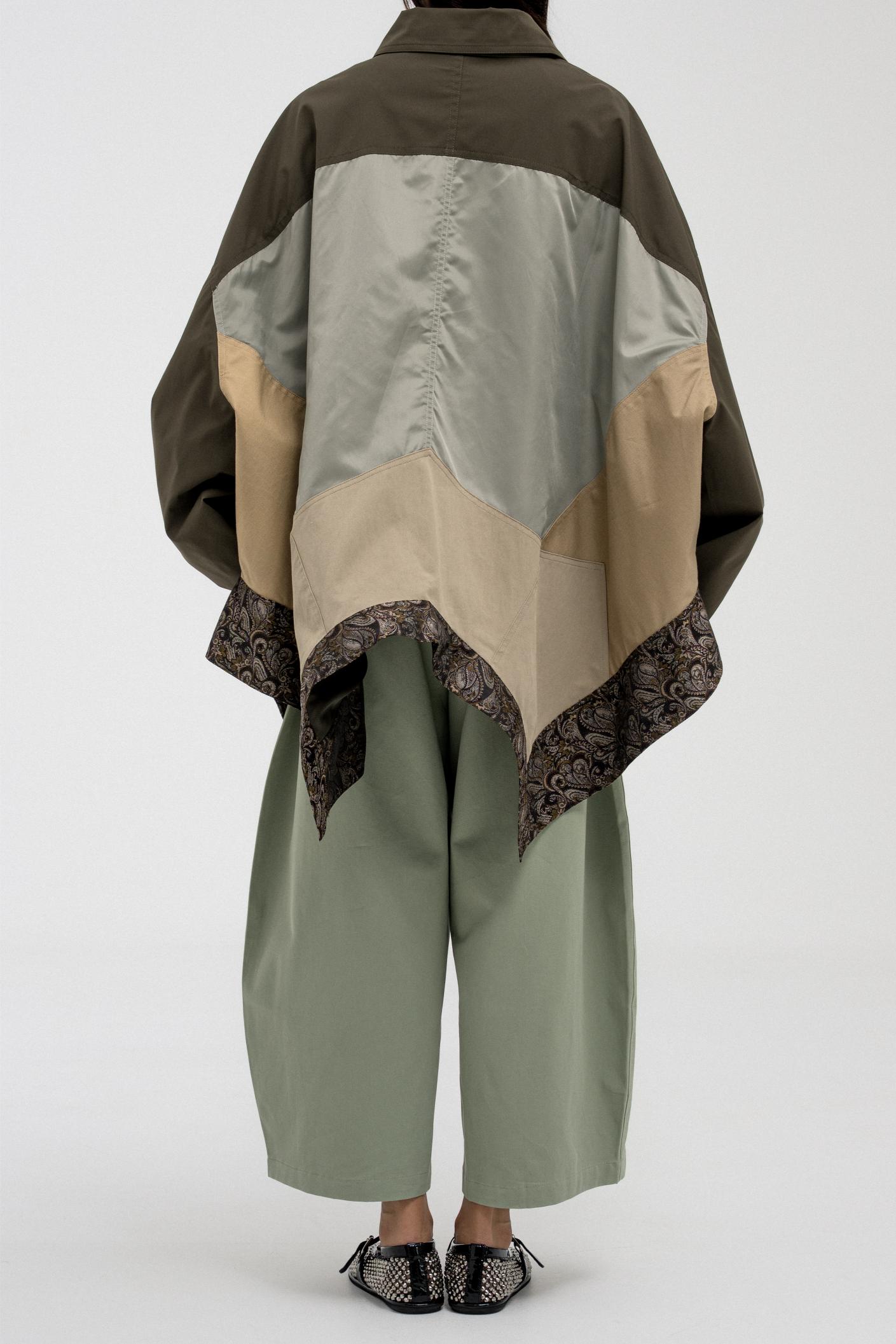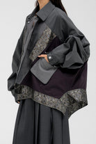 Patchwork jacket featuring a mix of contrasting patterns and textured fabrics. Front pockets. Metal button-down closure. The relaxed fit and wide sleeves.