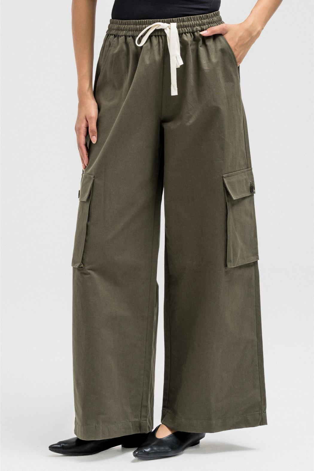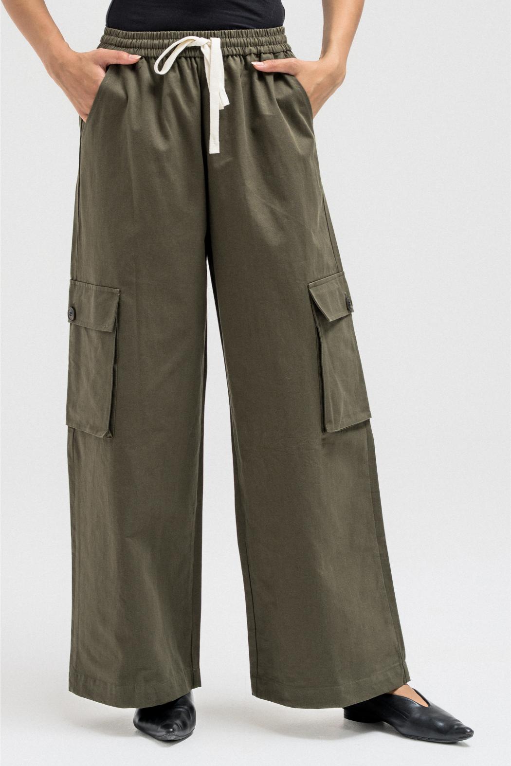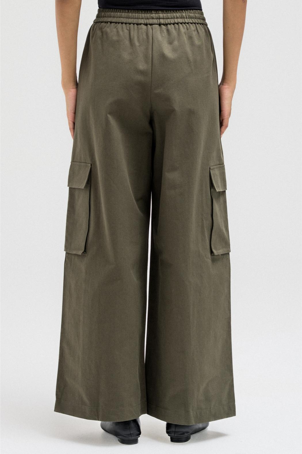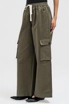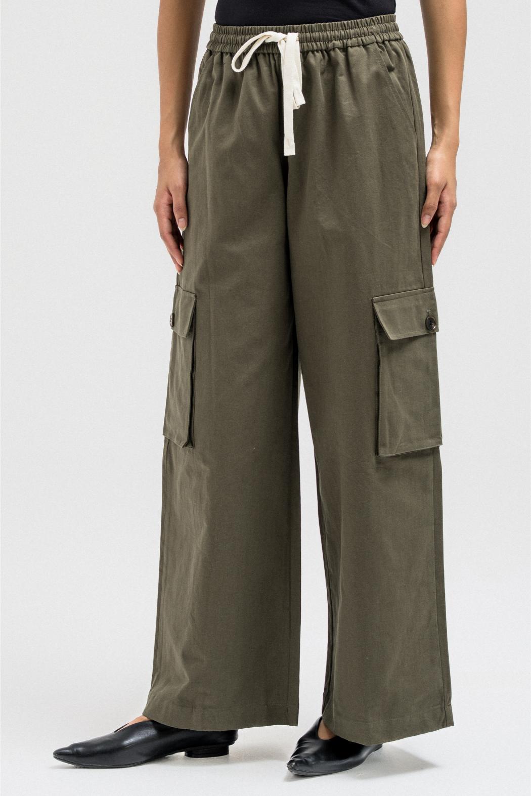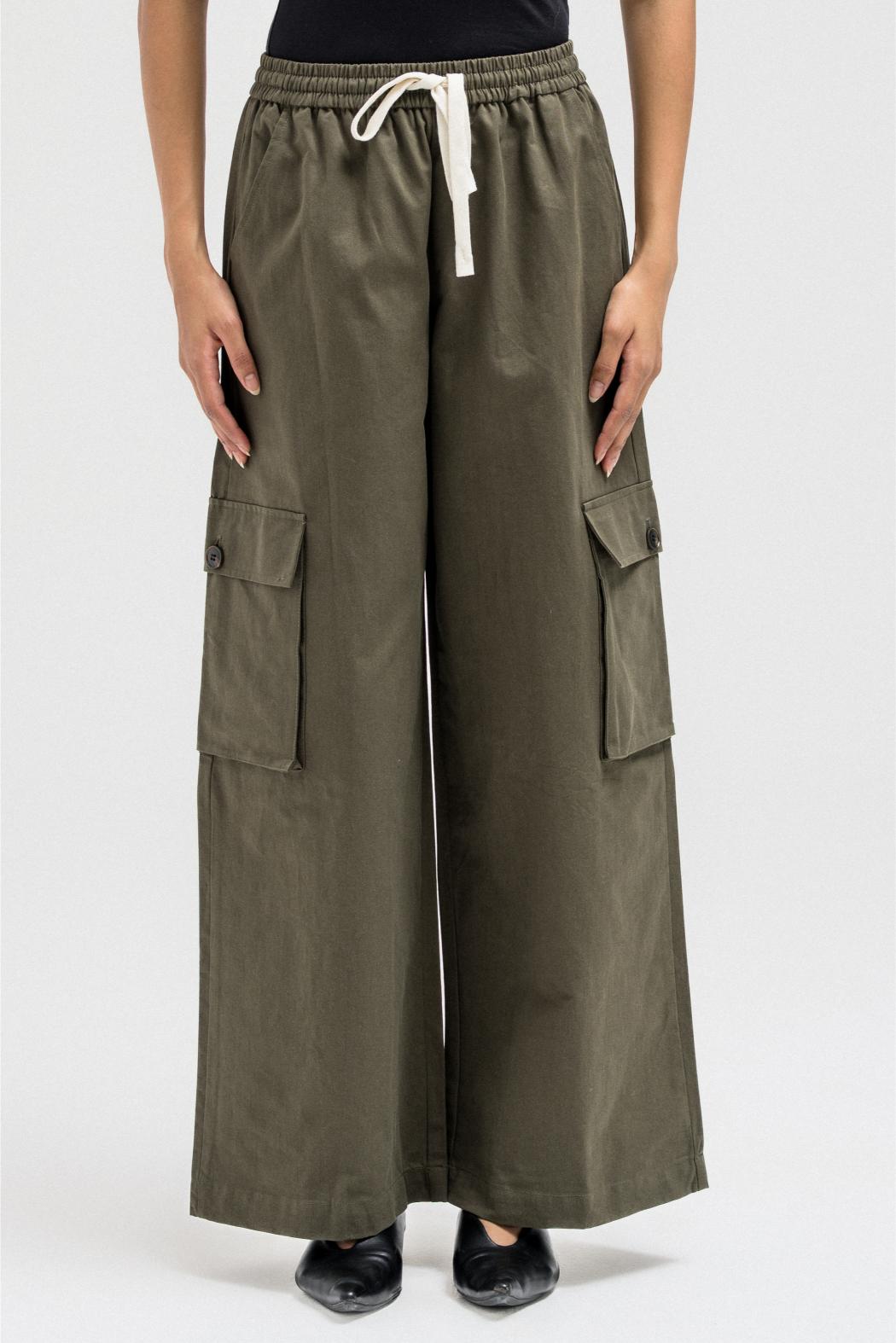 Relaxed cargo-style pants crafted from soft, lightweight fabric for a casual yet structured fit. Designed with an elastic waistband and adjustable drawstrings for comfort and flexibility. Featuring spacious side and cargo pockets that add both utility and style, and finished with a slightly elasticized hem for a modern, laid-back silhouette.
