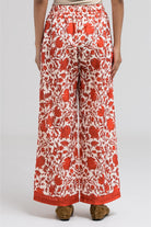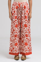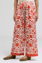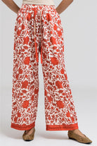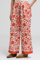 These airy linen pants feature a vibrant red floral print on a soft pink base. Designed with an elastic waistband and functional drawstring that ties into a bow for adjustable comfort. Complete with side pockets, they pair perfectly with the matching top for a coordinated and stylish look.
