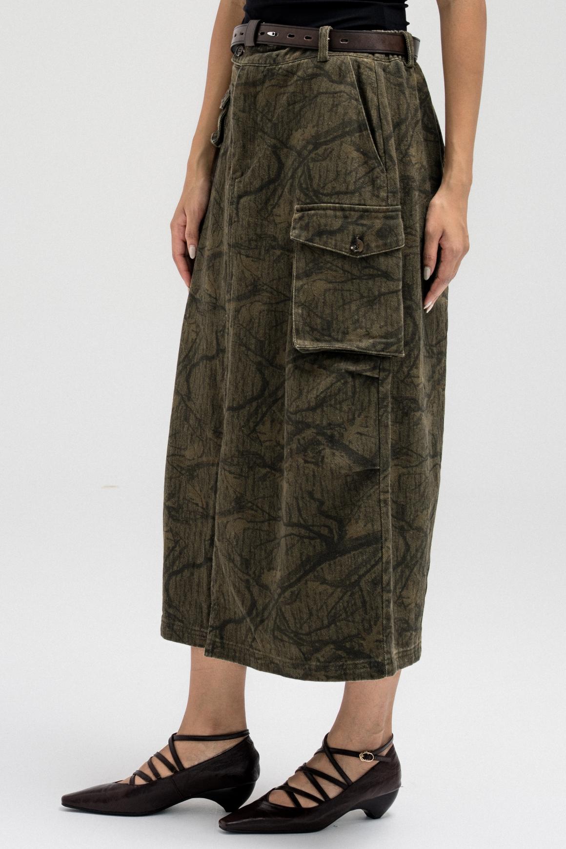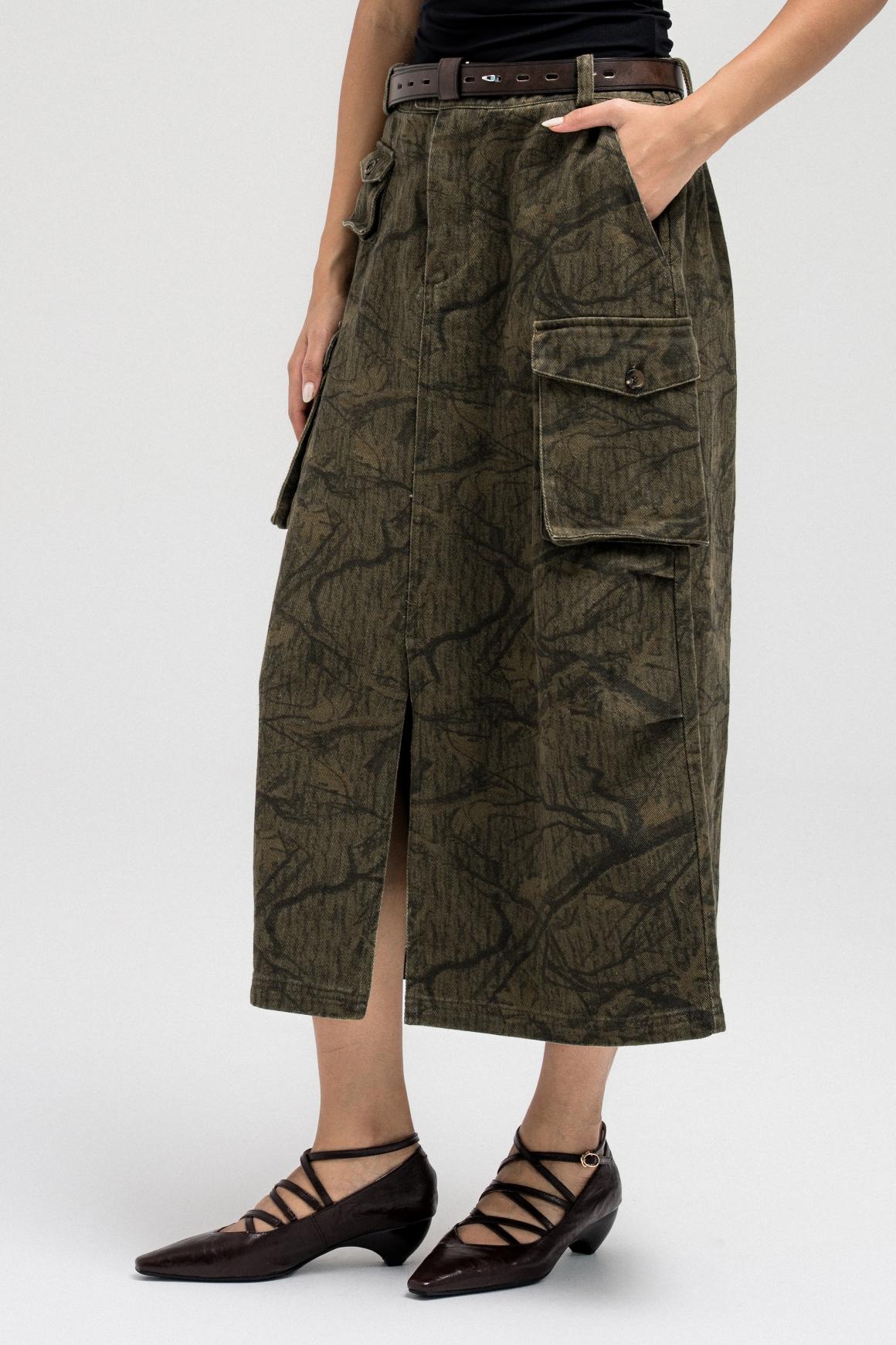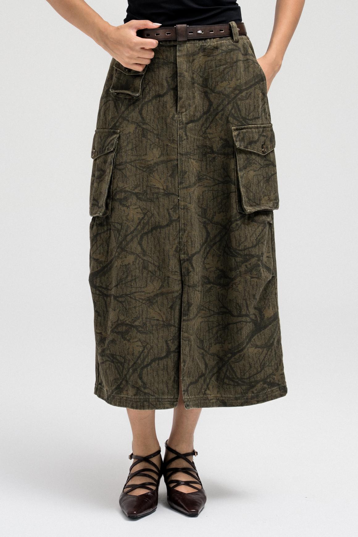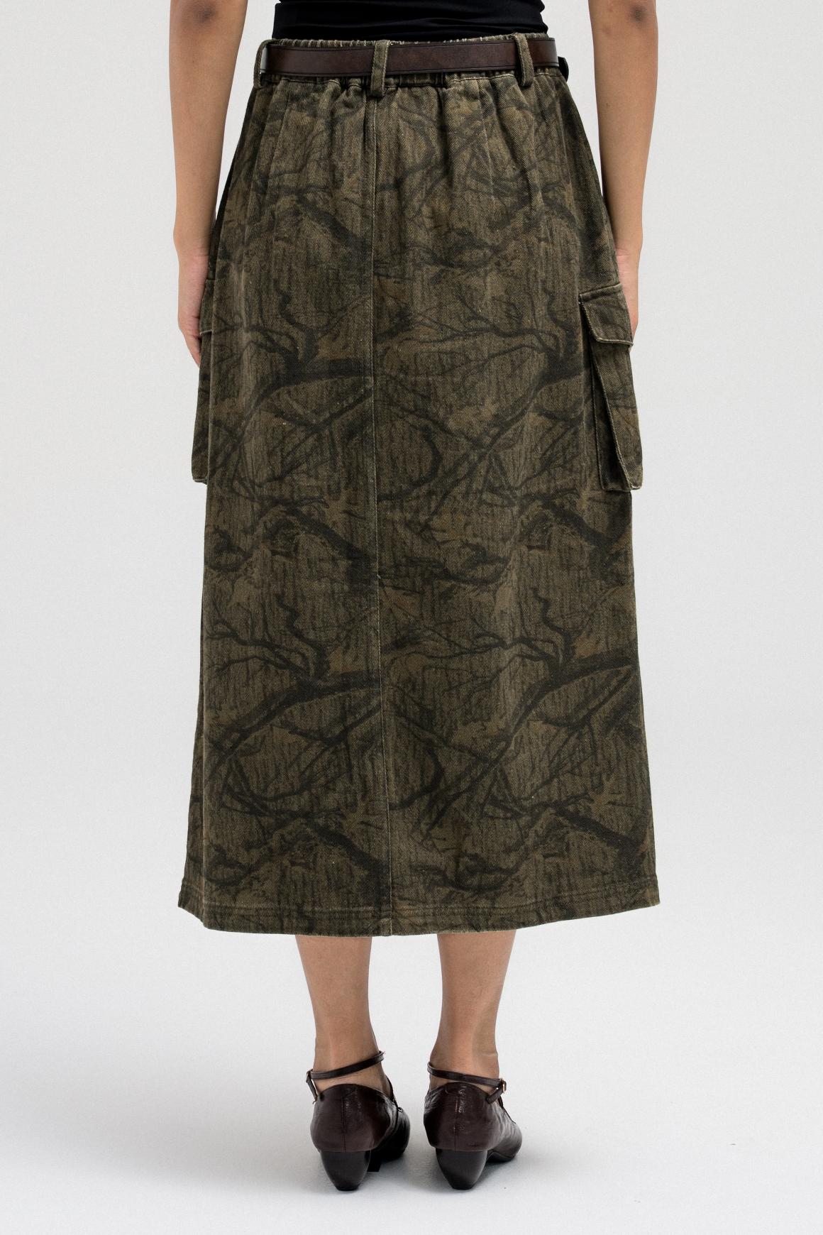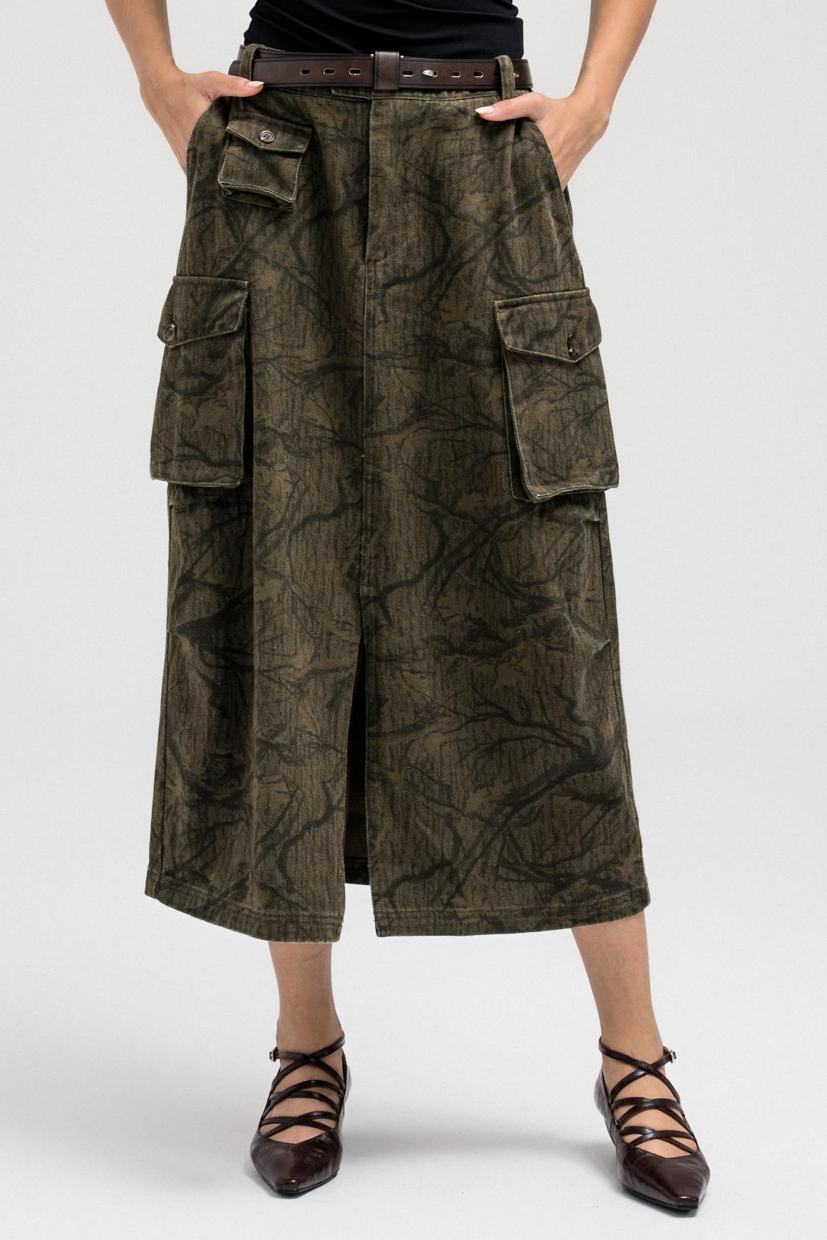 Cargo-inspired skirt crafted from textured fabric with an abstract tree-branch print. Designed with multiple utility pockets, a front slit, and button-and-zipper closure. Comes with a coordinating belt to complete the look.