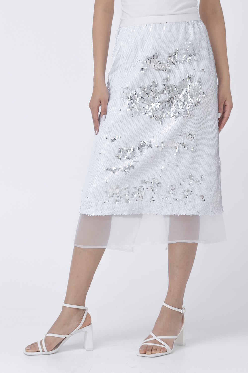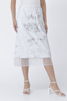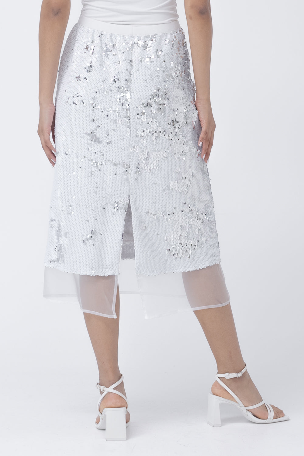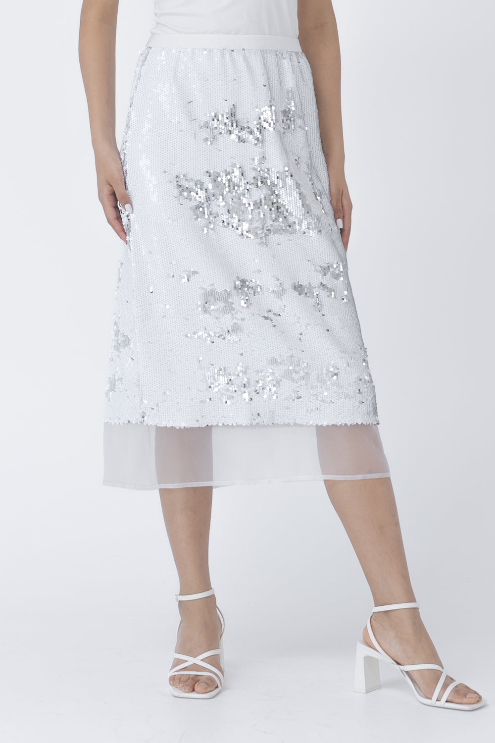 Midi length, sequin skirt with mesh fabric detail near the hem.