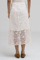 This elegant skirt features stitched embroidery throughout, offering a soft and feminine feel. It has a unique dual-length design: the inner layer provides full coverage, while the outer mesh layer extends slightly below for a sheer, transparent finish. It’s detailed with a back slit for ease of movement and a concealed back closure for a seamless fit.