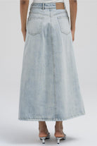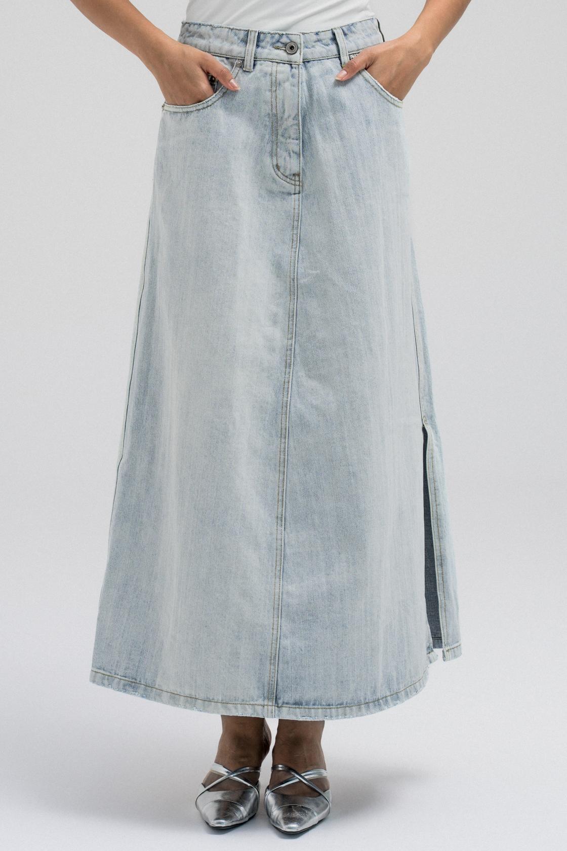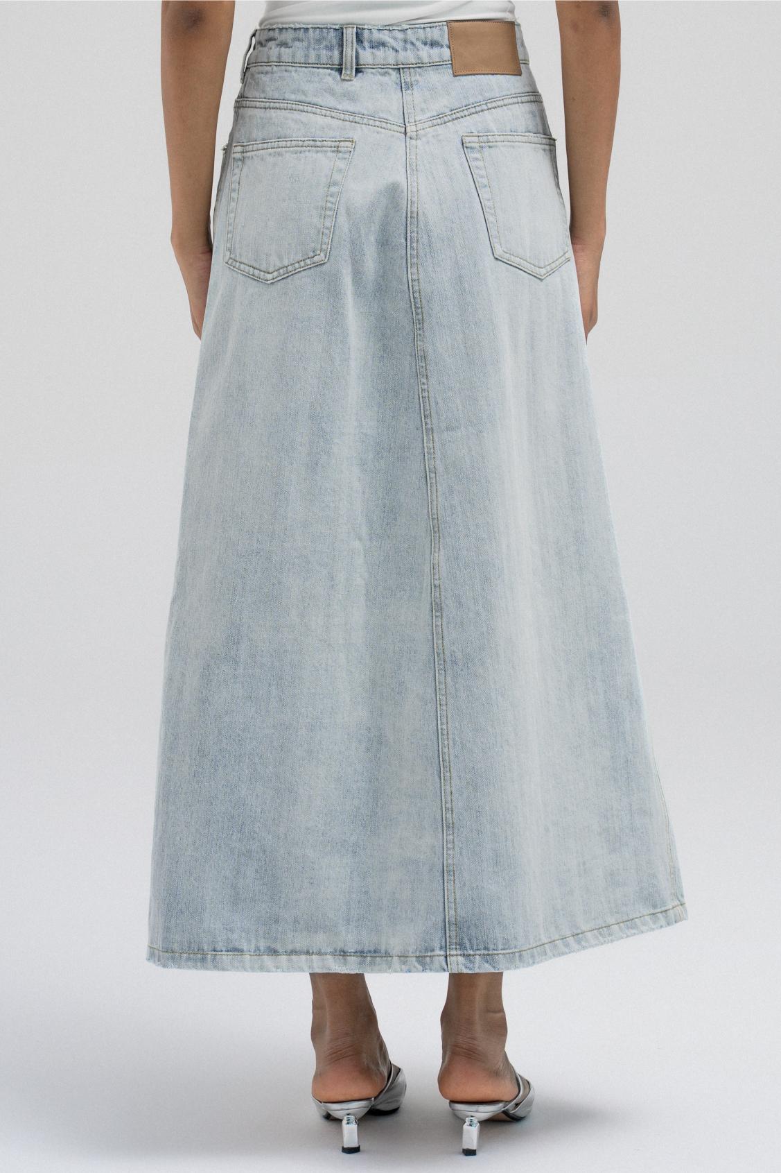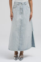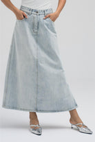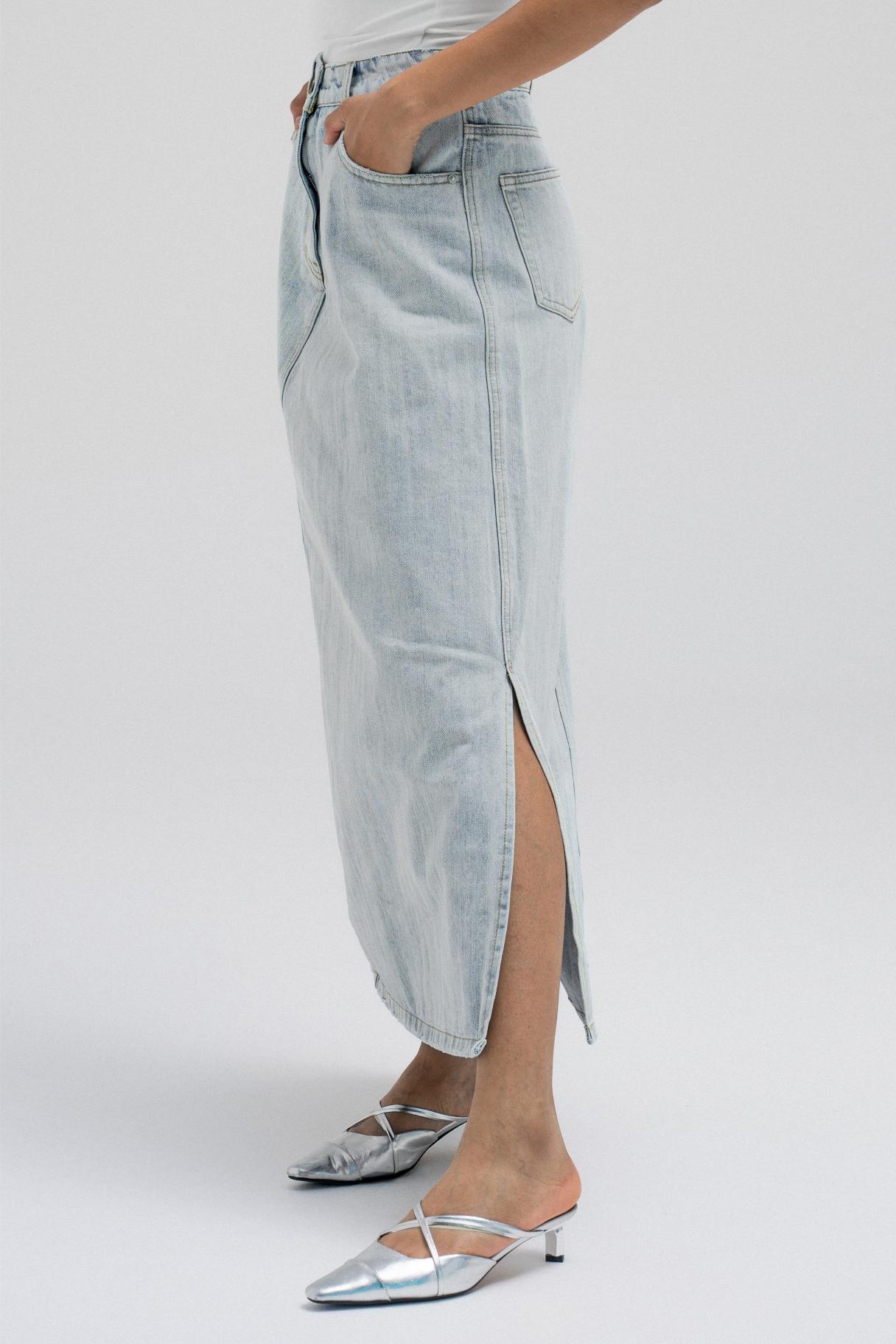 A-line denim skirt featuring a side slit for added movement. Designed with front metal button and zipper closure, two side pockets, and back pockets for functionality.