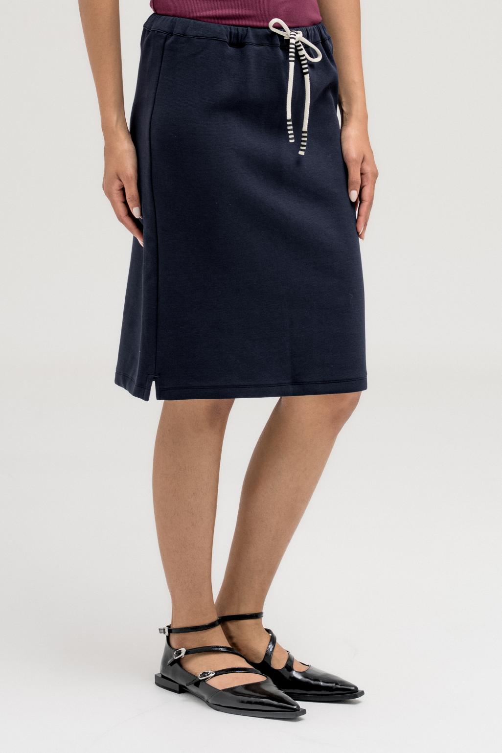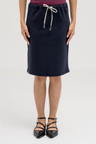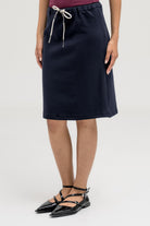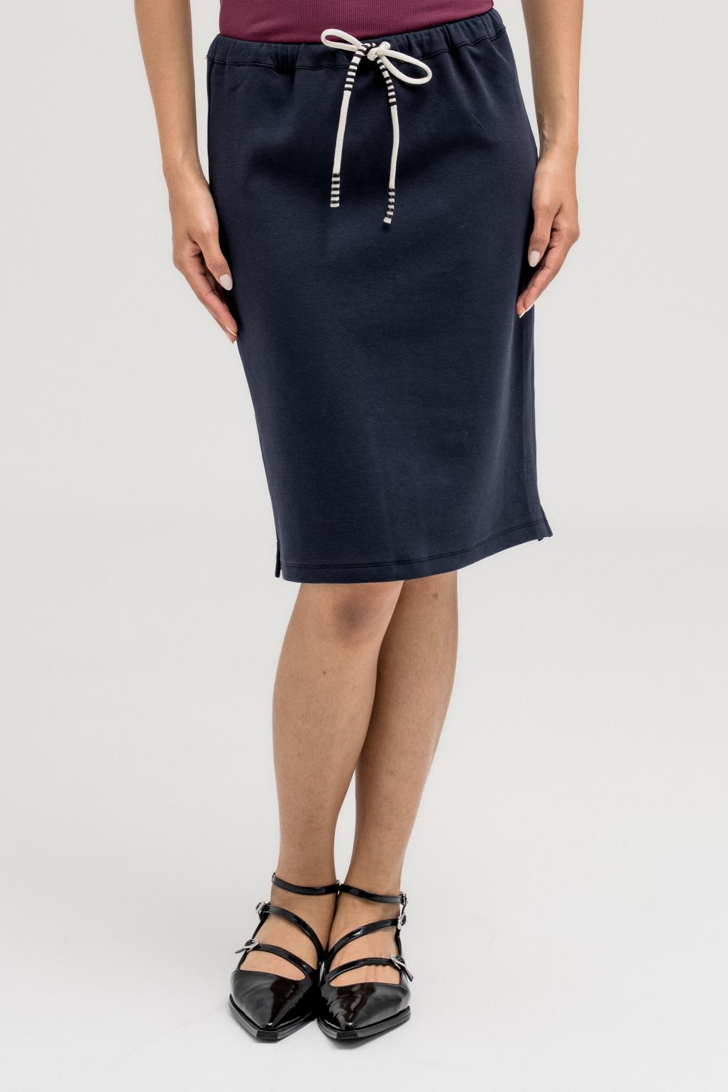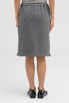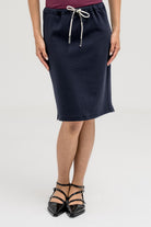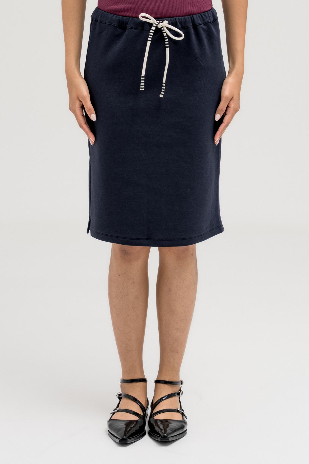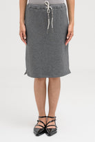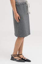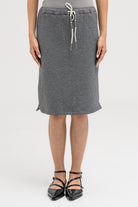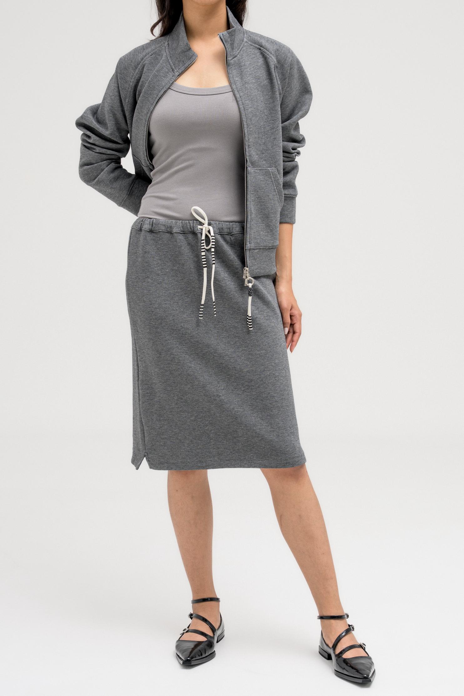 A comfortable and easy-to-style skirt crafted from a soft, stretchy fabric. It features an elastic waistband with drawstring ties for adjustability and two subtle side slits that offer added movement and a flattering touch. Perfect for pairing with matching jackets or casual basics.