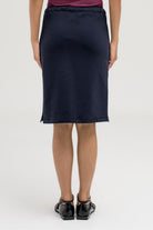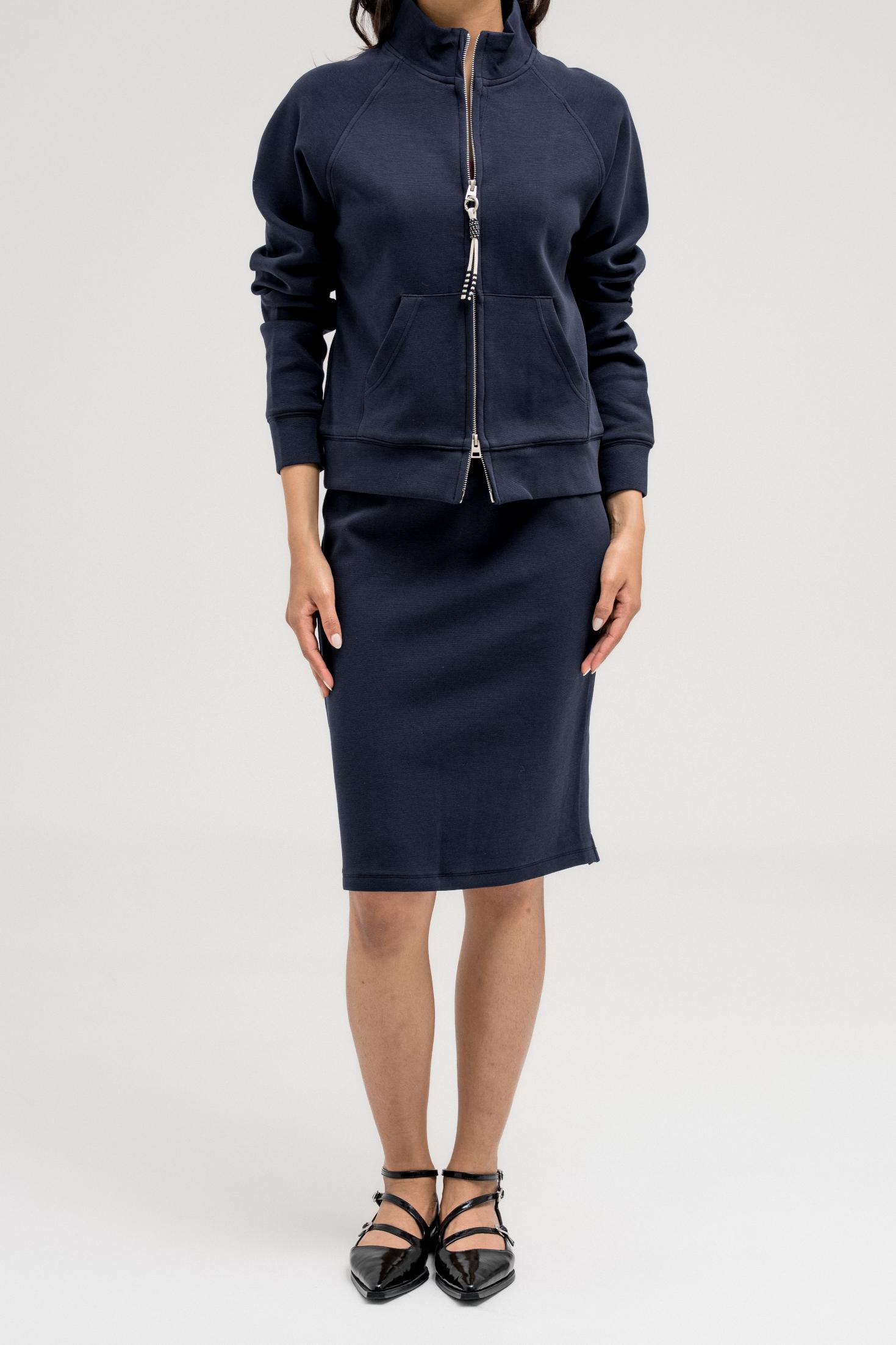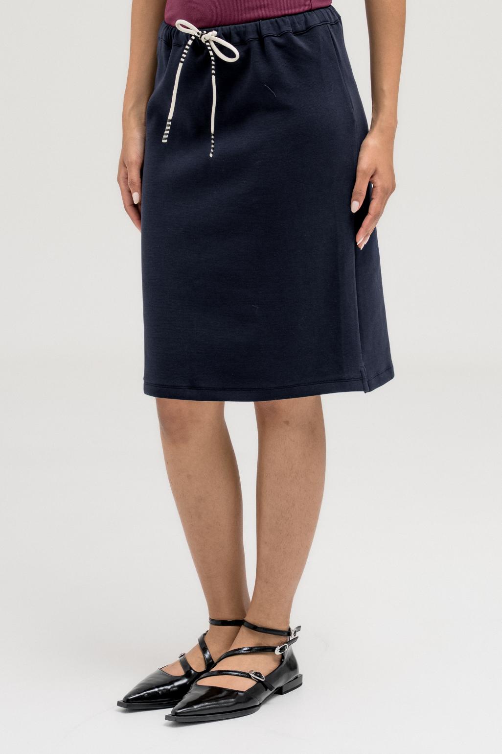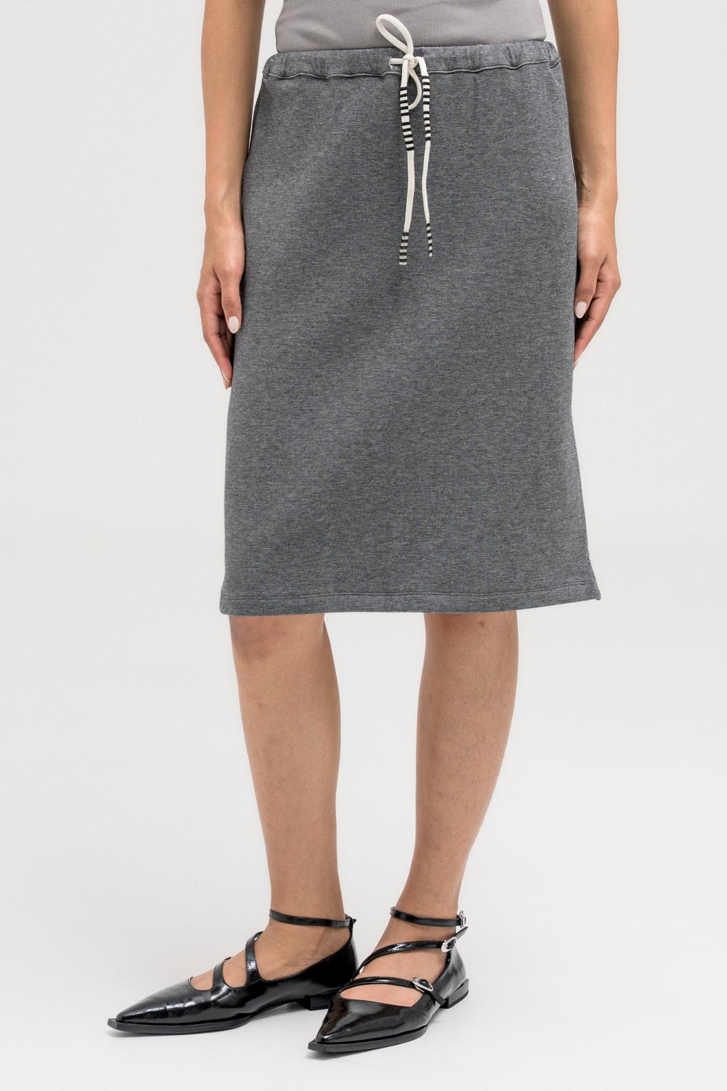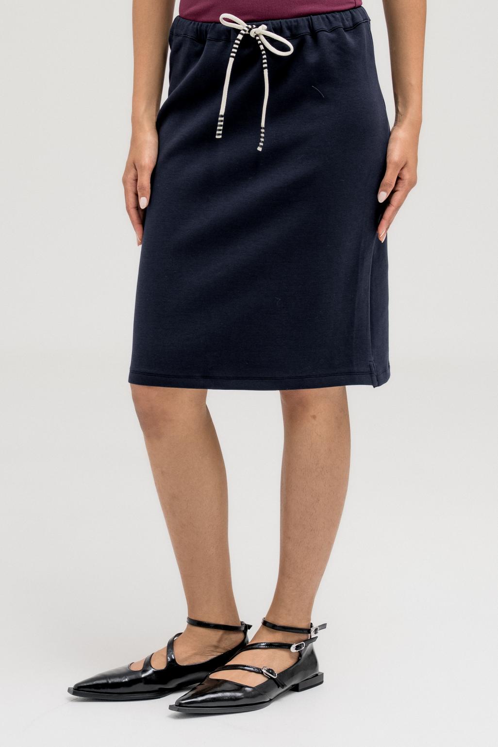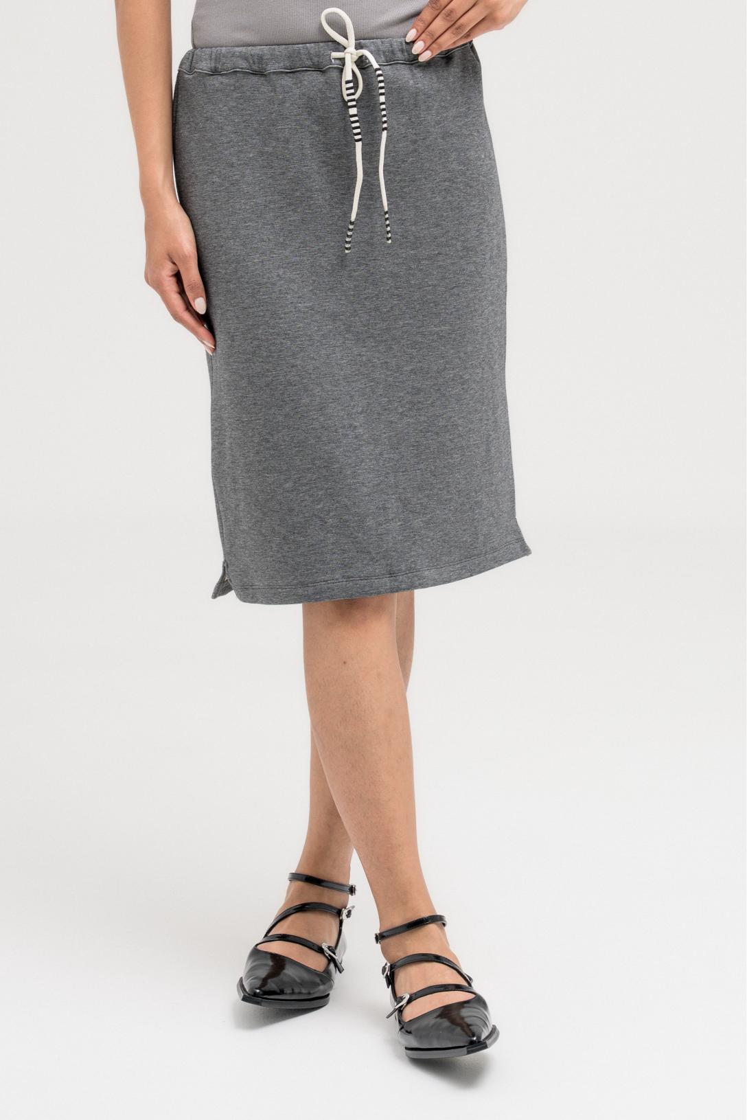 A comfortable and easy-to-style skirt crafted from a soft, stretchy fabric. It features an elastic waistband with drawstring ties for adjustability and two subtle side slits that offer added movement and a flattering touch. Perfect for pairing with matching jackets or casual basics.