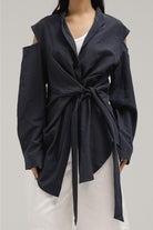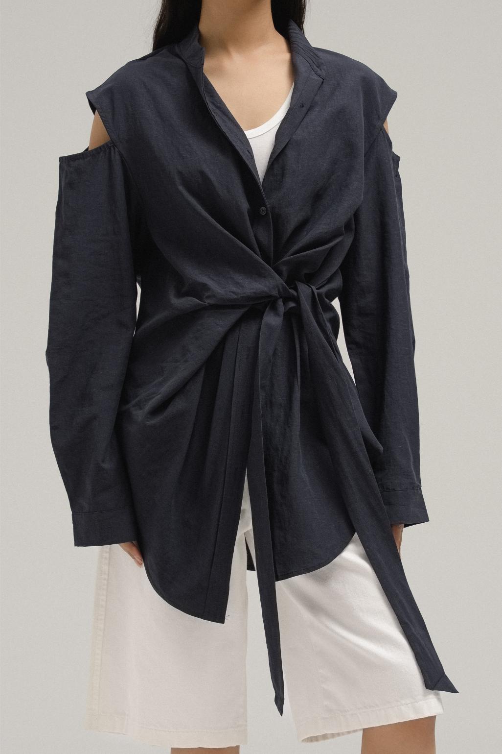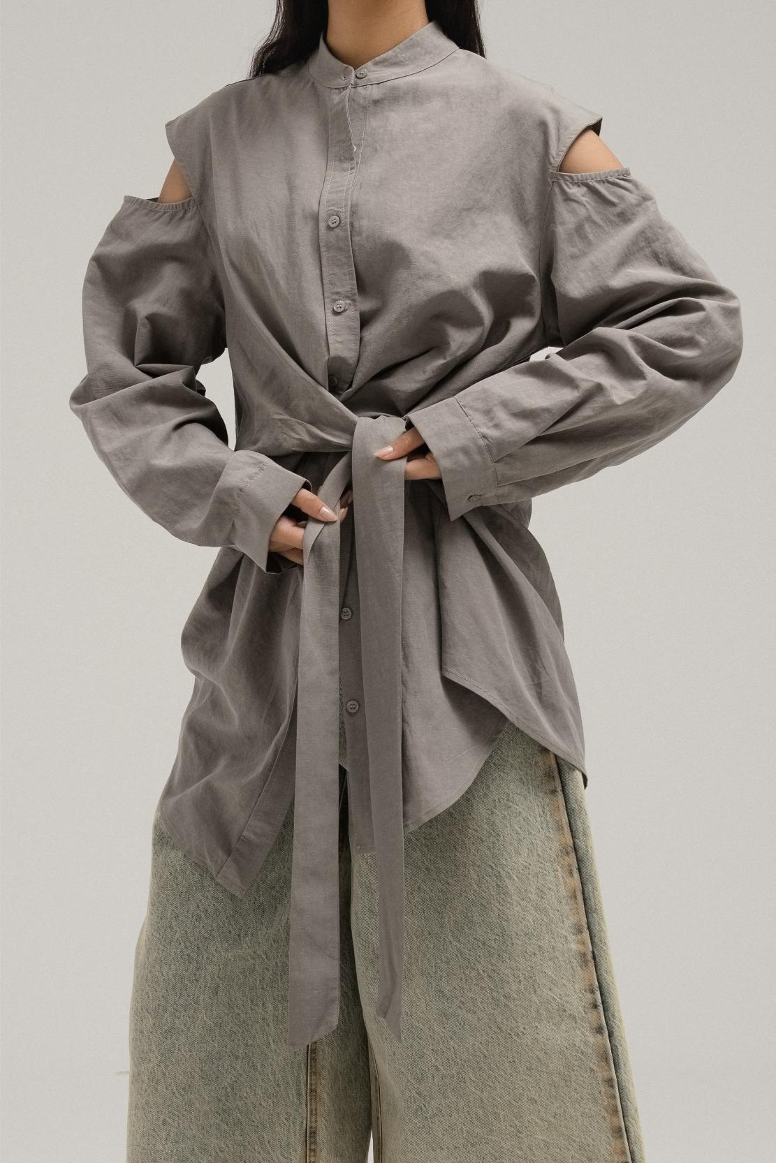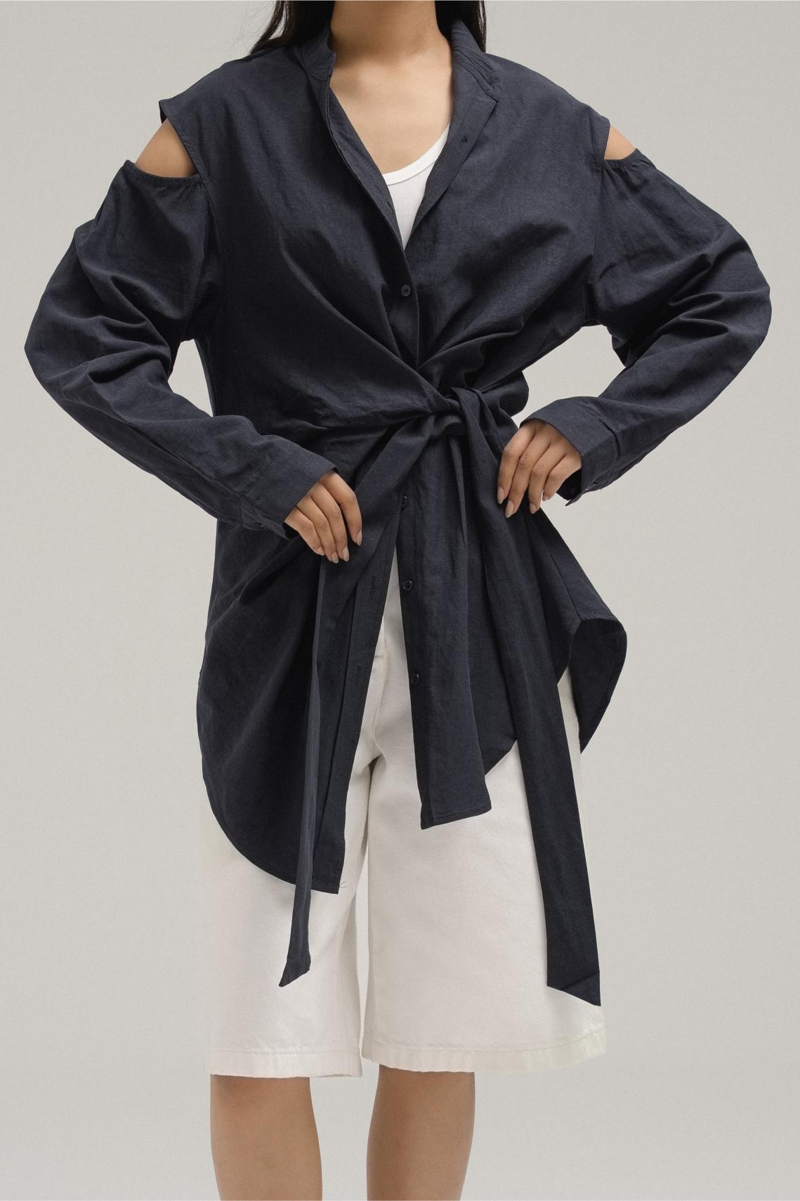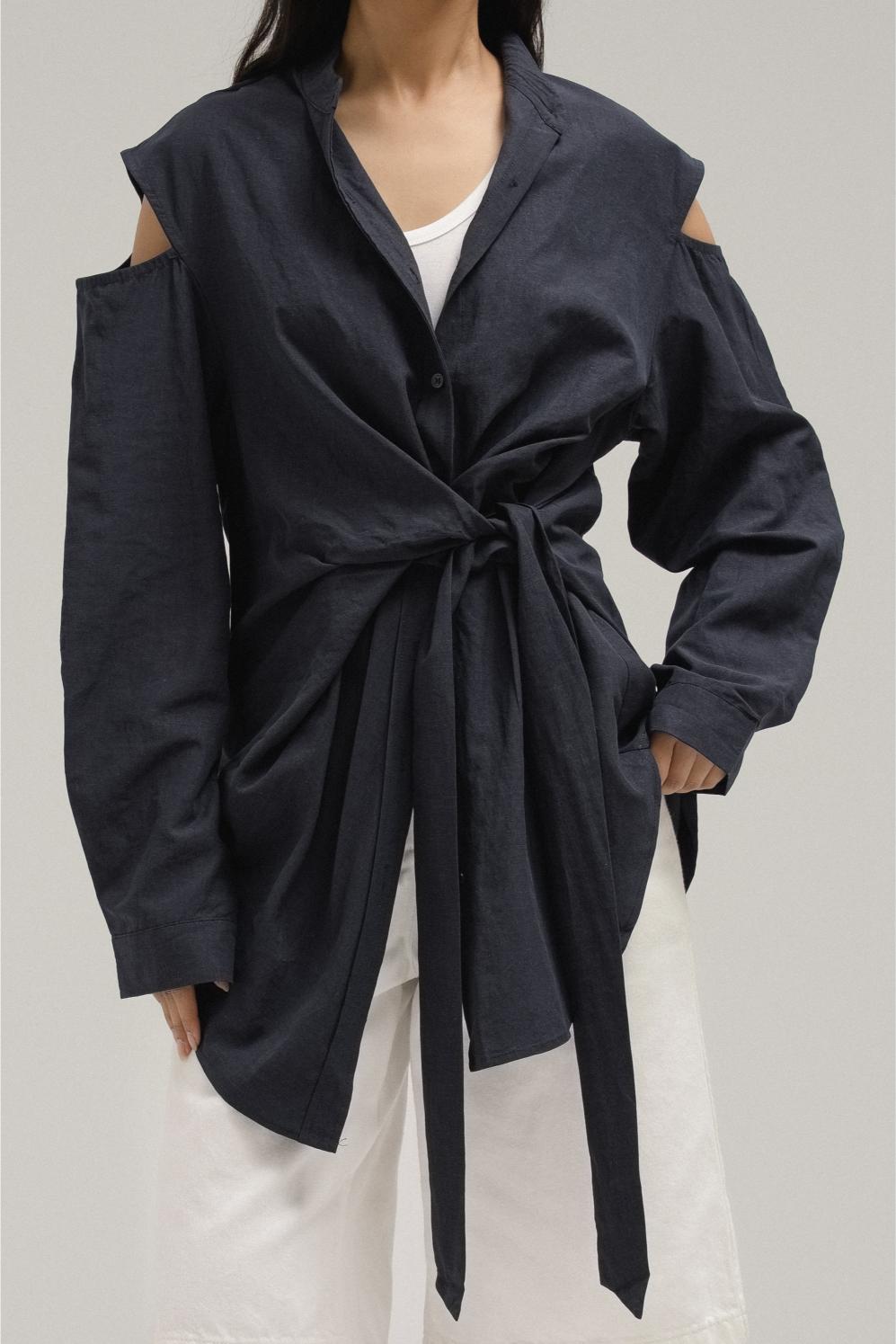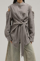 This shirt-style top stands out with its modern cut-out shoulder design and elegant wrap detail at the front. With a button closure and soft flowy fabric, it combines structure and fluidity, creating a statement piece that’s both chic and fashion-forward.