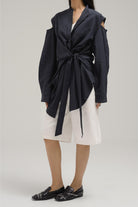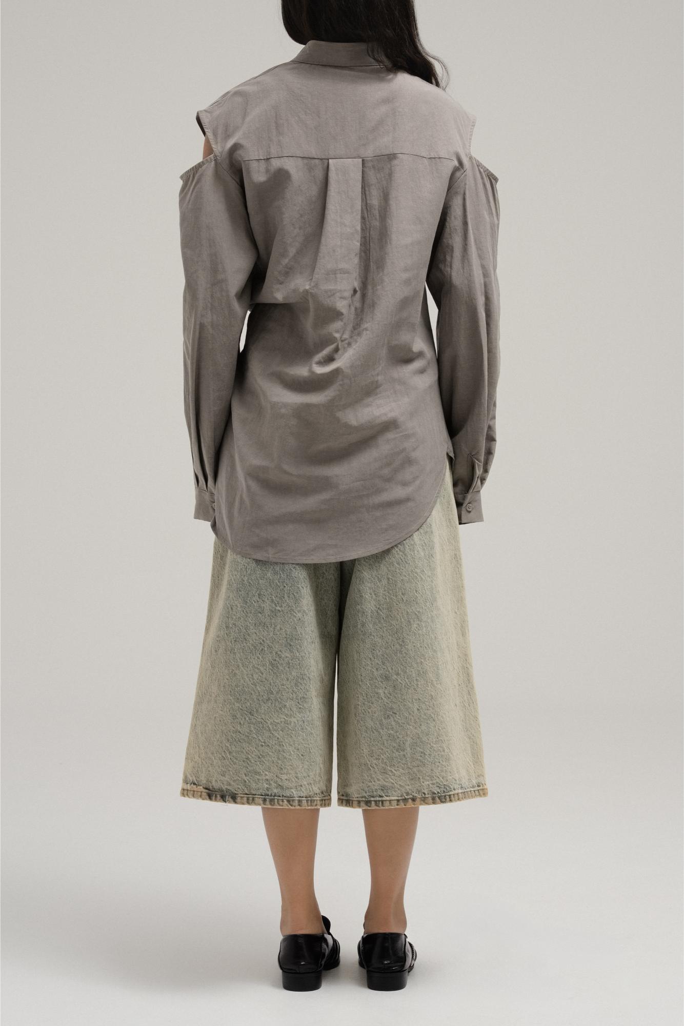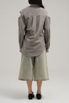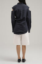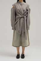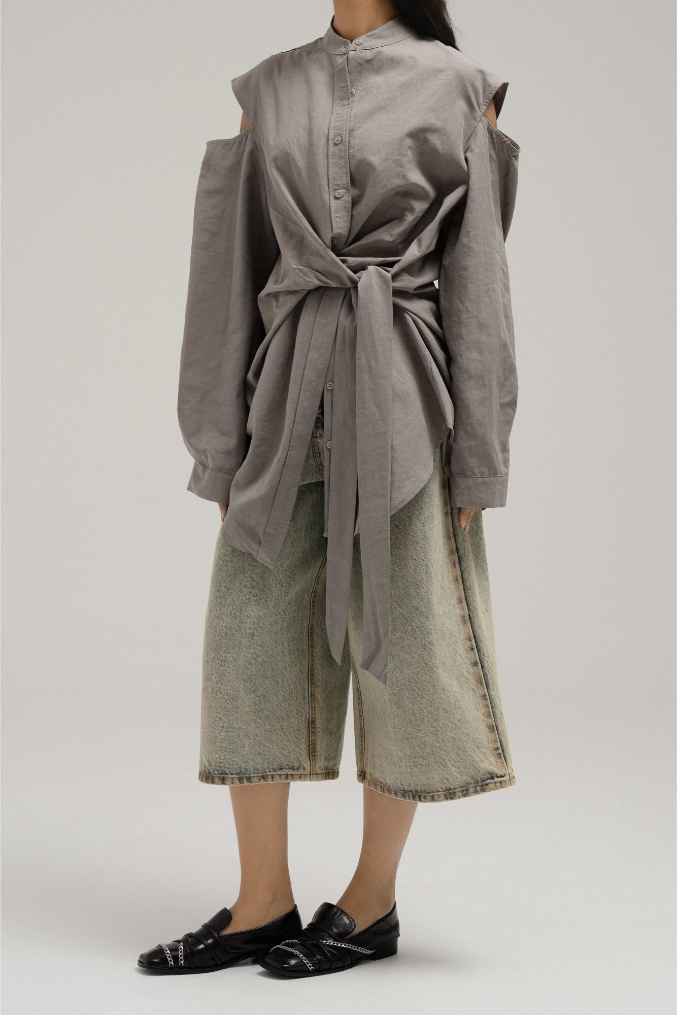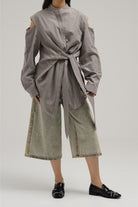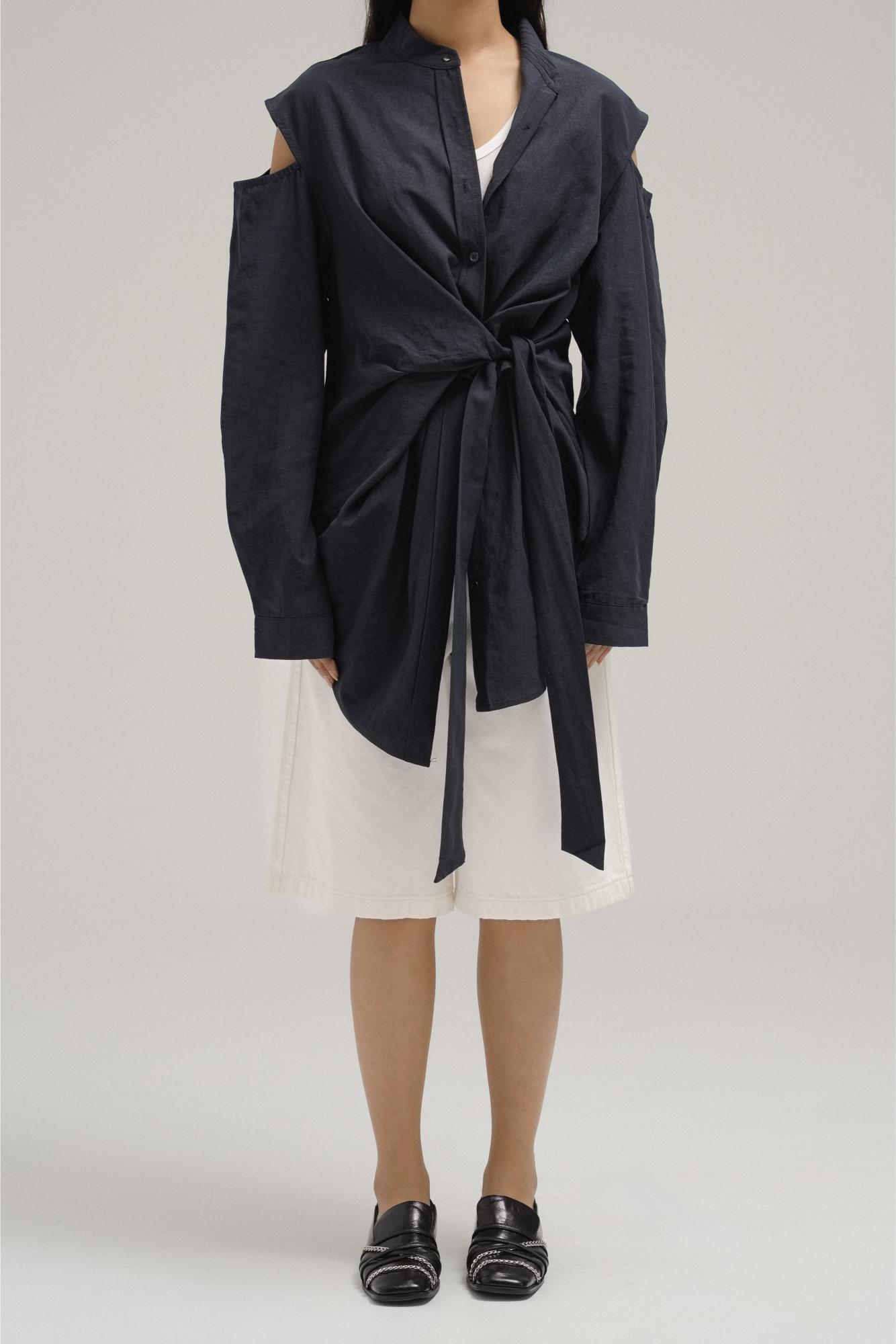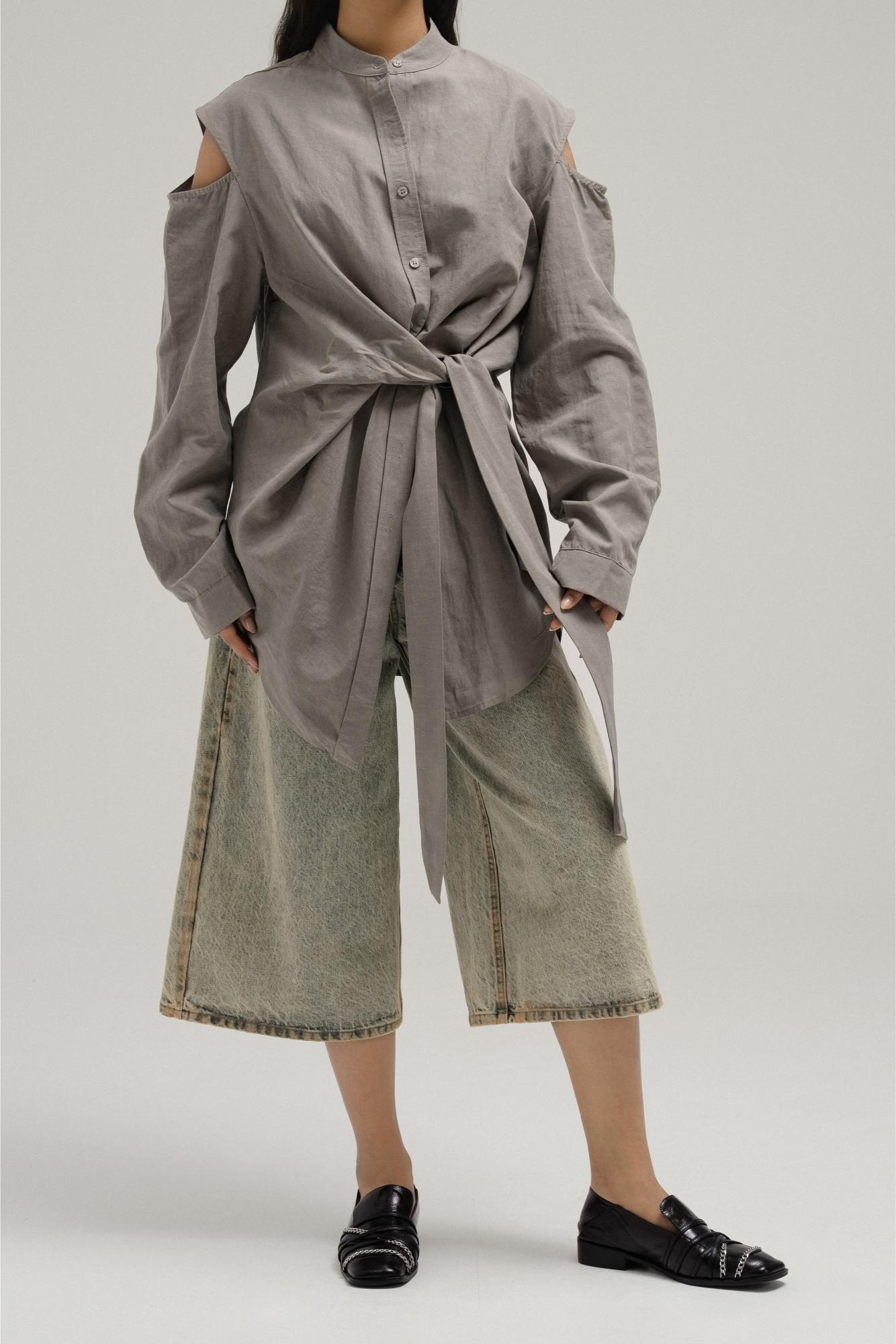 This shirt-style top stands out with its modern cut-out shoulder design and elegant wrap detail at the front. With a button closure and soft flowy fabric, it combines structure and fluidity, creating a statement piece that’s both chic and fashion-forward.