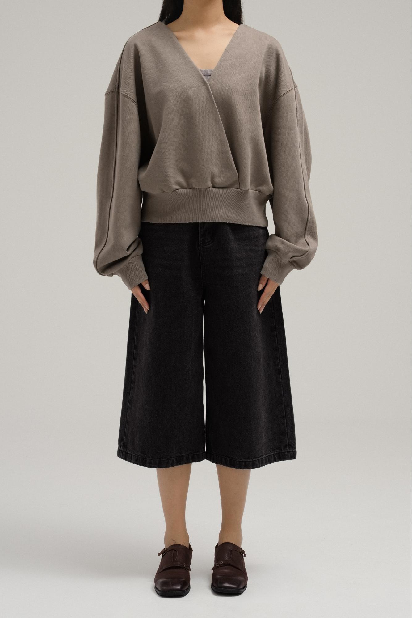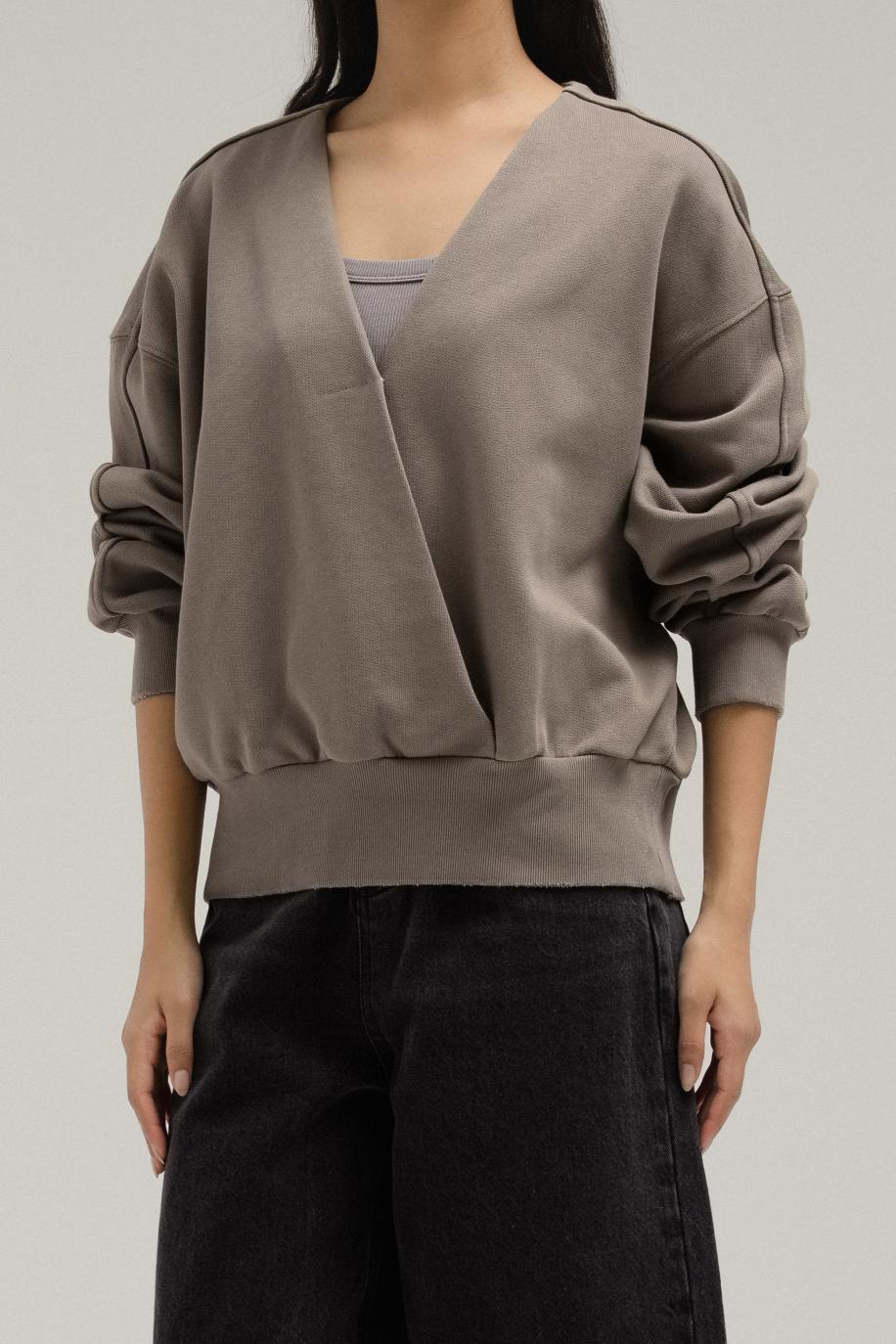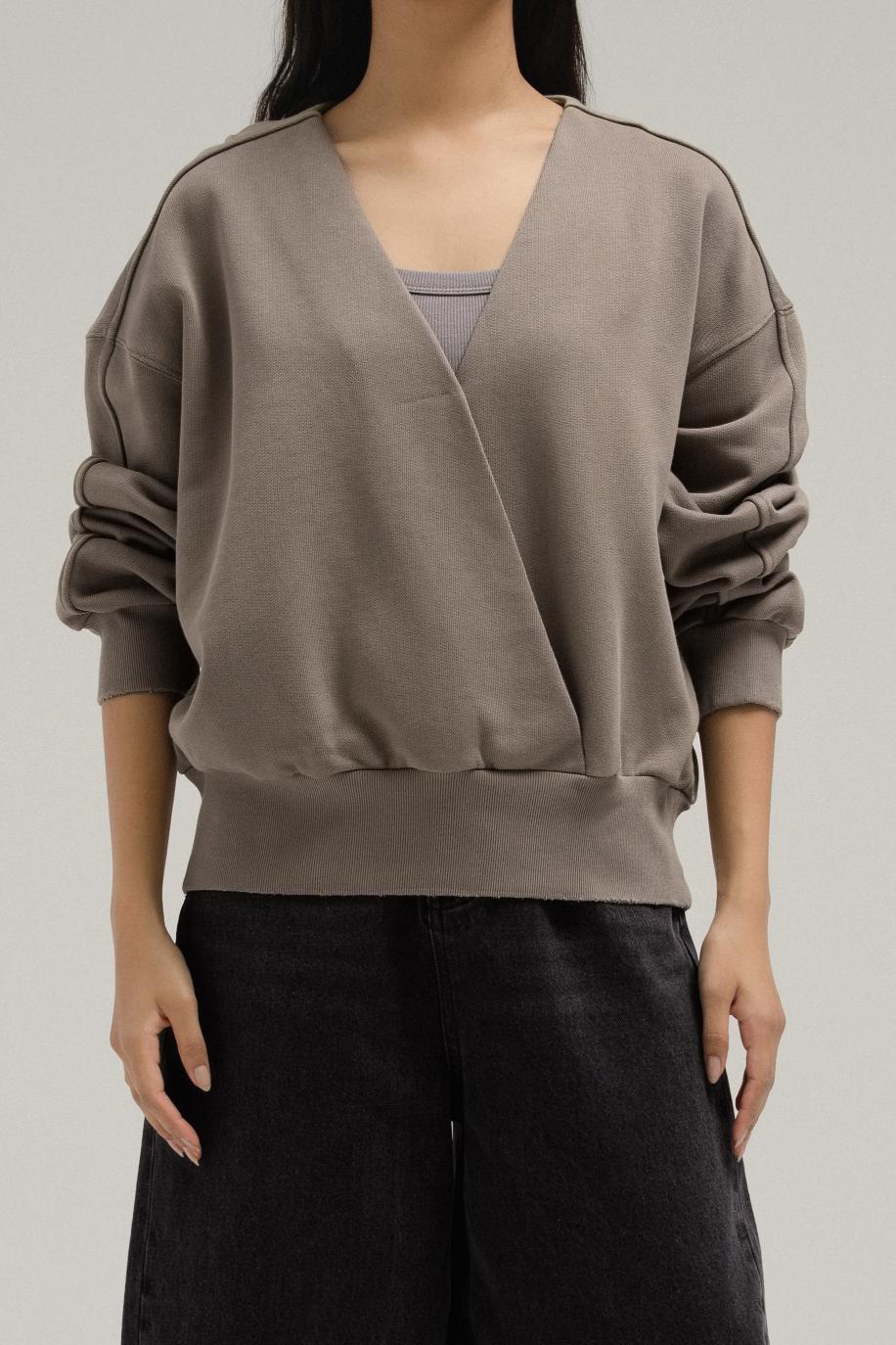 This sweater top is crafted from a soft, cozy knit with a modern wrap-style front. Designed with a deep V-neckline, it features a subtle clip closure that secures the overlap, creating a clean and minimal look. The hem and cuffs are ribbed, adding structure to the relaxed fit. Effortlessly chic, it’s a versatile piece that balances comfort and style.