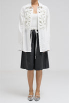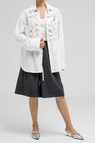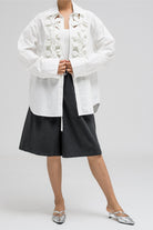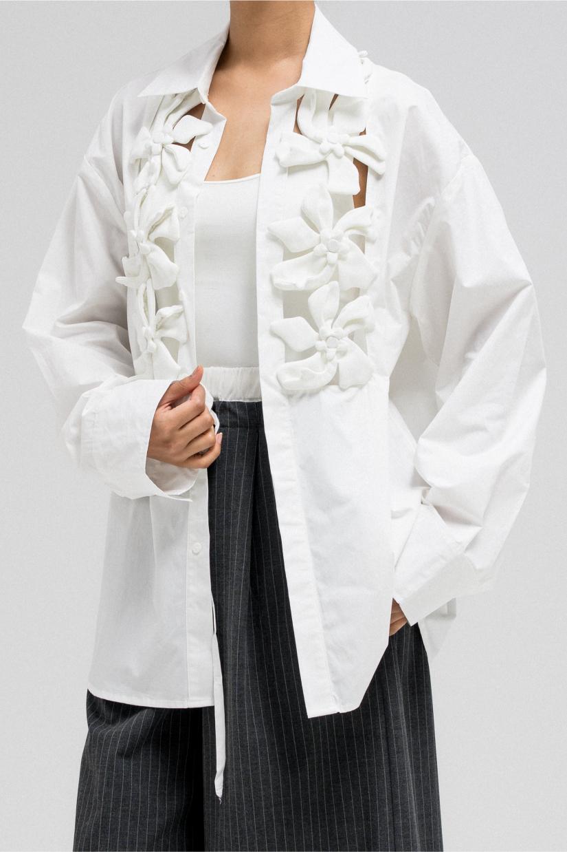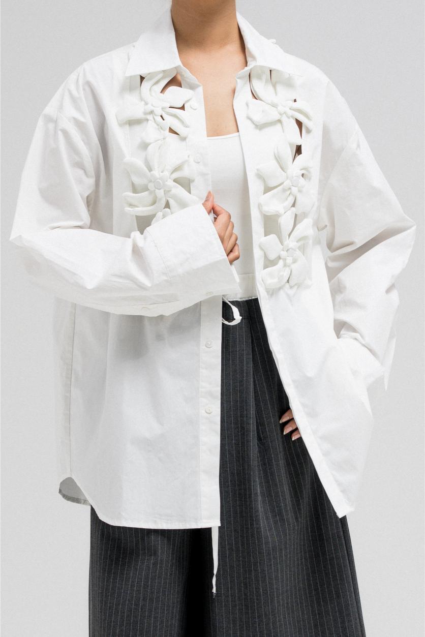 This unique shirt-style top features a classic collar and front button closure. The standout detail lies in the front it shows a cut-out 3D floral designs that create a dimensional effect.