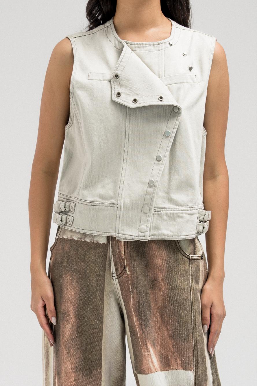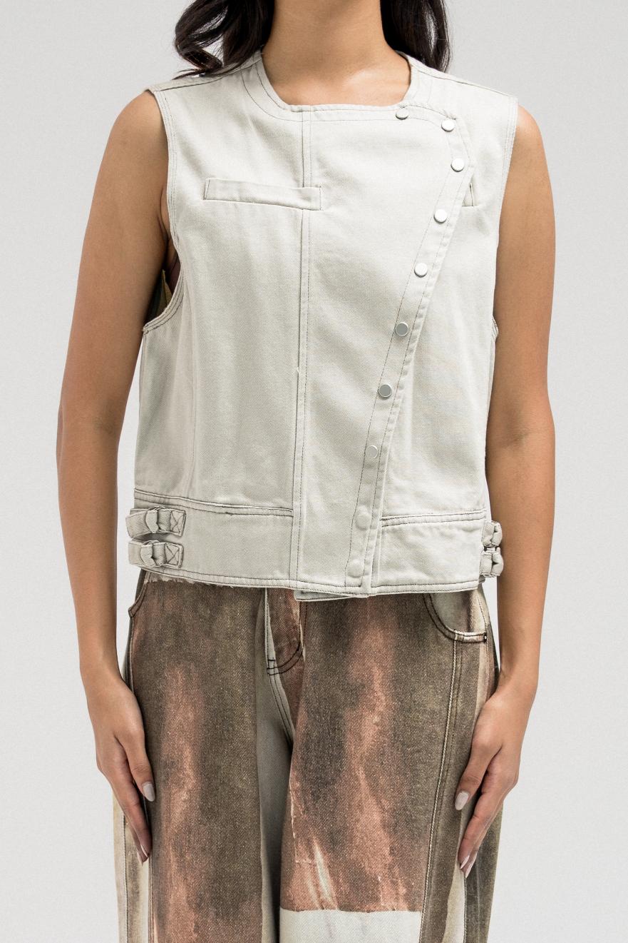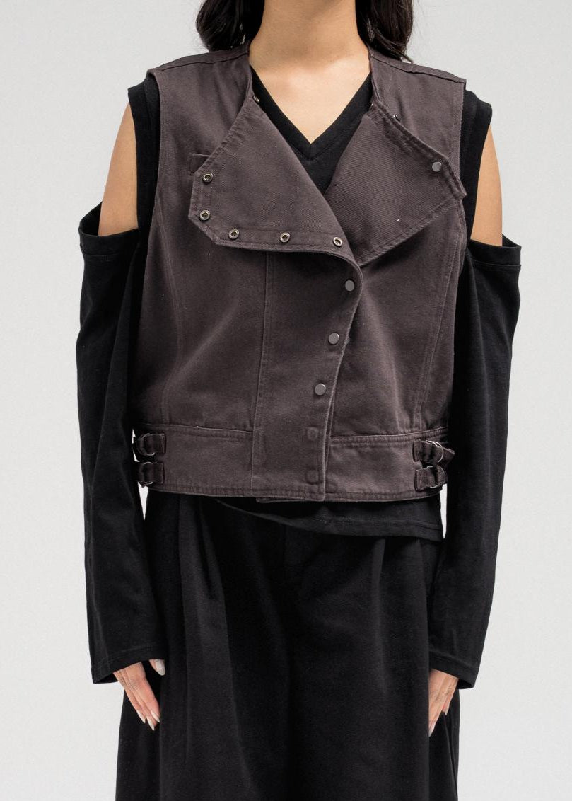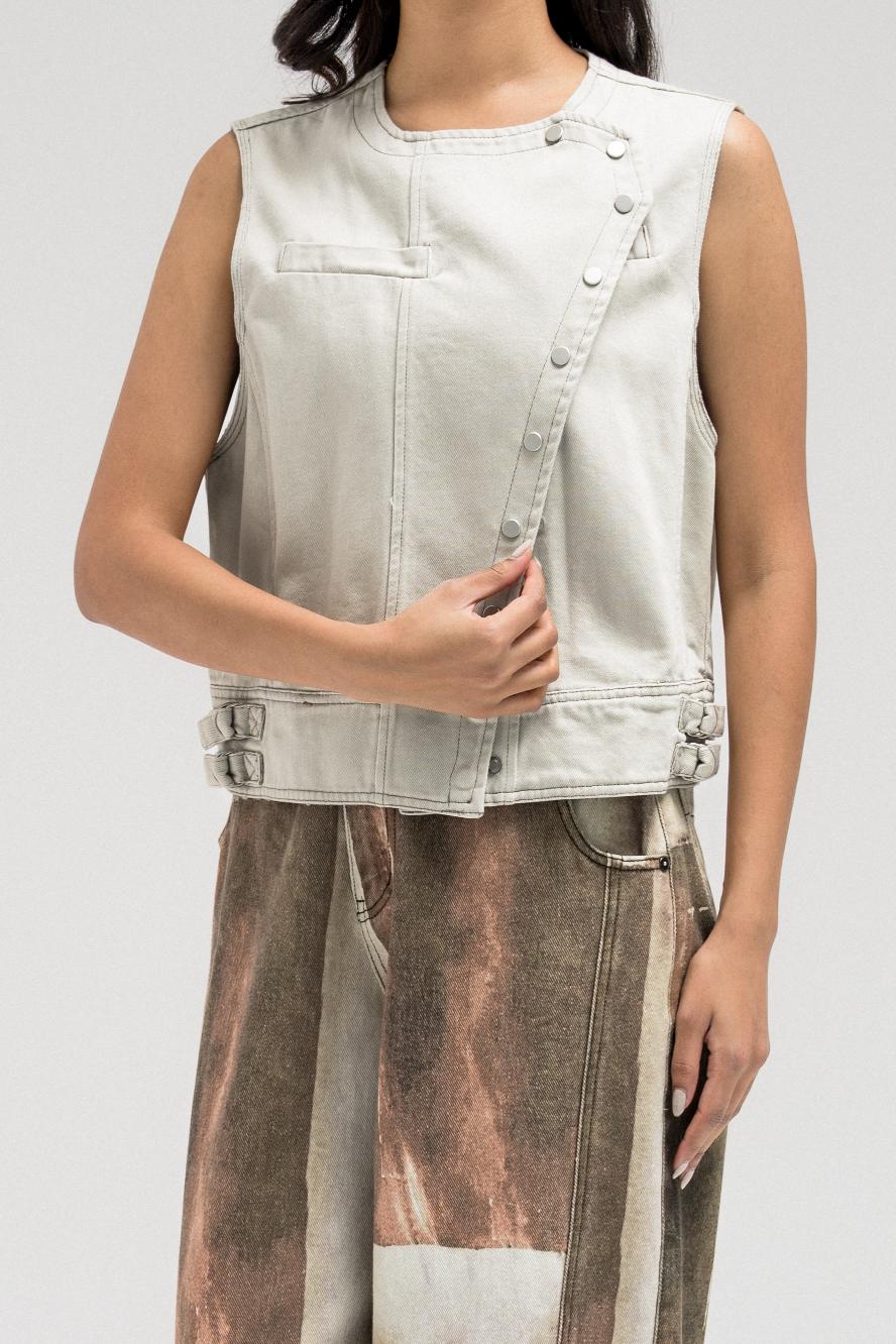 Sleeveless vest designed with an asymmetrical front panel and snap-button closure. Features adjustable side tabs for a customizable fit.